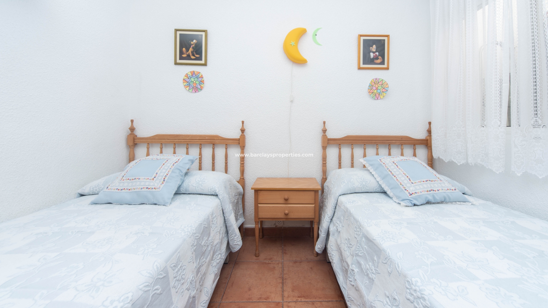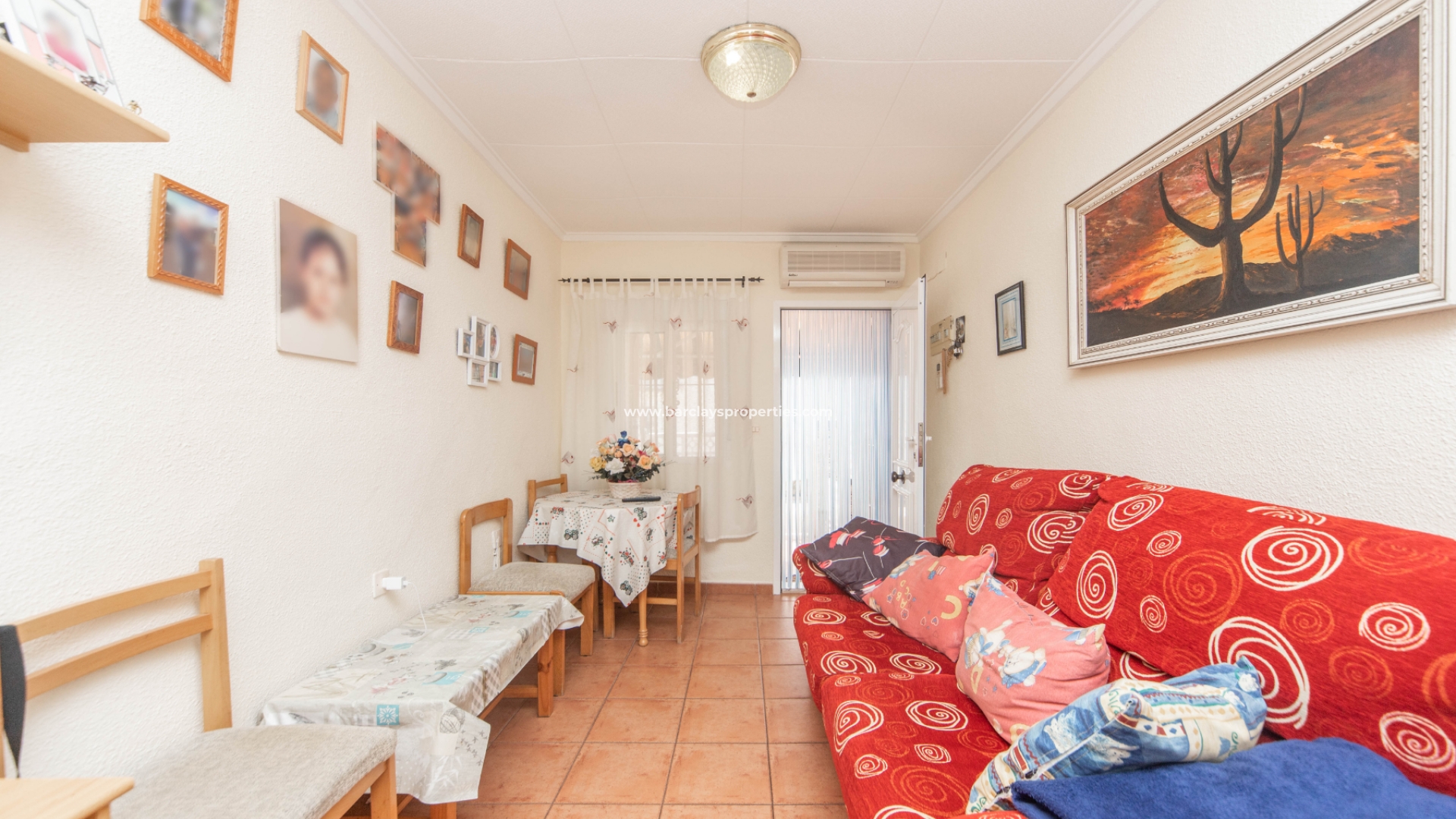 Dieser nach Westen ausgerichtete Bungalow mit pflegeleichter Oberfläche bietet einen gepflasterten Vorgarten mit Terrasse, Essbereich im Freien, Sonnenmarkise und Abstellmöglichkeiten, die in das Innere der Immobilie führen, wo wir ein geräumiges Wohnzimmer mit Klimaanlage, eine unabhängige Küche mit Elektroherd, Abstellraum, Waschmaschine und Zugang zu einer hinteren Terrasse finden. Vom Flur aus finden wir ein Schlafzimmer mit zwei Einzelbetten, ein Schlafzimmer mit Doppelbett und ein Badezimmer mit einer Ecke, Waschtisch und wc.