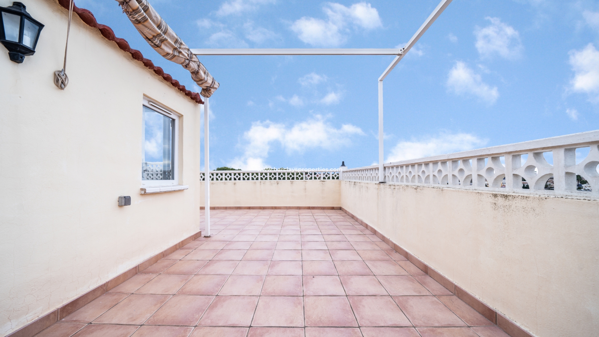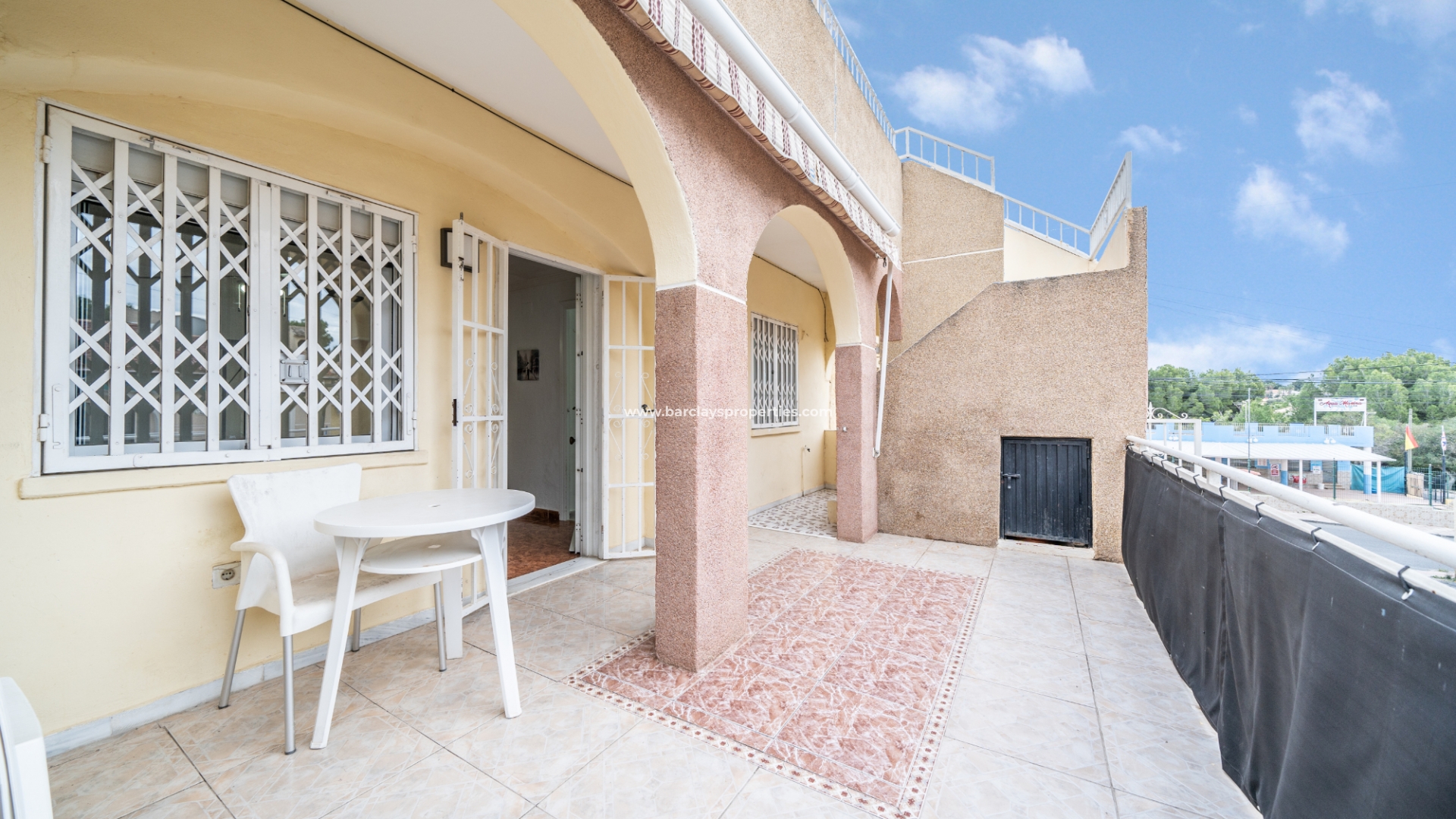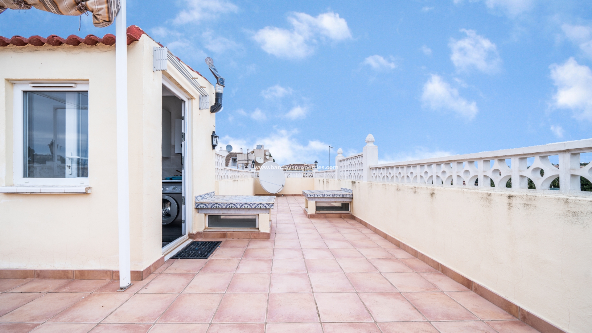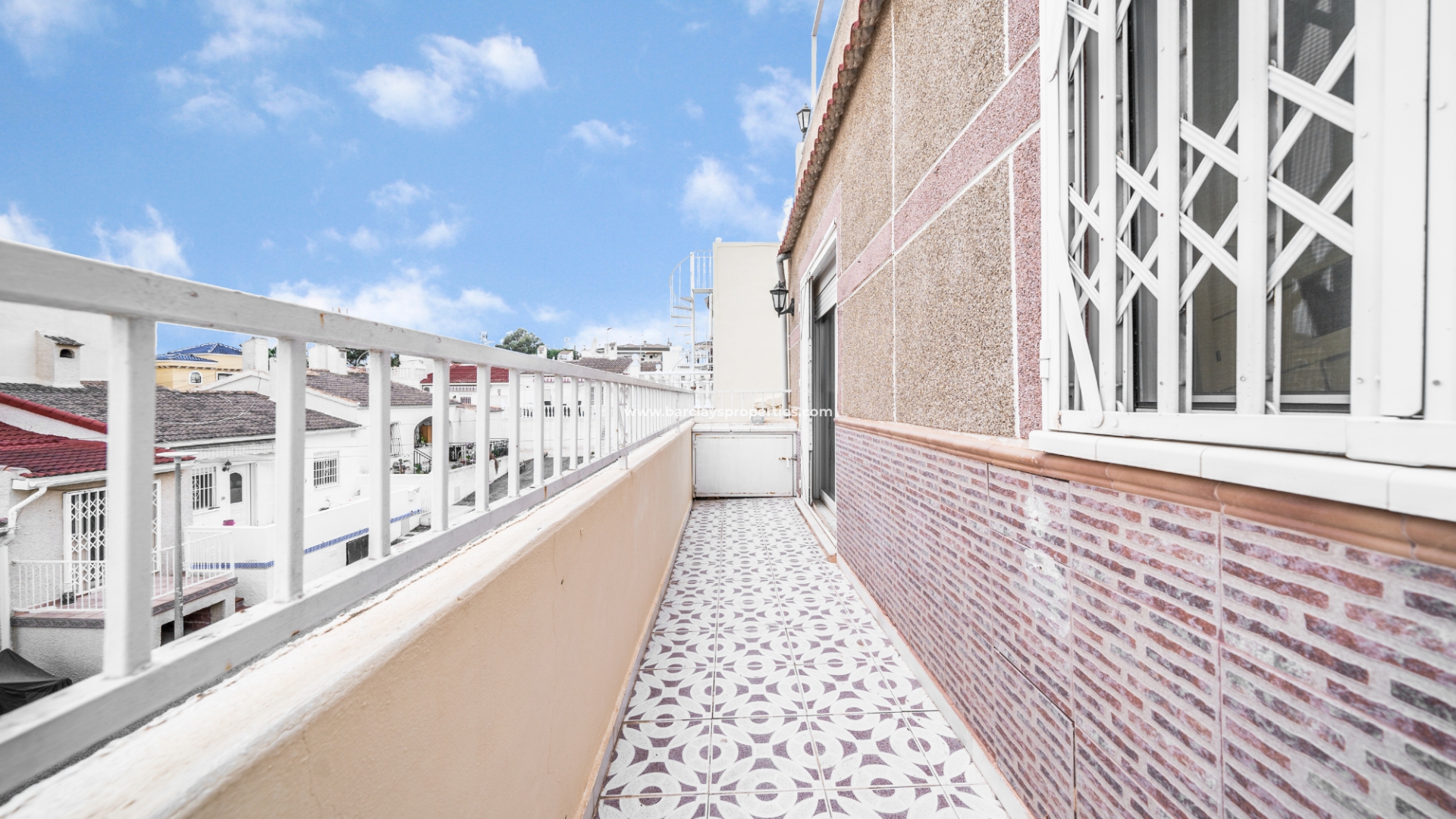 Treppen auf der vorderen Terrasse führen zur oberen Ebene dieses "Rosita", wo sich eine Sonnenterrasse und Zugang zum Inneren der Immobilie durch Schiebetüren befinden, die Zugang zum Wohnzimmer, zur offenen, neu renovierten, modernen Küche, 2 Schlafzimmern und neu renovierten, modernen Badezimmern geben. Eine interne Treppe führt uns zur Dachterrasse mit herrlichem Blick von der Immobilie, einer Pergola für Schatten und einem praktischen Abstellraum.