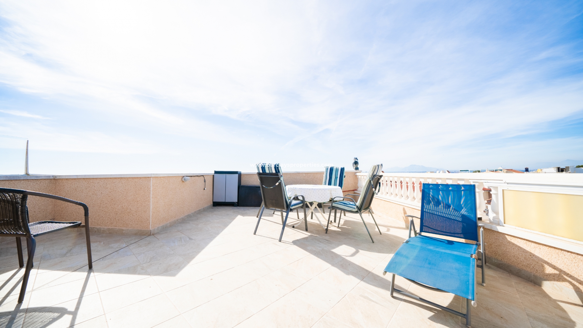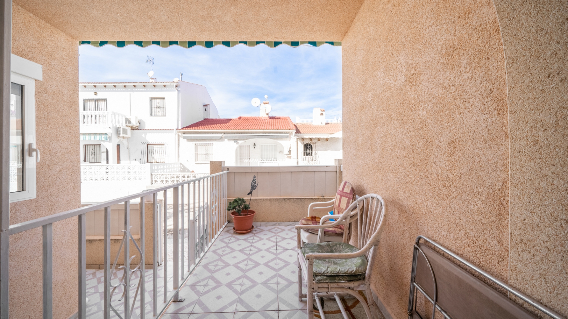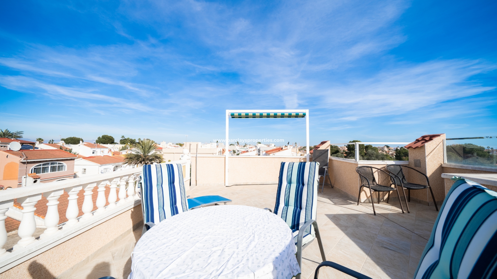 Wir werden sofort von der Vorderterrasse und dem Außenessbereich sowie einer erhöhten oberen Terrasse mit Sitzbereich begrüßt, beide mit Sonnenmarkisen für Komfort an sonnigen Tagen an der Costa Blanca.