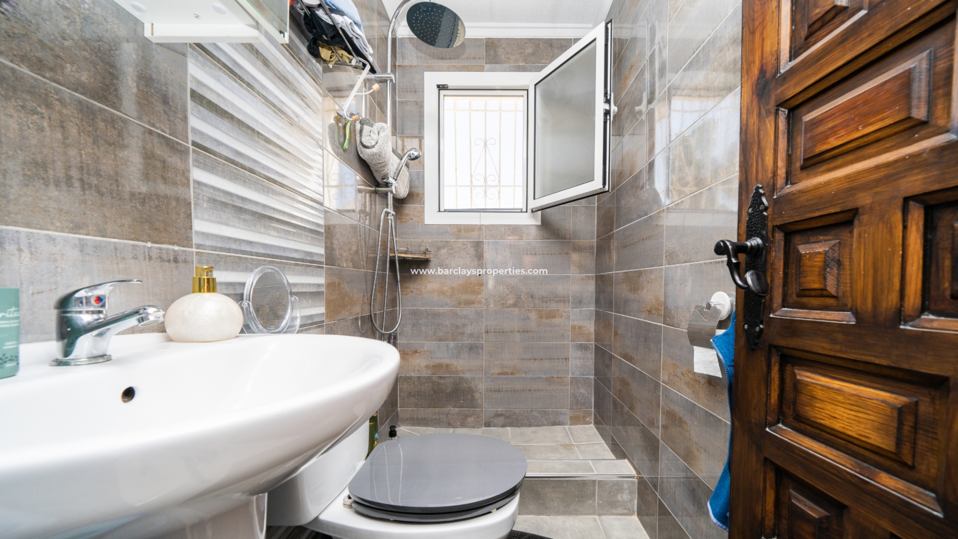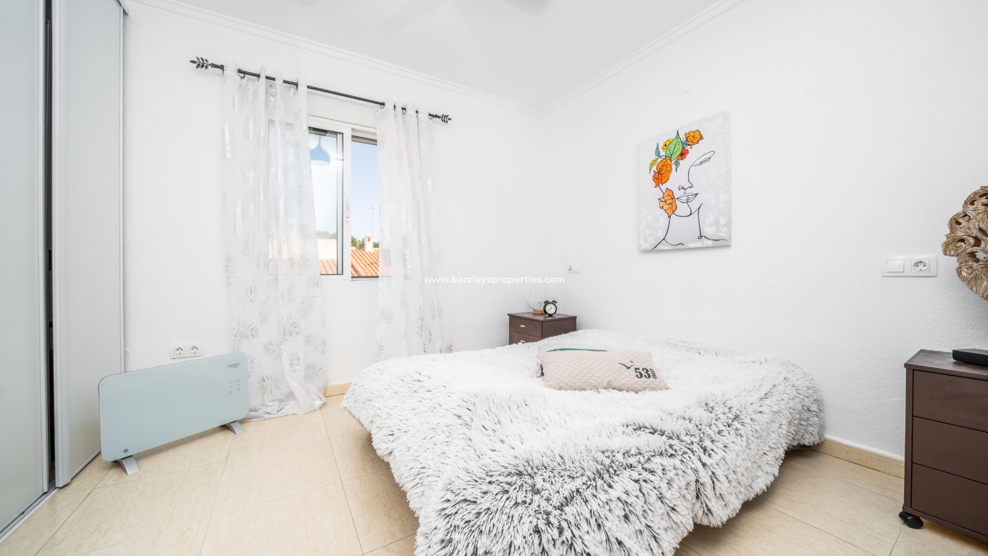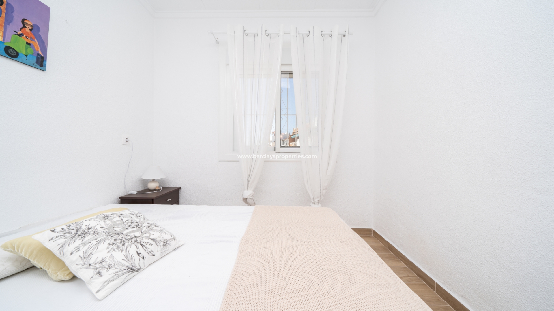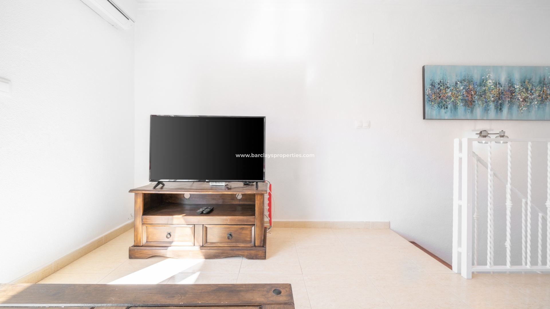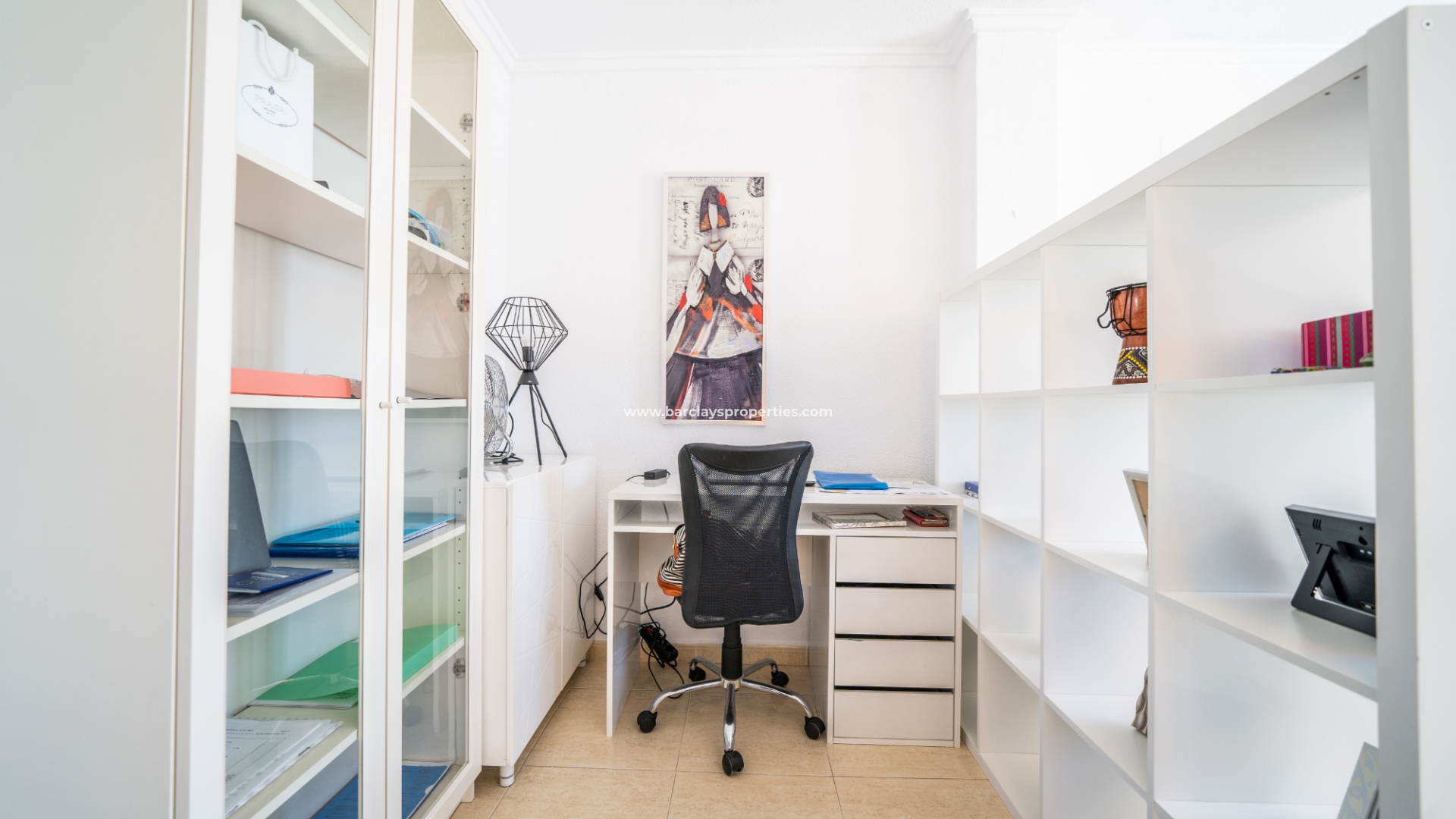 Im Obergeschoss erwartet Sie ein geräumiges und helles Wohnzimmer, komplett mit eigener Klimaanlage. Große Schiebetüren führen zu einem ➡️ sonnigen Balkon mit Südausrichtung, der einen entzückenden Ort zum Sonnenbaden oder zum Genießen von Mahlzeiten im Freien bietet. Zusätzlich gibt es auf dieser Ebene einen separaten Bürobereich, der perfekt für diejenigen ist, die remote arbeiten oder einen ruhigen Raum zum Konzentrieren benötigen. Das zweite Schlafzimmer, ebenfalls ein Doppelzimmer, befindet sich auf dieser Etage und ist mit Einbauschränken für ausreichend Stauraum ausgestattet. Ein Deckenventilator sorgt für eine angenehme Nachtruhe, auch während der wärmsten Sommernächte.