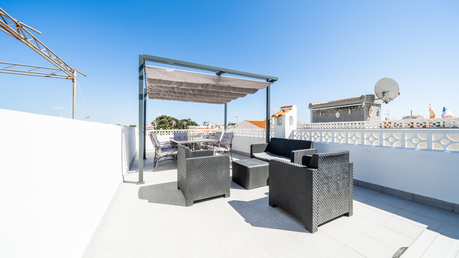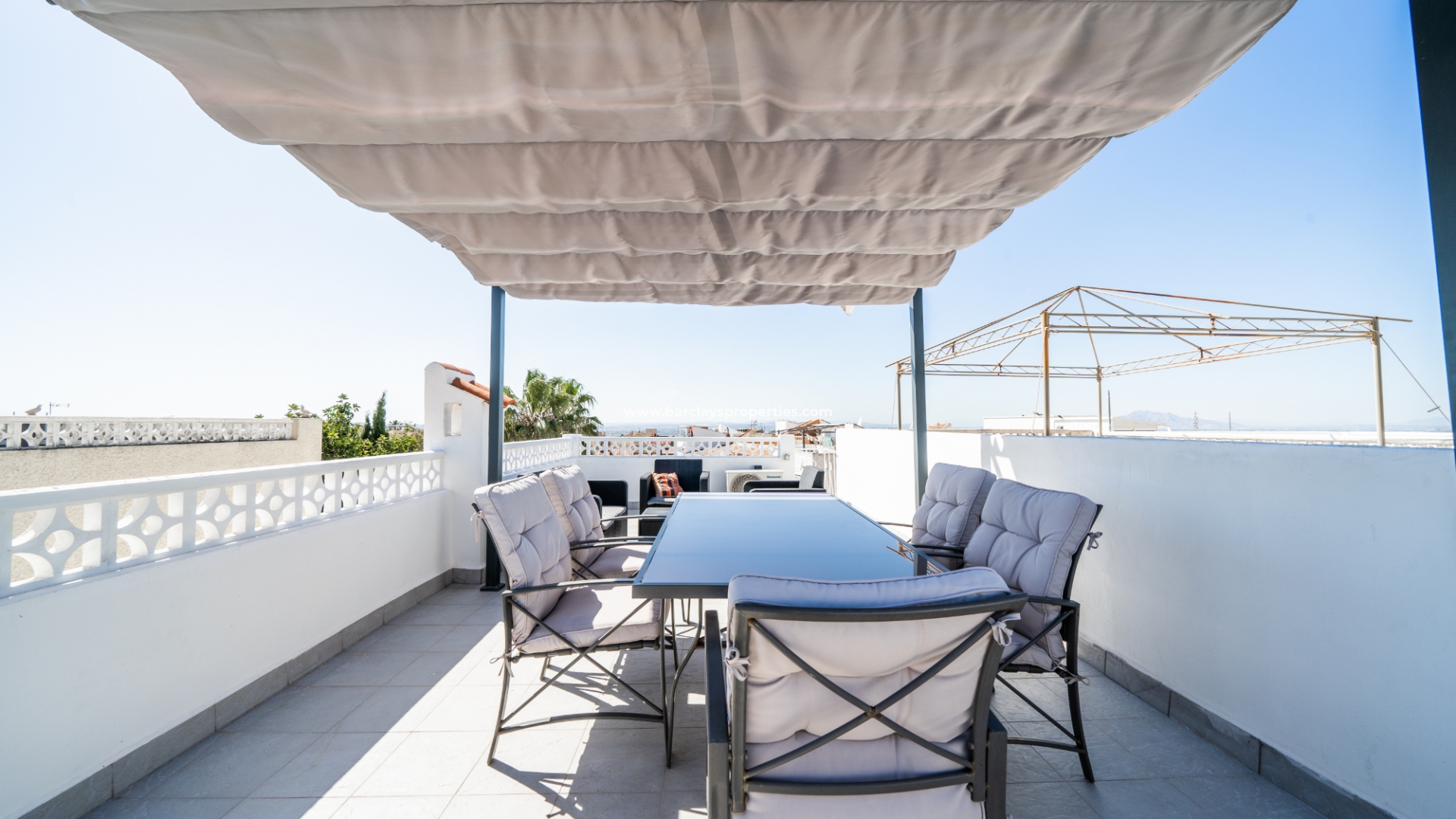 Beim Betreten des Anwesens werden Sie von einer geräumigen und einladenden Terrasse begrüßt, die sich perfekt zum Entspannen oder Unterhalten von Gästen eignet. Die Terrasse ist mit Schiebetüren verbunden, die zum Inneren des Anwesens führen, sowie mit einem praktischen Sonnenrollo, ideal zum Genießen des warmen mediterranen Klimas mit Komfort und Stil.