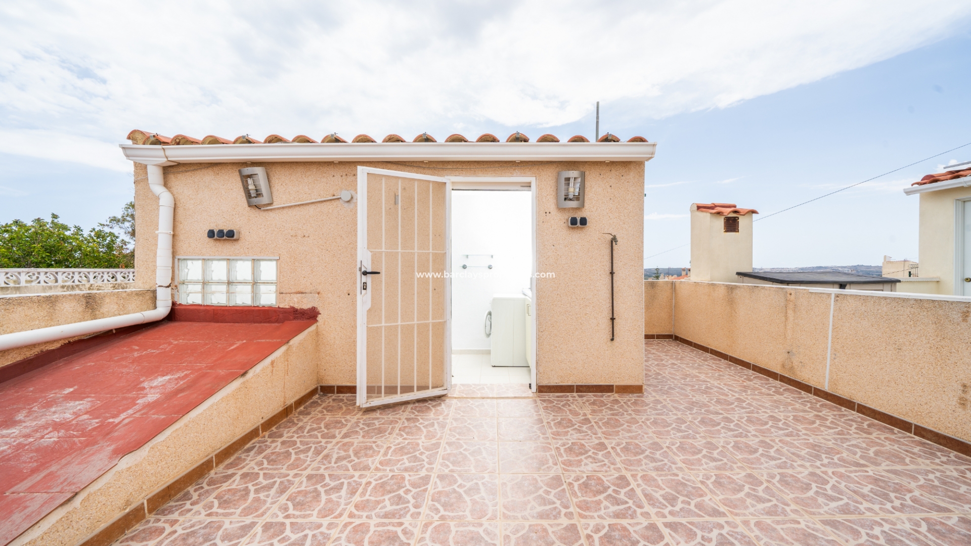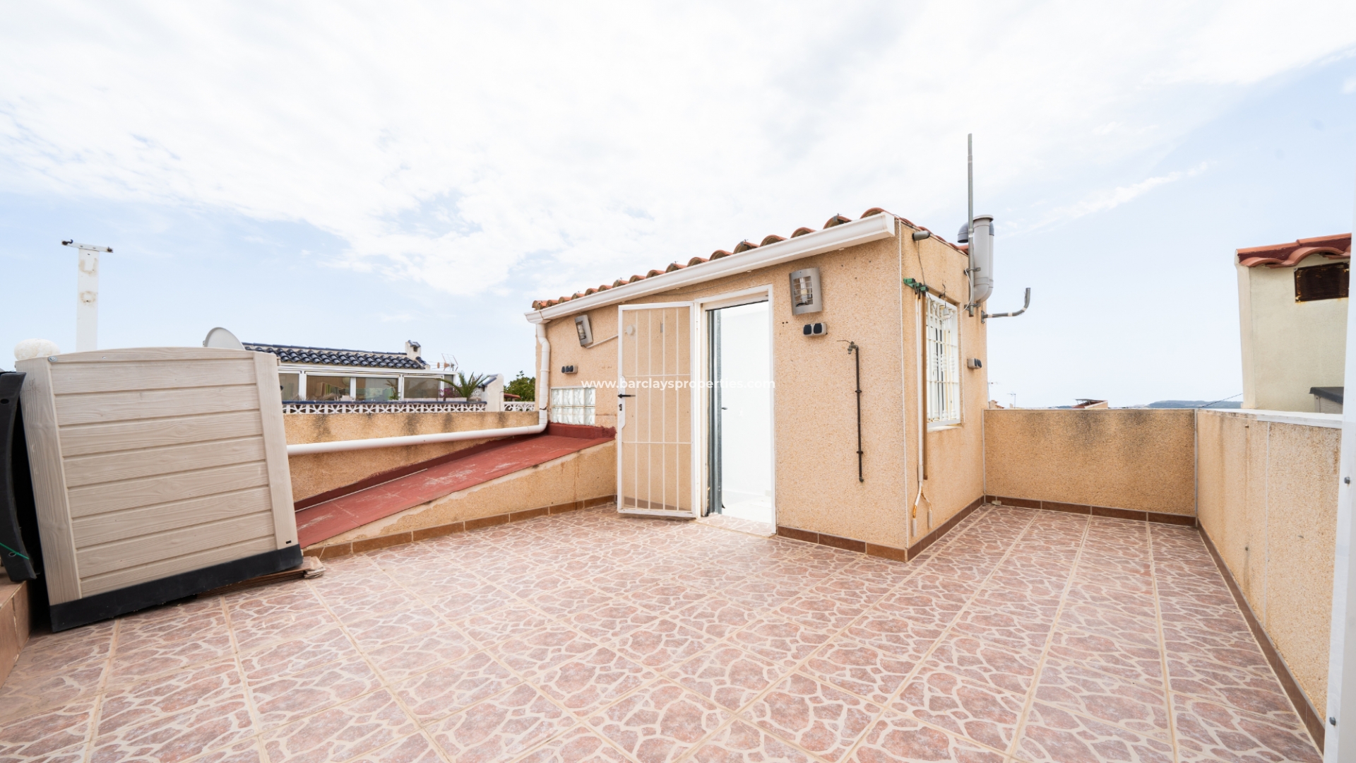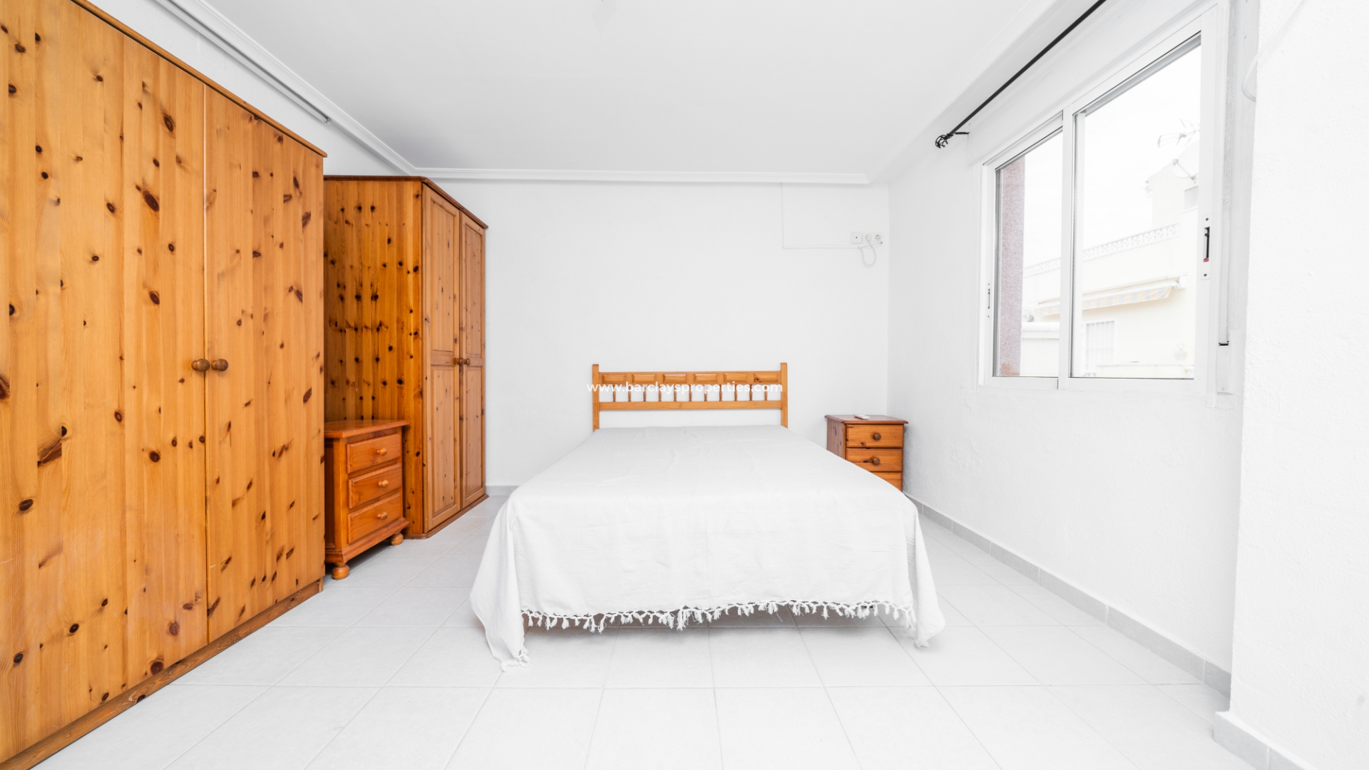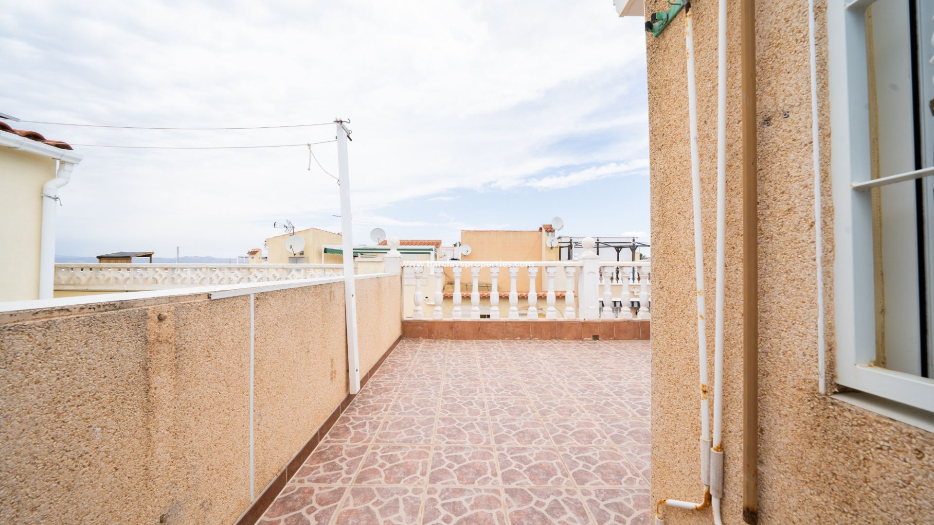 Wir betreten dieses Reihenmittelhaus durch die geräumige und helle verglaste Veranda, die Zugang zu einem großen und offenen Wohn-/Esszimmer mit einer voll ausgestatteten Küche im amerikanischen Stil bietet. Eine Treppe führt uns in das erweiterte Obergeschoss, wo wir ein voll ausgestattetes Badezimmer mit einer Wand-zu-Wand-Dusche und ein extra großes Schlafzimmer mit zwei großen Fenstern und Klimaanlage finden. Von hier aus gelangt man über eine Innentreppe auf die Dachterrasse, wo sich ein Hauswirtschaftsraum mit Waschmaschine und Spülbecken befindet, bevor man nach draußen geht und den ✅Blick auf die Berge und das Meer genießen kann. Es ist der perfekte Ort, um sich in Ruhe zu entspannen, entweder beim Sonnenbaden oder beim Essen im Freien.
