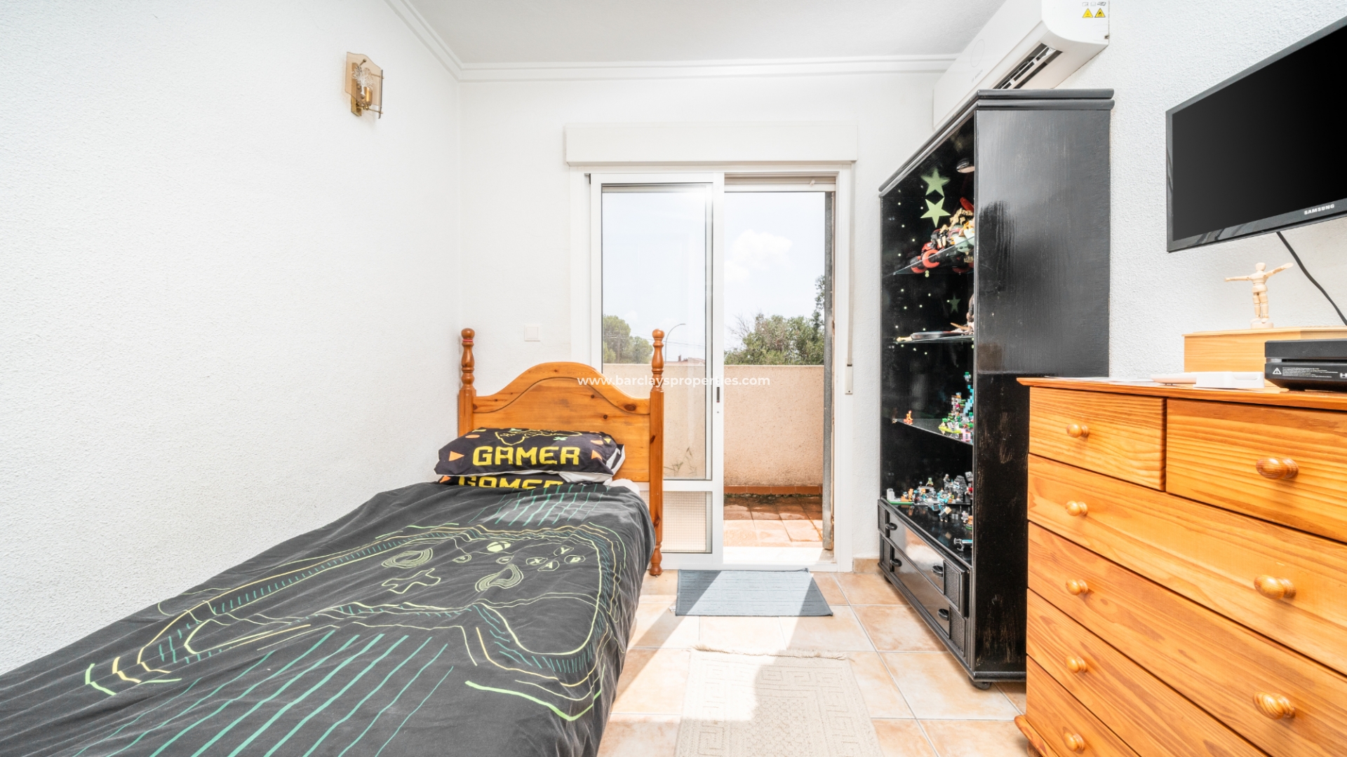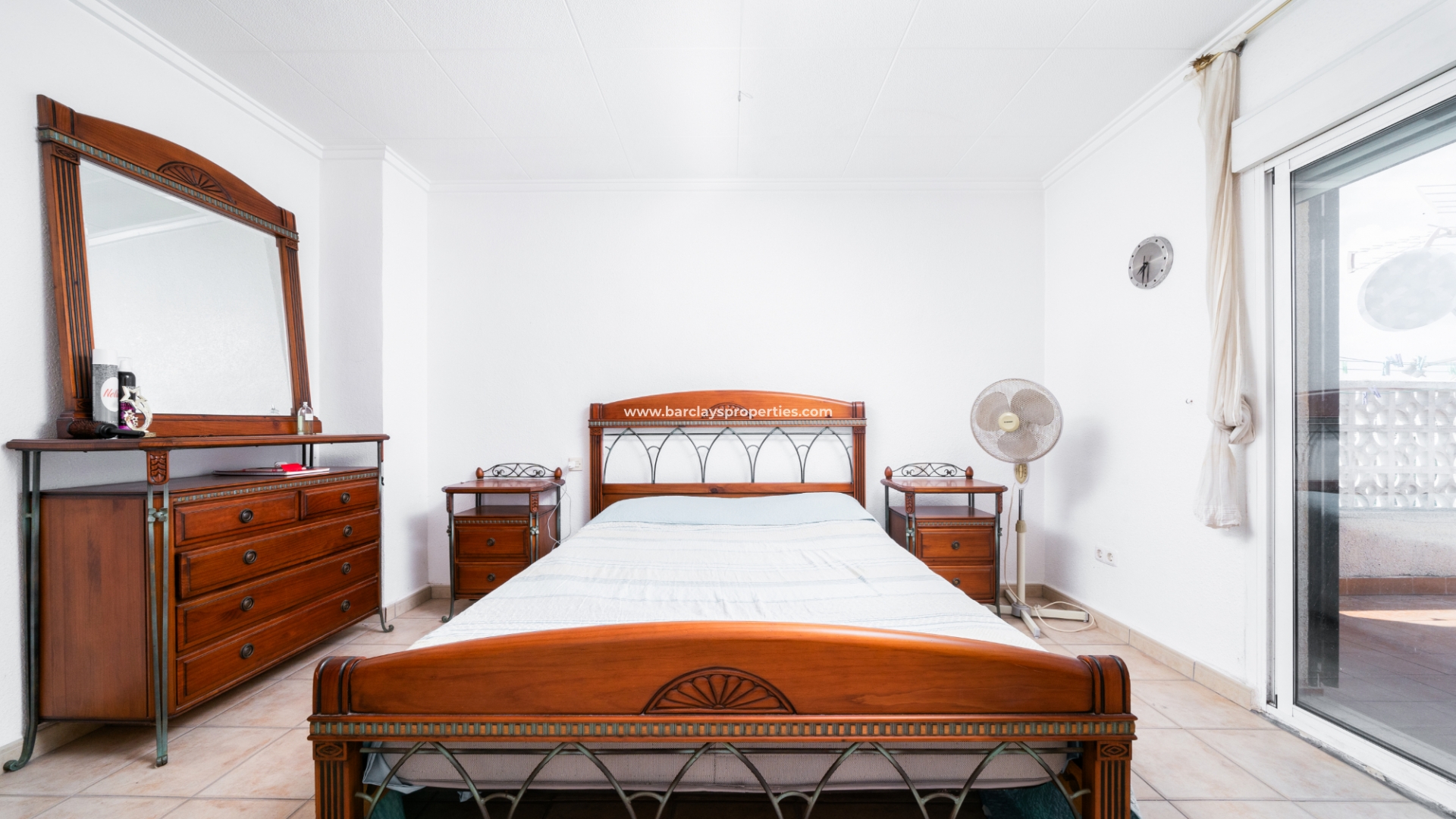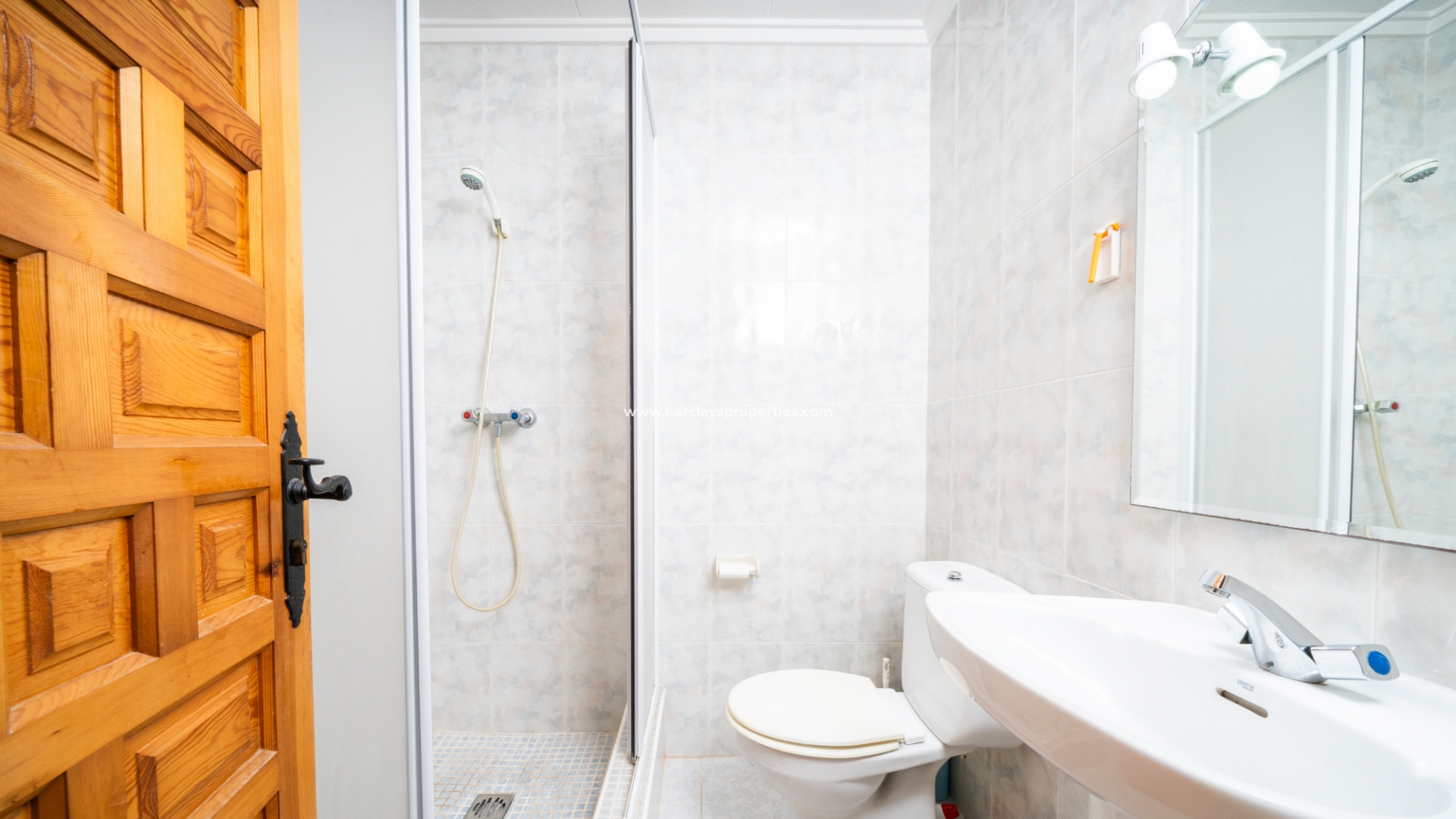 Eine interne Treppe führt Sie in den ersten Stock, wo das große Hauptschlafzimmer auf einen privaten Balkon mit Blick über die Urbanisation öffnet. Auf dieser Ebene befinden sich auch zwei weitere Doppelzimmer (eines mit privater Sonnenterrasse) und ein zweites Badezimmer mit einer Eckdusche.
