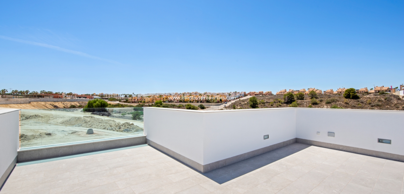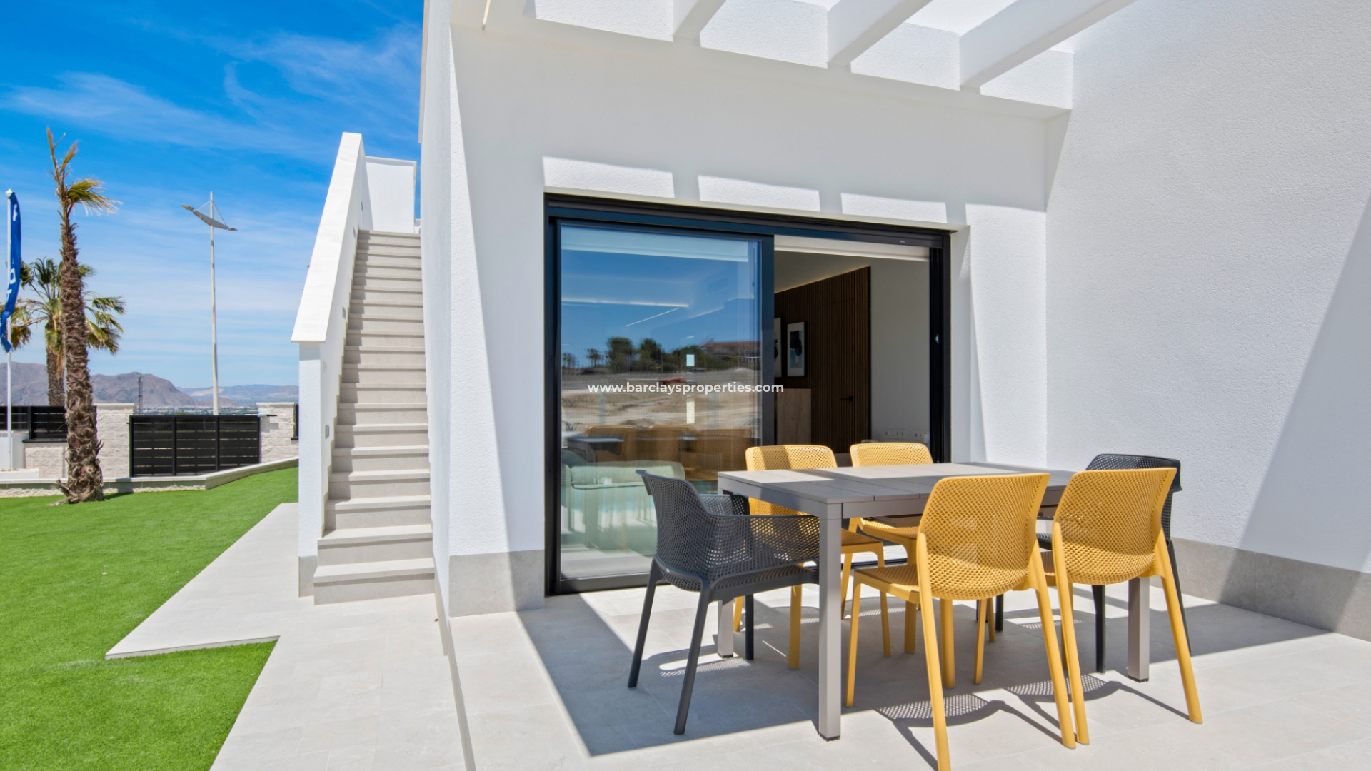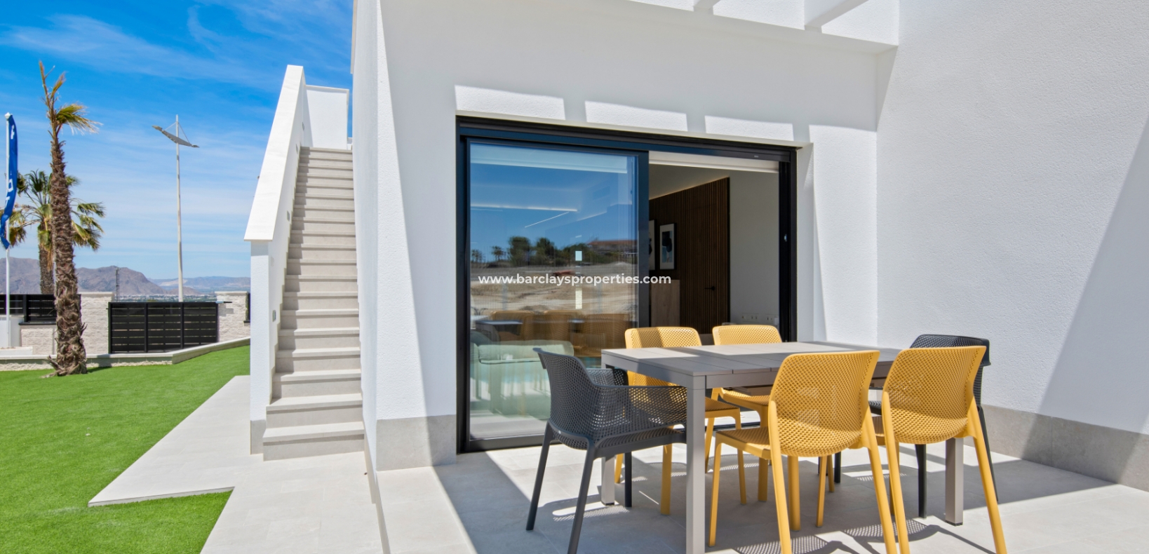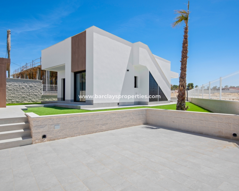 Diese moderne, ➡️ eingeschossige Neubauvilla in La Finca Golf, Algorfa, bietet zeitgemäßes Wohnen in einer ruhigen und dennoch günstigen Lage. Die Immobilie verfügt über 3 geräumige Schlafzimmer, 2 elegante Badezimmer und eine offene Küche auf 104 m² Wohnfläche, die sich auf einem 252 m² großen Grundstück befindet. Der private Garten umfasst einen atemberaubenden Pool, ideal zur Entspannung und für gesellige Zusammenkünfte.