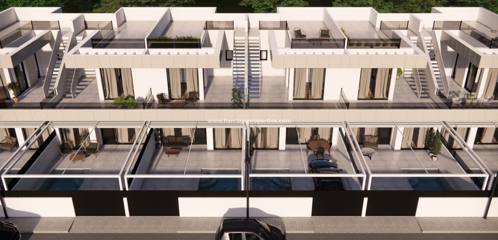Jedes Reihenhaus in diesem beeindruckenden Projekt umfasst einen offenen Wohn- und Essbereich mit Türen, die zu einem großen Garten führen. Hier haben Sie die Möglichkeit, einen privaten Pool hinzuzufügen, der perfekt für Entspannung und Unterhaltung ist. Die moderne Küche ist mit hochwertigen, integrierten Geräten ausgestattet, darunter ein Ofen, ein Induktionskochfeld, ein Dunstabzug, ein Kühlschrank/Gefrierschrank, eine Waschmaschine, ein Geschirrspüler und eine Mikrowelle. Das Hauptschlafzimmer verfügt über einen begehbaren Kleiderschrank und ein Badezimmer en-suite, mit einem zusätzlichen Gästebad im Erdgeschoss.