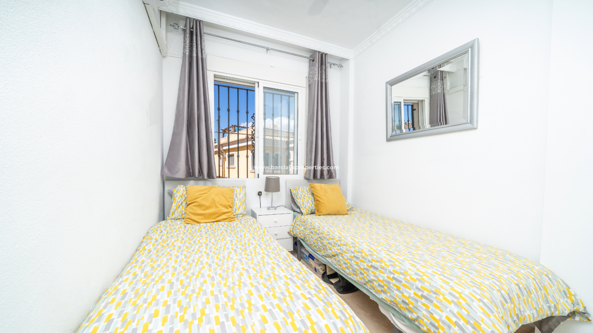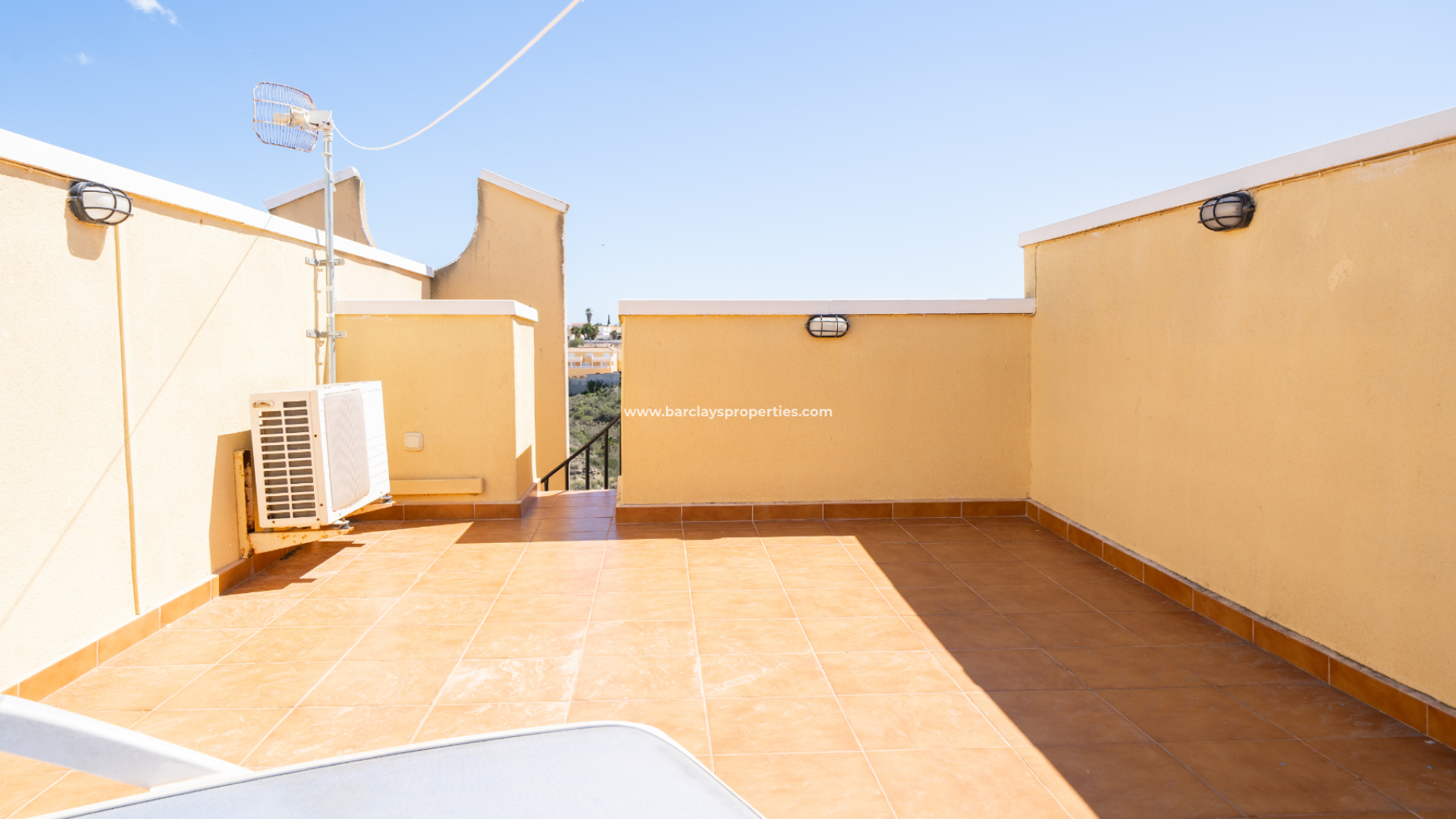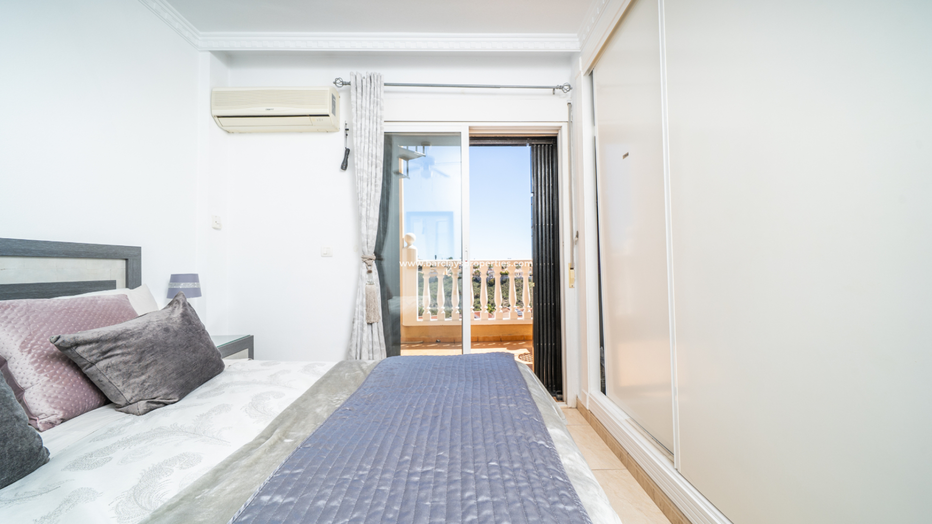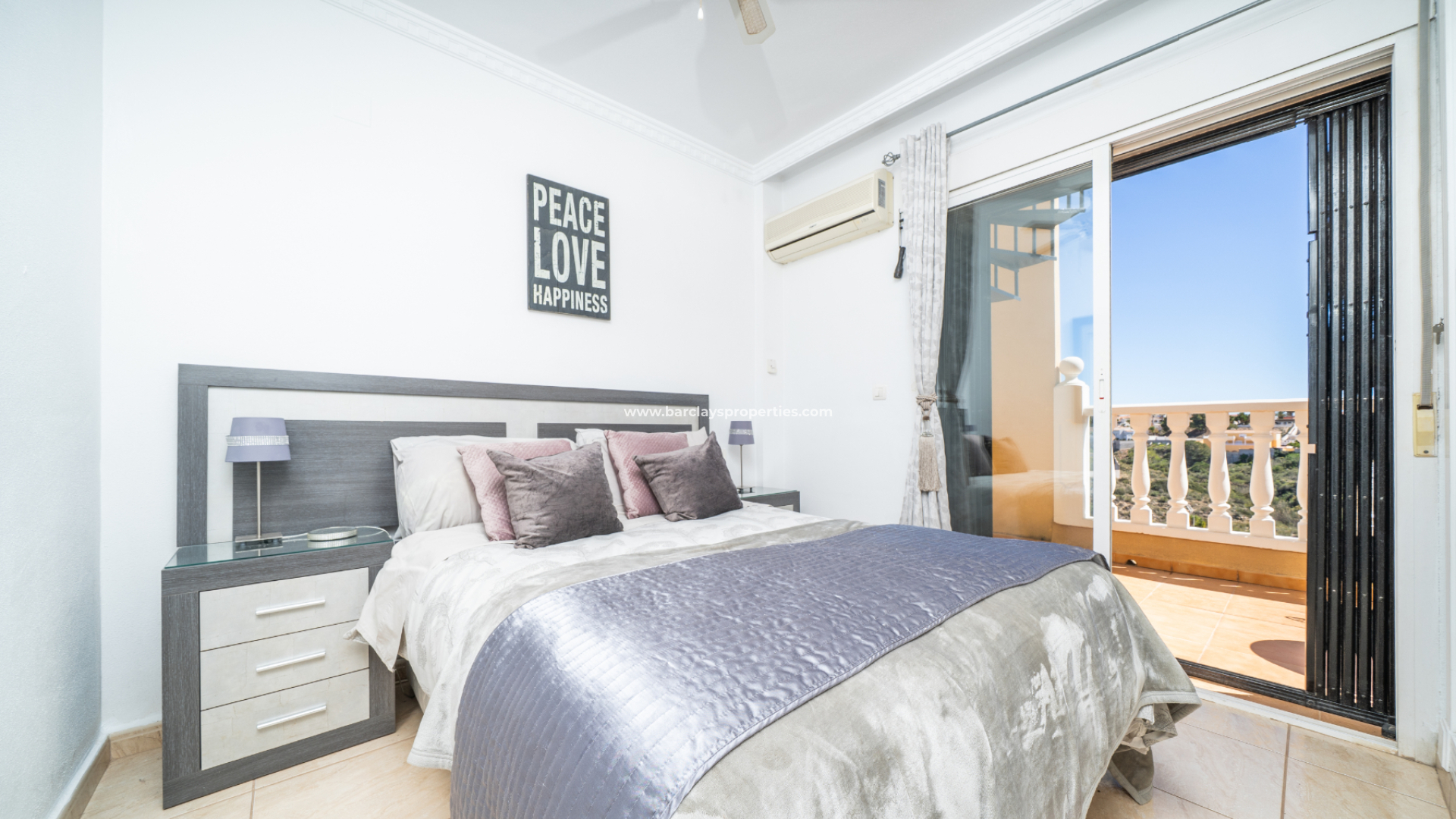 Das zweite Schlafzimmer ist mit Einbauschränken, Klimaanlage und einem Deckenventilator ausgestattet. Das Hauptschlafzimmer bietet dieselben Annehmlichkeiten sowie eine private Sonnenterrasse. Von hier aus führt eine Treppe auf die Dachterrasse, von der aus man einen atemberaubenden Panoramablick über das Meer und die nahegelegene Urbanisation La Escuera genießen kann.