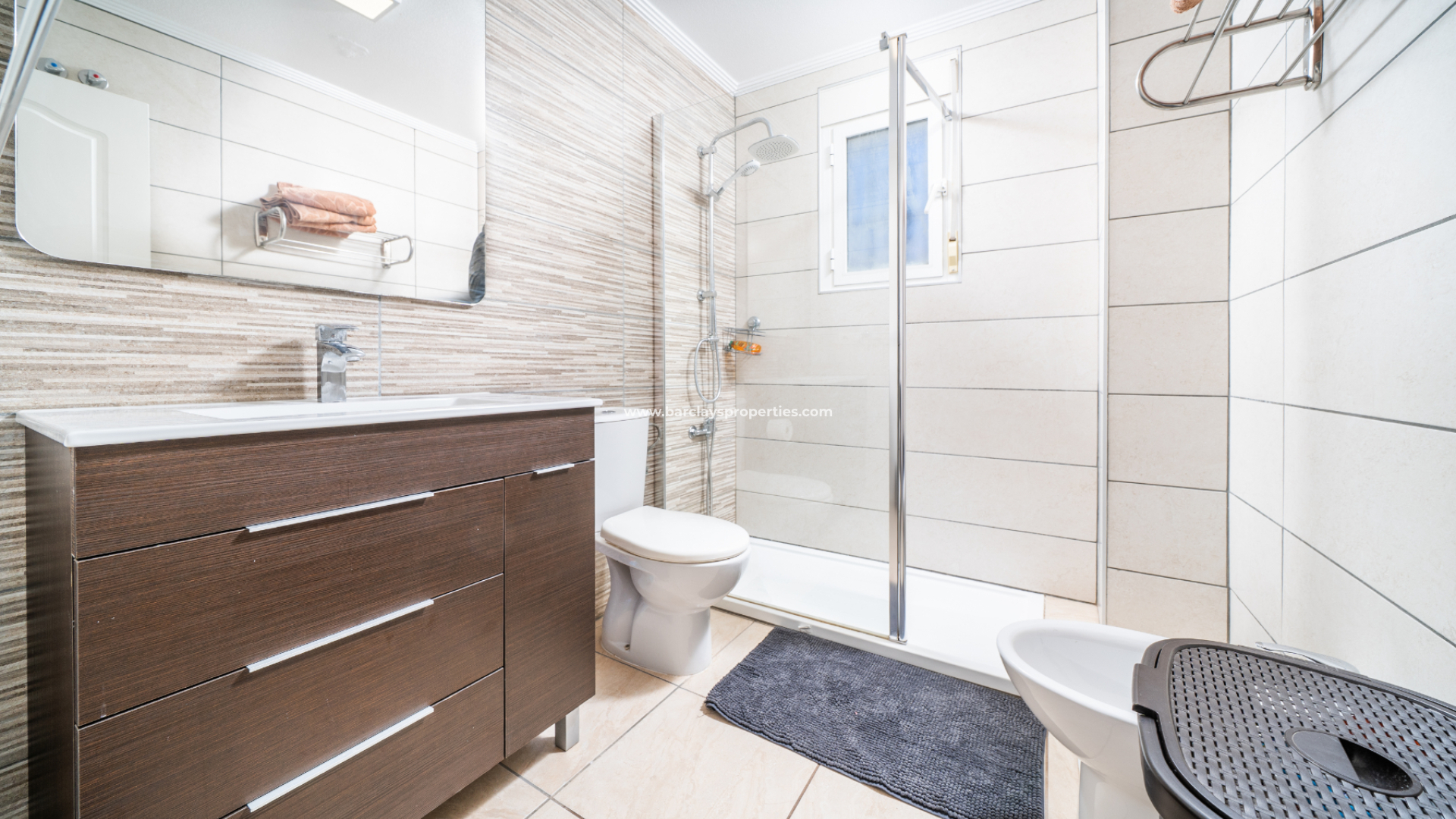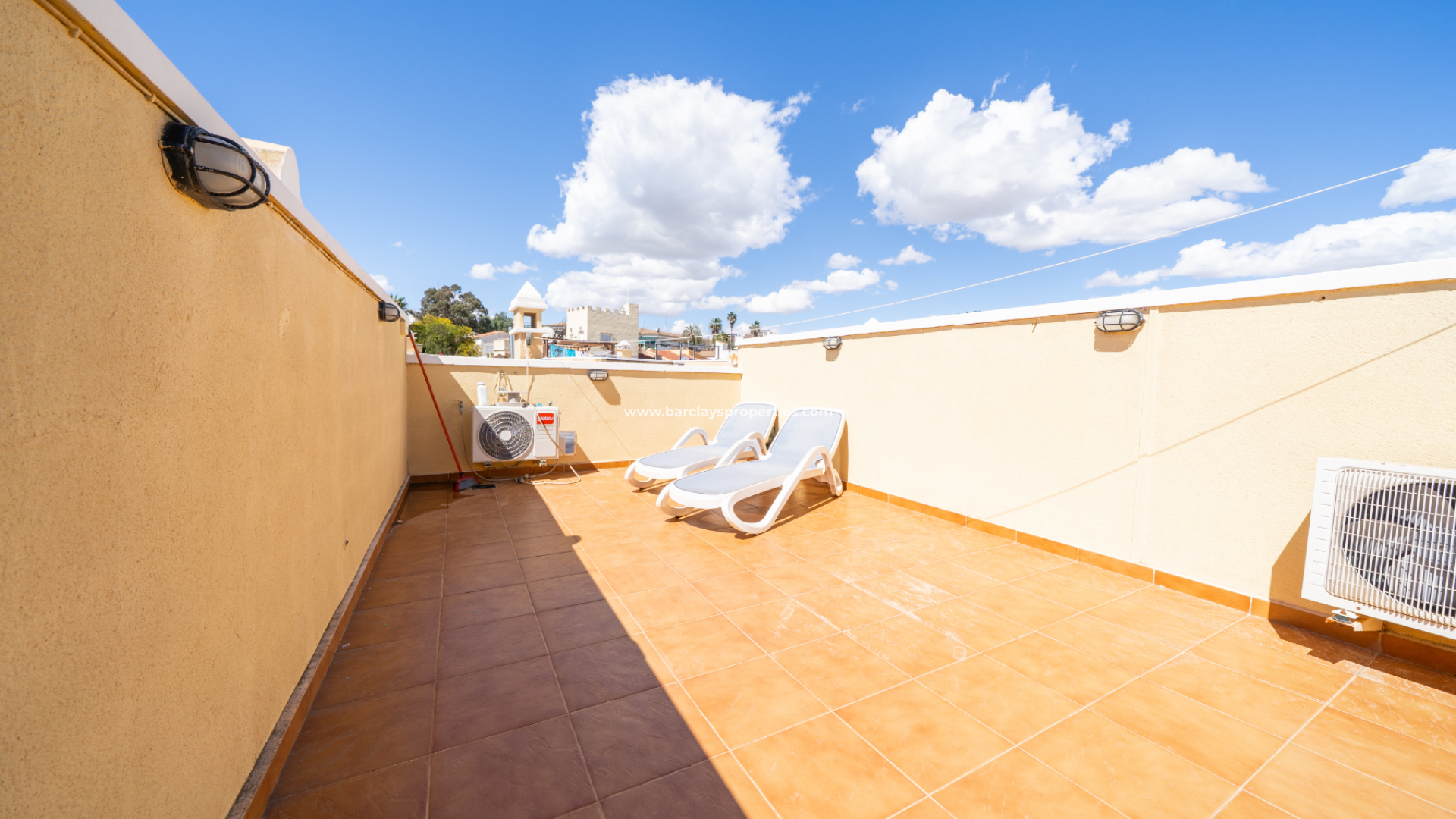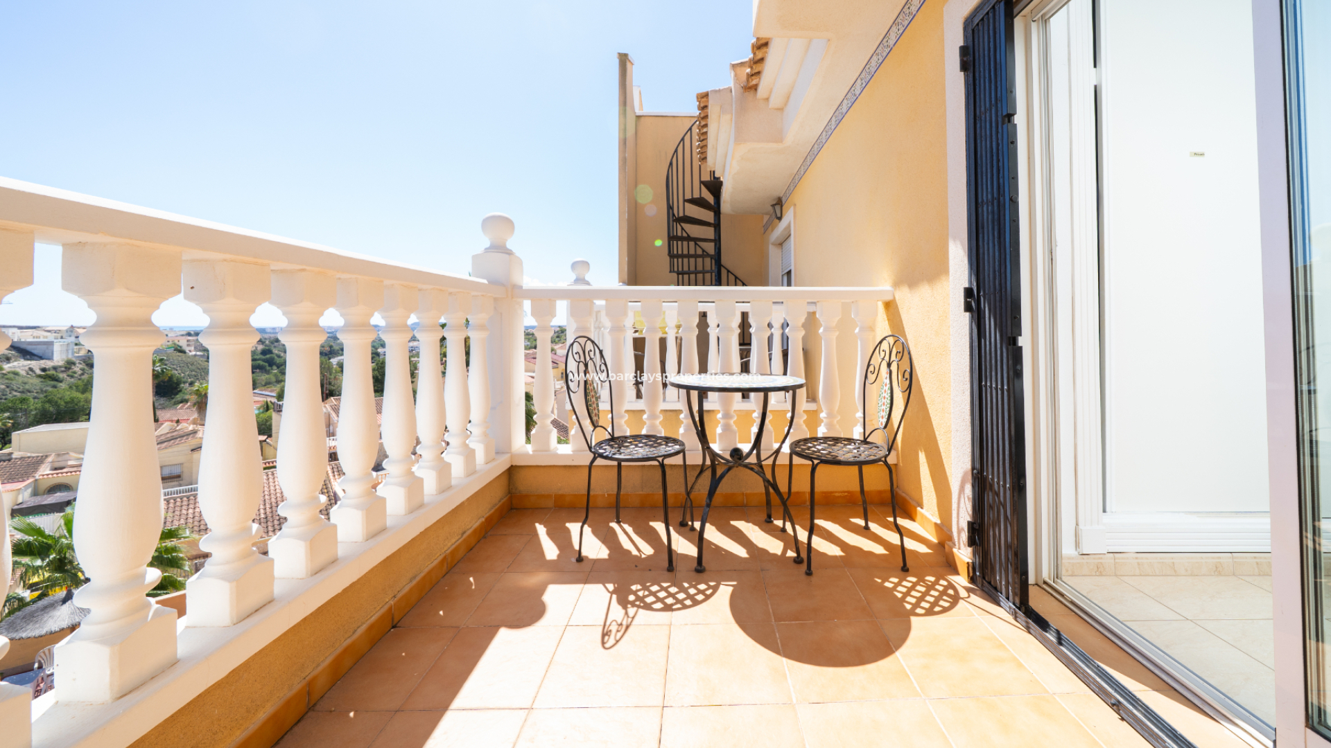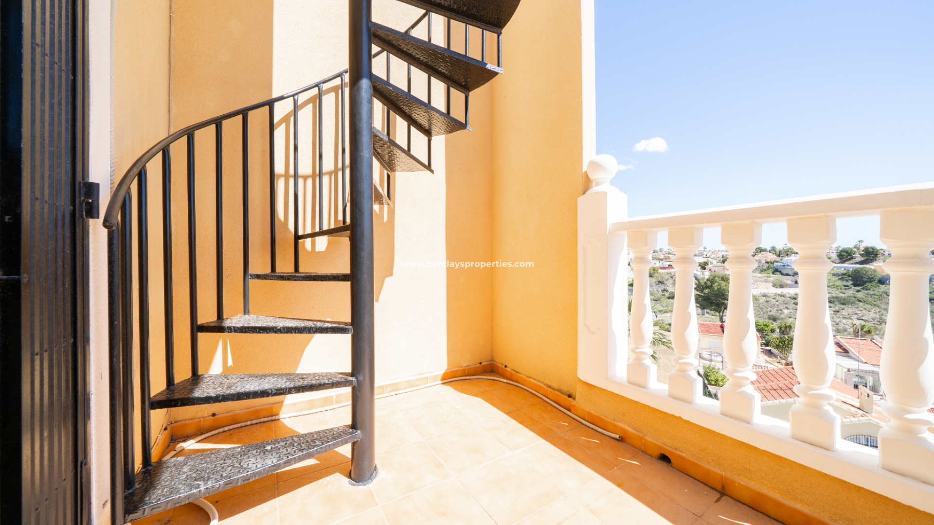 Das zweite Schlafzimmer ist mit Einbauschränken, Klimaanlage und einem Deckenventilator ausgestattet. Das Hauptschlafzimmer bietet dieselben Annehmlichkeiten sowie eine private Sonnenterrasse. Von hier aus führt eine Treppe auf die Dachterrasse, von der aus man einen atemberaubenden Panoramablick über das Meer und die nahegelegene Urbanisation La Escuera genießen kann.