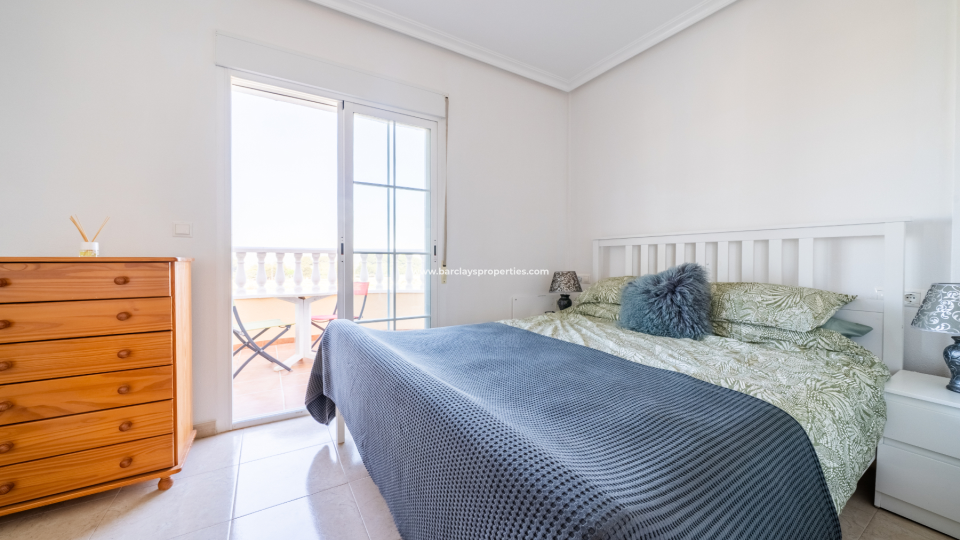 Eine Marmortreppe führt in das Obergeschoss, wo sich das zweite Doppelschlafzimmer mit Einbauschränken und Zugang zu einem privaten Balkon befindet. Das dritte Schlafzimmer ist die Hauptsuite mit verspiegelten Einbauschränken und Zugang zu einem privaten Balkon mit offenem Bergblick. Ein weiteres Badezimmer komplettiert das Obergeschoss und verfügt über eine Badewanne, ein Bidet, WC und Waschtisch.