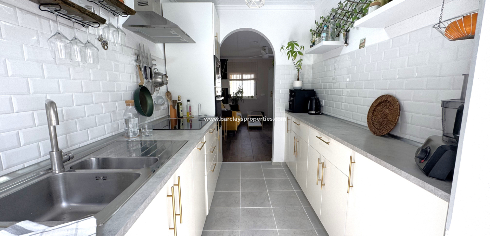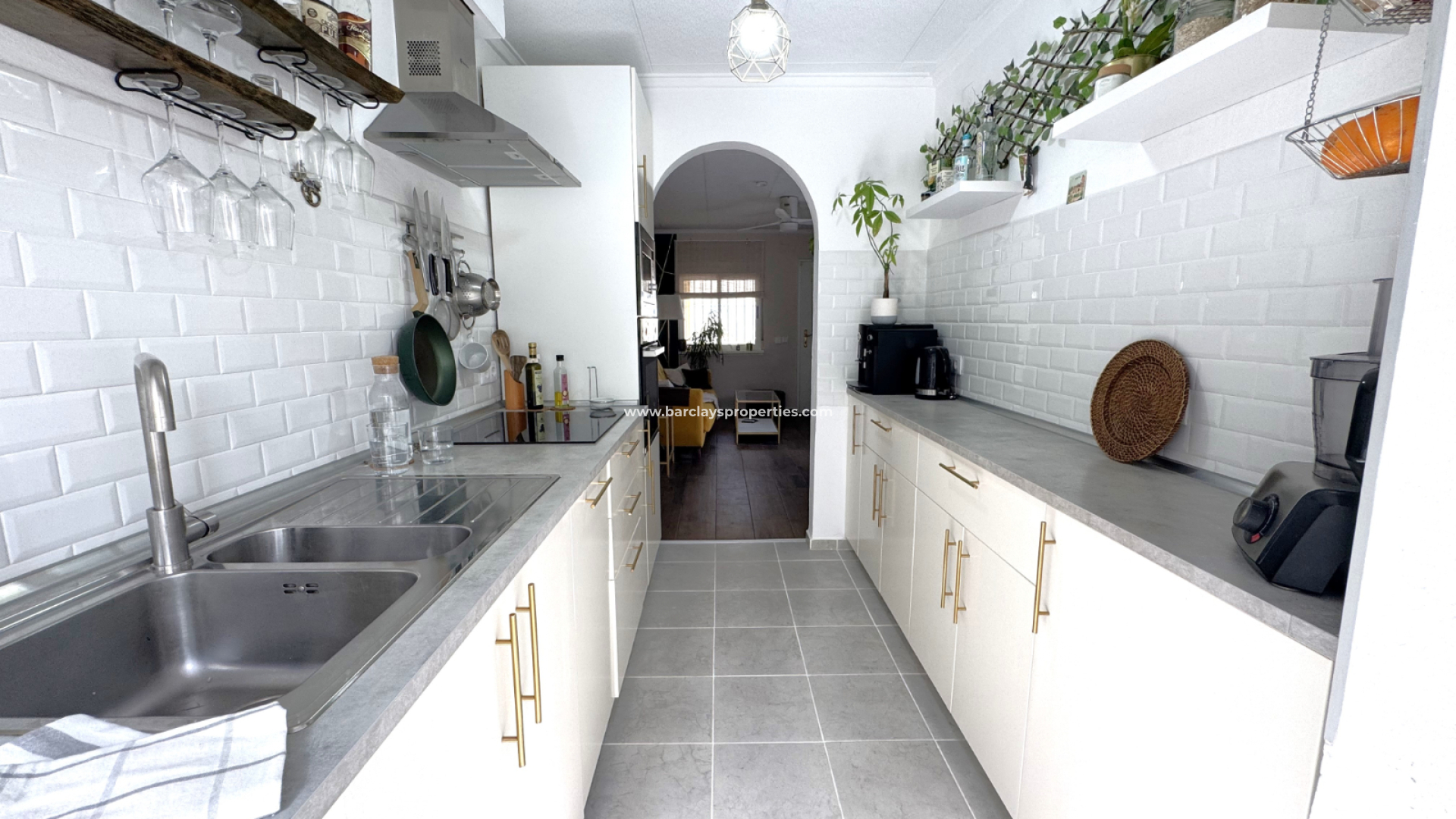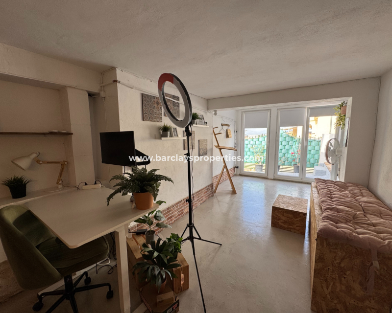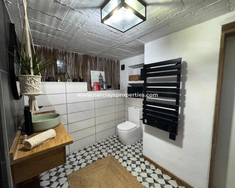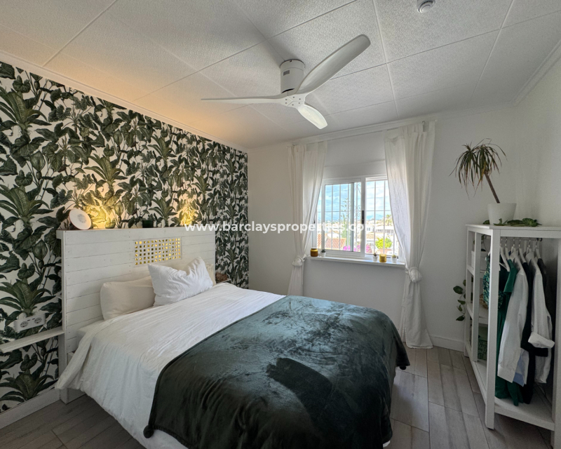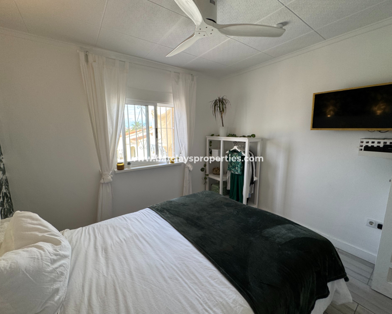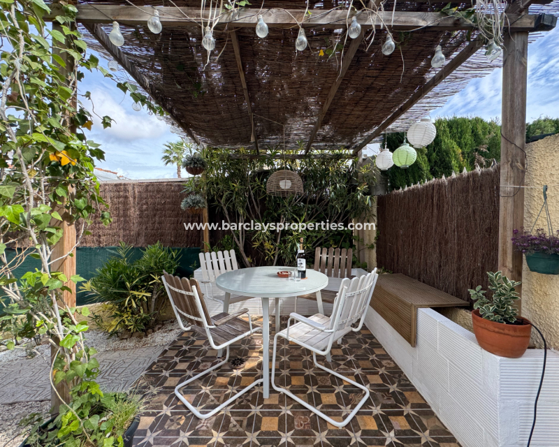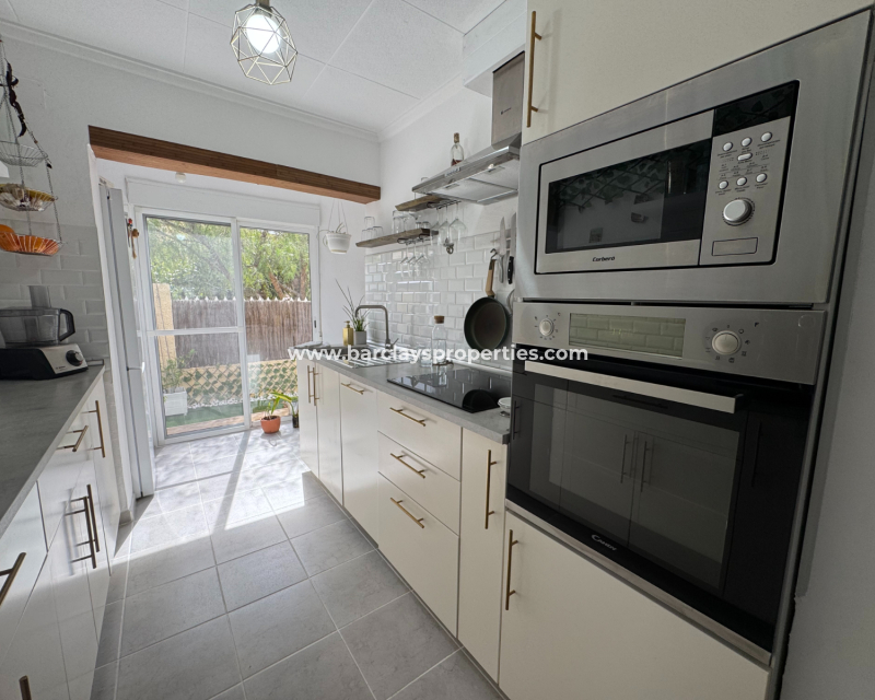 Eine Treppe führt zur überdachten Eingangsterrasse und weiter ins Innere der Villa, wo sich ein helles, modernes Wohnzimmer mit Essbereich befindet. Die modernisierte, voll ausgestattete Küche verfügt über einen Hauswirtschaftsbereich und Zugang zum Garten über eine Schiebetür. Vom Flur aus erreicht man zwei Schlafzimmer sowie ein neu renoviertes, modernes Badezimmer. Die stilvolle Einrichtung und die geschmackvolle Farbwahl verleihen dieser Villa eine einladende Atmosphäre – perfekt als dauerhaftes Zuhause oder als Ferienhaus an der Costa Blanca.