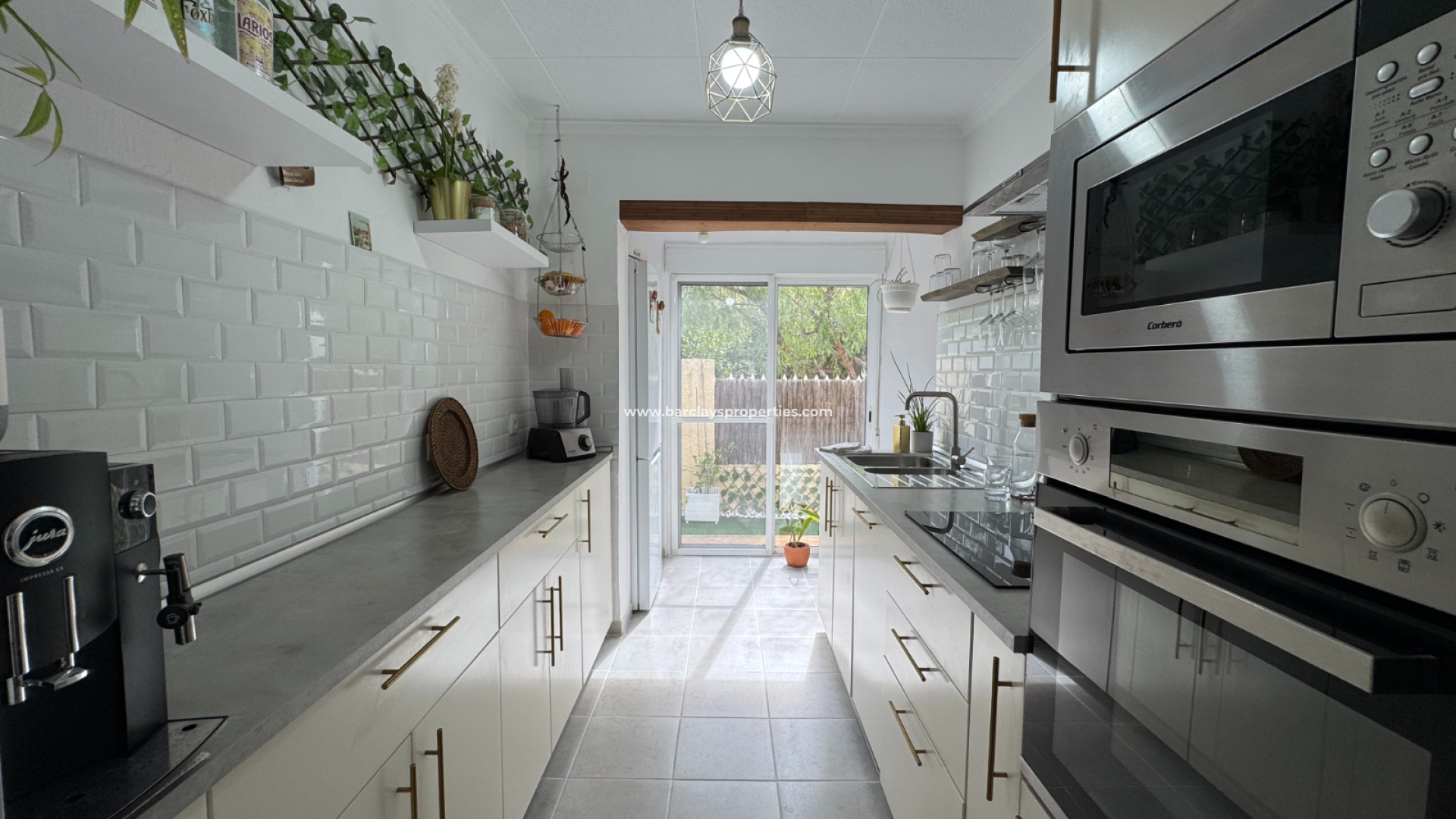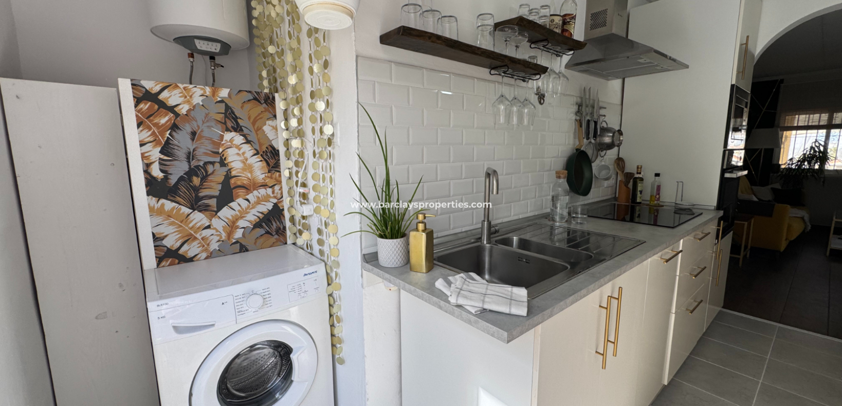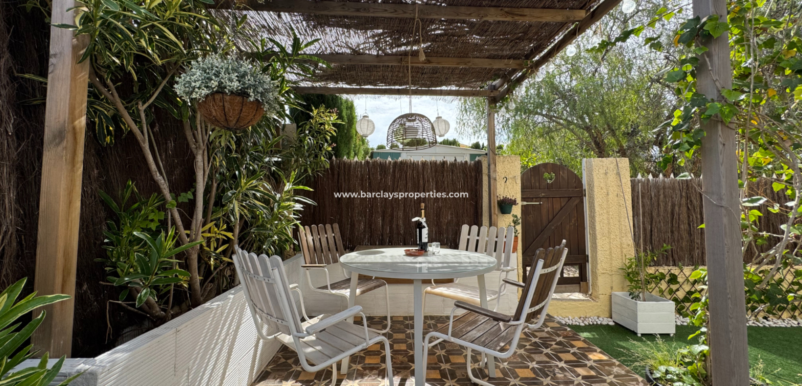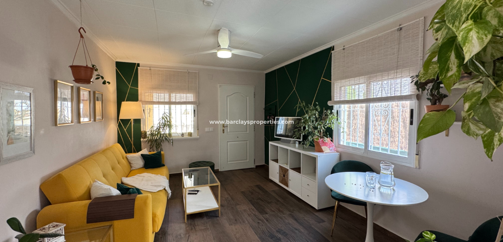 Eine Treppe führt zur überdachten Eingangsterrasse und weiter ins Innere der Villa, wo sich ein helles, modernes Wohnzimmer mit Essbereich befindet. Die modernisierte, voll ausgestattete Küche verfügt über einen Hauswirtschaftsbereich und Zugang zum Garten über eine Schiebetür. Vom Flur aus erreicht man zwei Schlafzimmer sowie ein neu renoviertes, modernes Badezimmer. Die stilvolle Einrichtung und die geschmackvolle Farbwahl verleihen dieser Villa eine einladende Atmosphäre – perfekt als dauerhaftes Zuhause oder als Ferienhaus an der Costa Blanca.