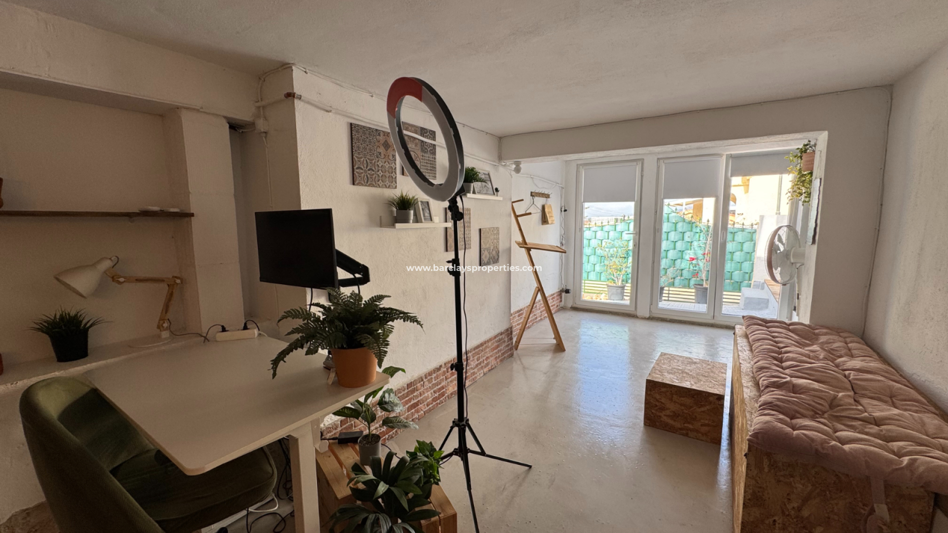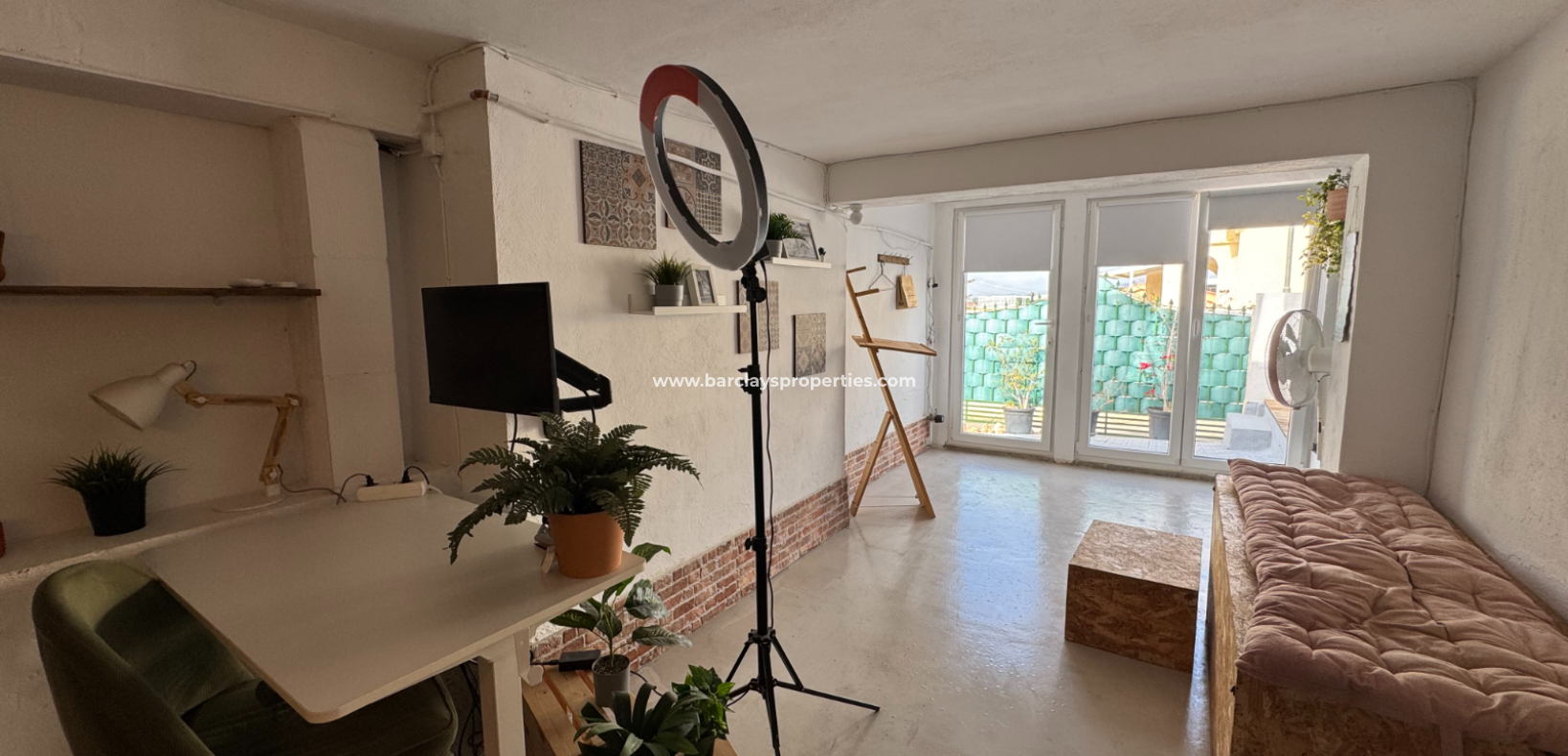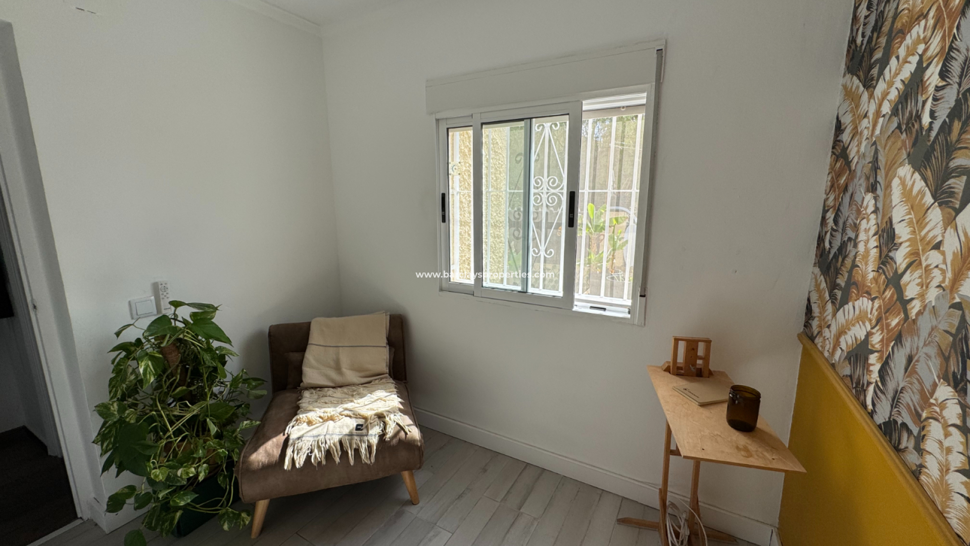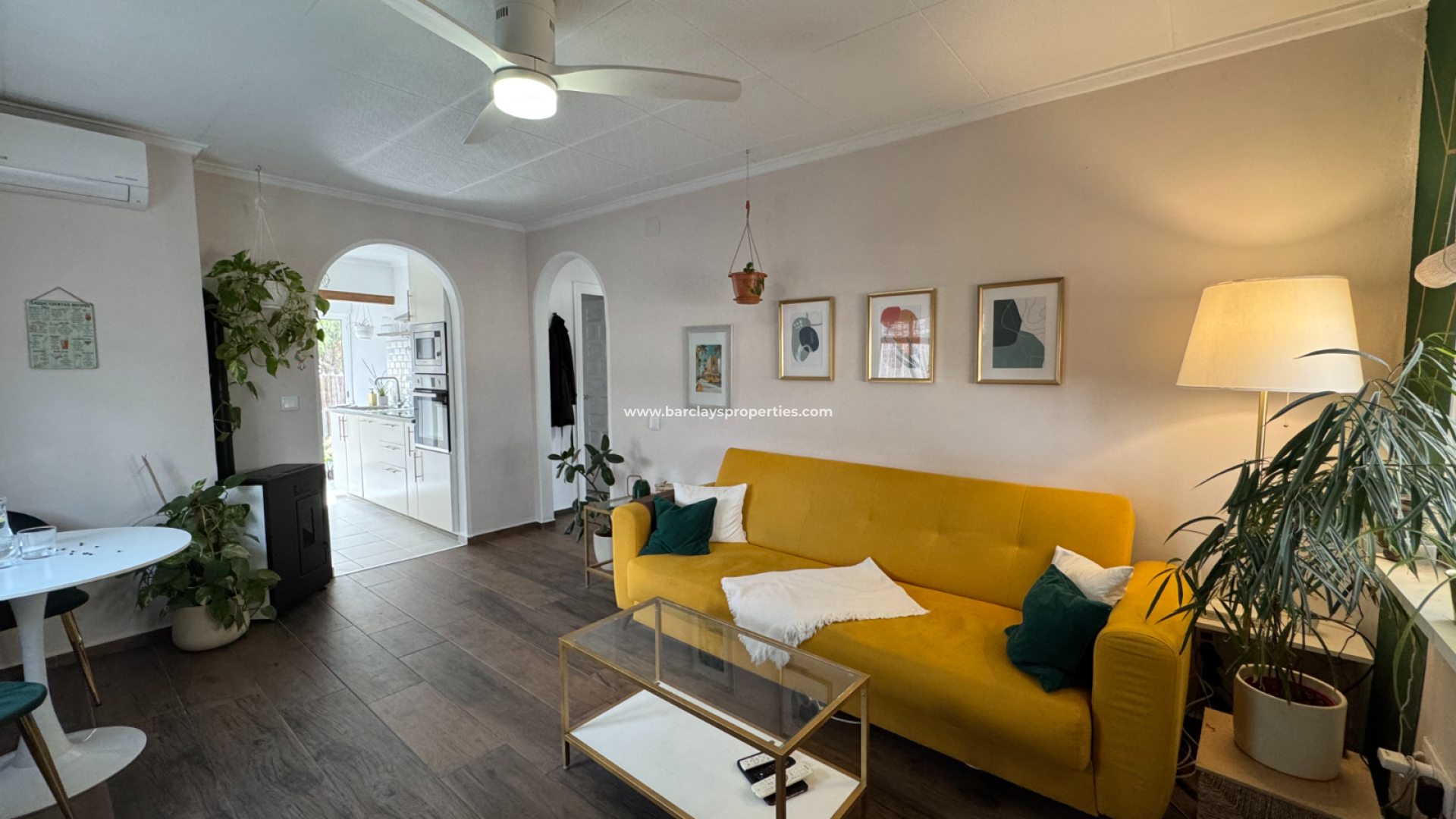 Eine Treppe führt zur überdachten Eingangsterrasse und weiter ins Innere der Villa, wo sich ein helles, modernes Wohnzimmer mit Essbereich befindet. Die modernisierte, voll ausgestattete Küche verfügt über einen Hauswirtschaftsbereich und Zugang zum Garten über eine Schiebetür. Vom Flur aus erreicht man zwei Schlafzimmer sowie ein neu renoviertes, modernes Badezimmer. Die stilvolle Einrichtung und die geschmackvolle Farbwahl verleihen dieser Villa eine einladende Atmosphäre – perfekt als dauerhaftes Zuhause oder als Ferienhaus an der Costa Blanca.