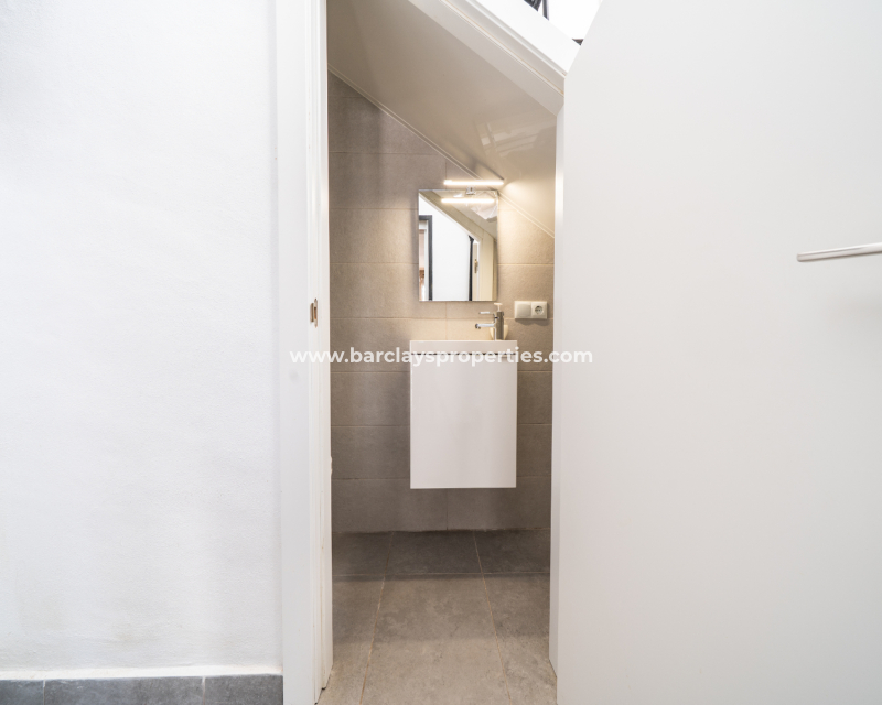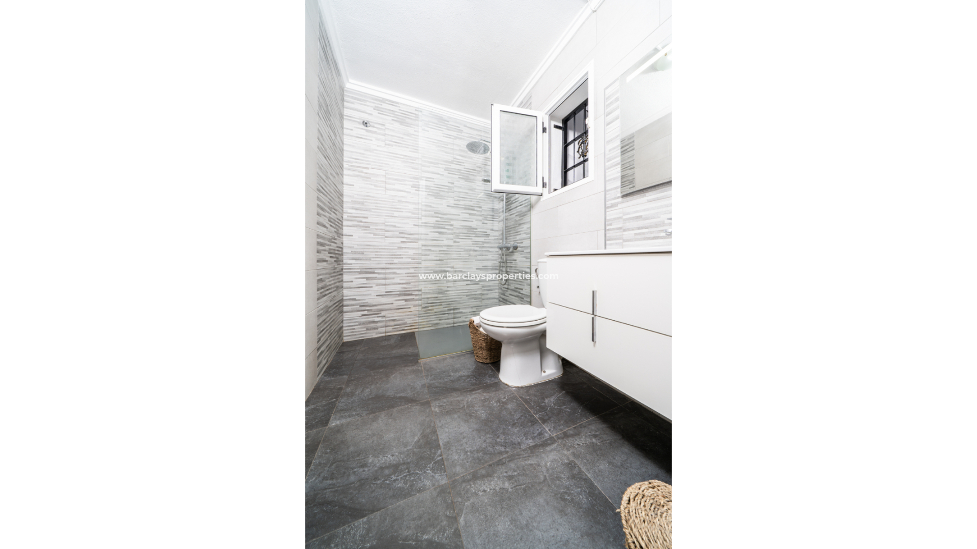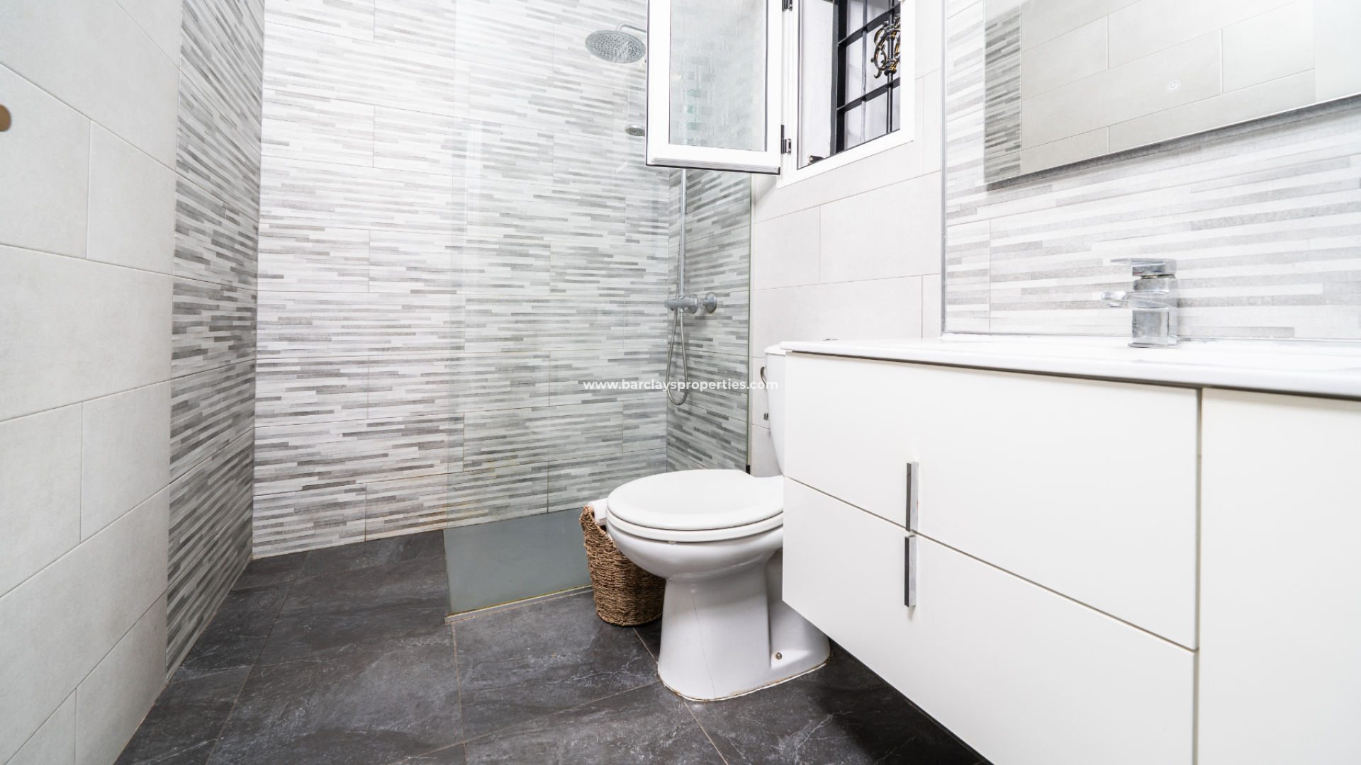 Diese schöne Immobilie vom Typ Julia verfügt über drei komfortable Doppelschlafzimmer, alle mit Klimaanlage ausgestattet. Das modernisierte Badezimmer bietet eine bodengleiche Dusche, ein Waschbecken mit LED-Spiegel sowie eine Toilette – alles in hochwertiger Ausführung.