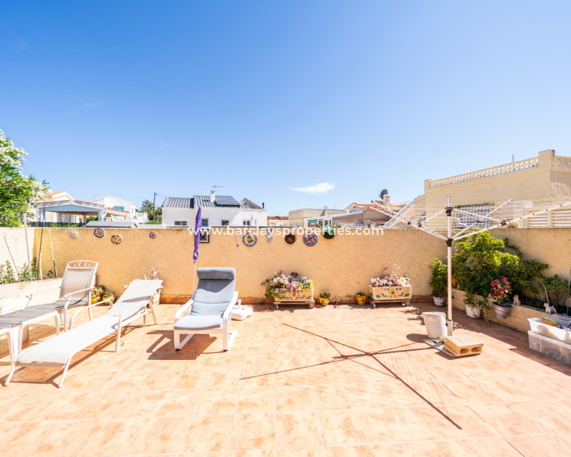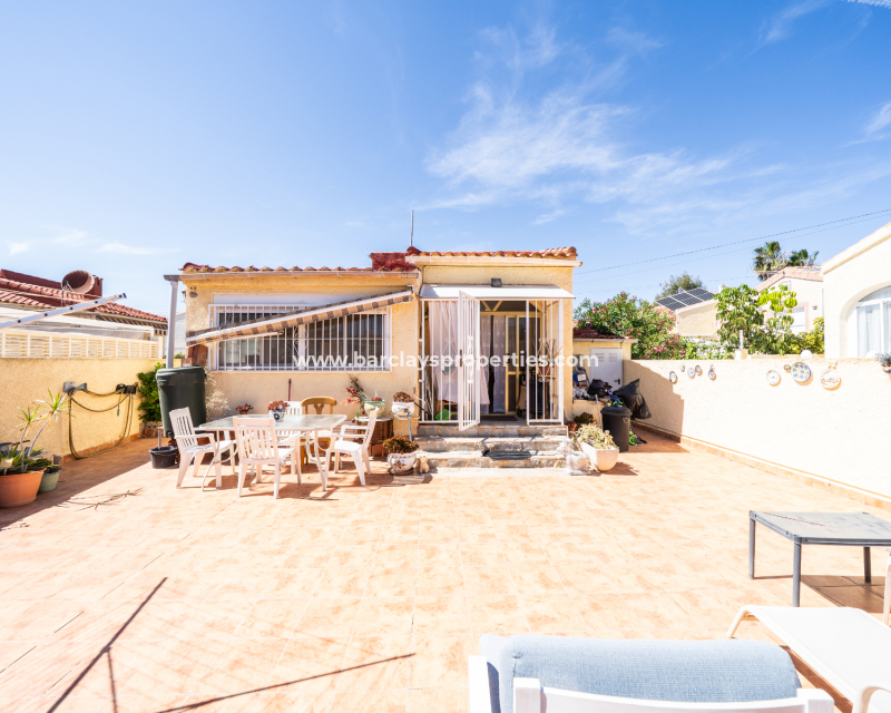 Entdecken Sie diese gepflegte freistehende Villa mit 3 Schlafzimmern und 1 Badezimmer in einer ruhigen Gegend der Urbanisation La Marina, nur ✅250 m zu Fuß von Geschäften und Annehmlichkeiten entfernt. Das nach Osten ausgerichtete Haus bietet viel Tageslicht und wurde auf einem 207 m² großen Grundstück mit 97 m² bebauter Fläche errichtet – ✅Platz für den Bau eines privaten Pools ist vorhanden.