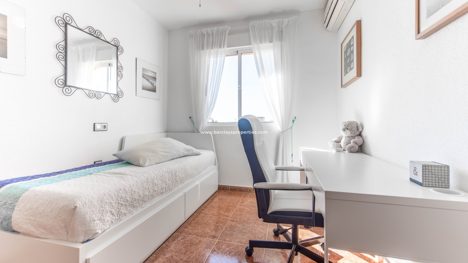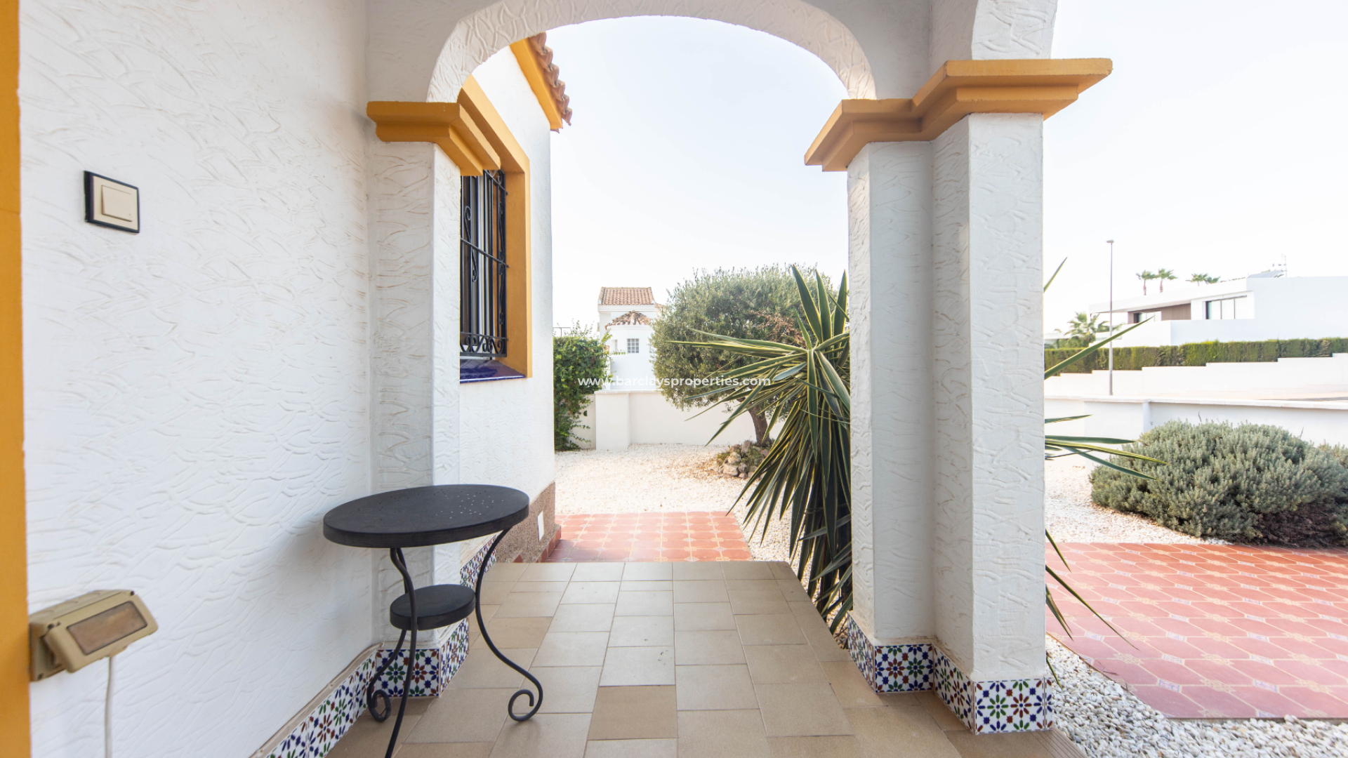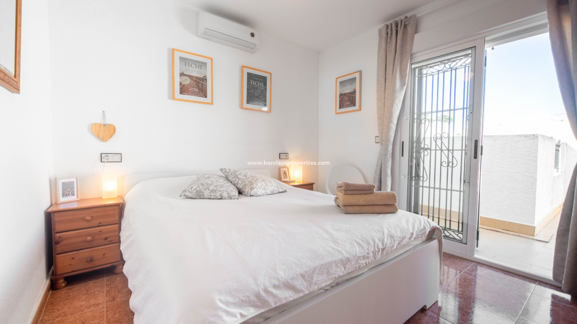 In einer ruhigen Gegend der Urbanisation La Marina auf einem großzügigen 96 m² großen Eckgrundstück gelegen, bietet diese wunderschön gepflegte Quad-Villa, Modell „Isabel“, 3 Schlafzimmer, 2 Badezimmer und 72 m² bebaute Fläche auf zwei Ebenen. Das Anwesen ist Teil einer privaten Gemeinschaft ➡️ mit Zugang zu einem schönen Gemeinschaftspool und Grünflächen, wobei bei Bedarf immer noch Platz für den Bau eines privaten Pools vorhanden ist. Der Außenbereich verfügt über Off-Road-Parkplätze, einen Gartenschuppen und geräumige Terrassen, darunter ➡️ ein privates Dachsolarium mit atemberaubendem Blick auf die Landschaft und die Berge. Im Inneren wird das Haus ➡️ komplett möbliert übergeben und umfasst eine unabhängige Einbauküche, Klimaanlage im gesamten Haus, Deckenventilatoren, Einbauschränke und Haushaltsgeräte. Der Wohnbereich verfügt über einen Holzofen und führt zu einer überdachten Veranda, während das Hauptschlafzimmer direkten Zugang zu einer Sonnenterrasse bietet. ➡️ Ideal gelegen, nur 750 Meter von Annehmlichkeiten entfernt, 3 km vom Strand und 25 km vom Flughafen Alicante, ist diese Immobilie perfekt für dauerhaftes Wohnen oder einen Urlaubsort.
