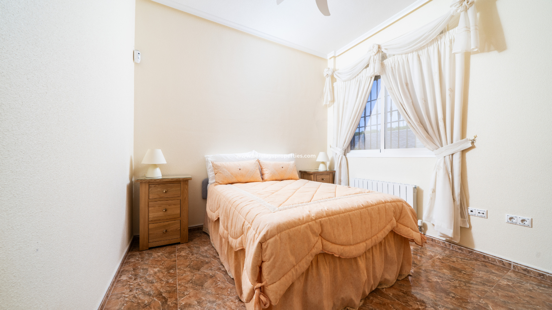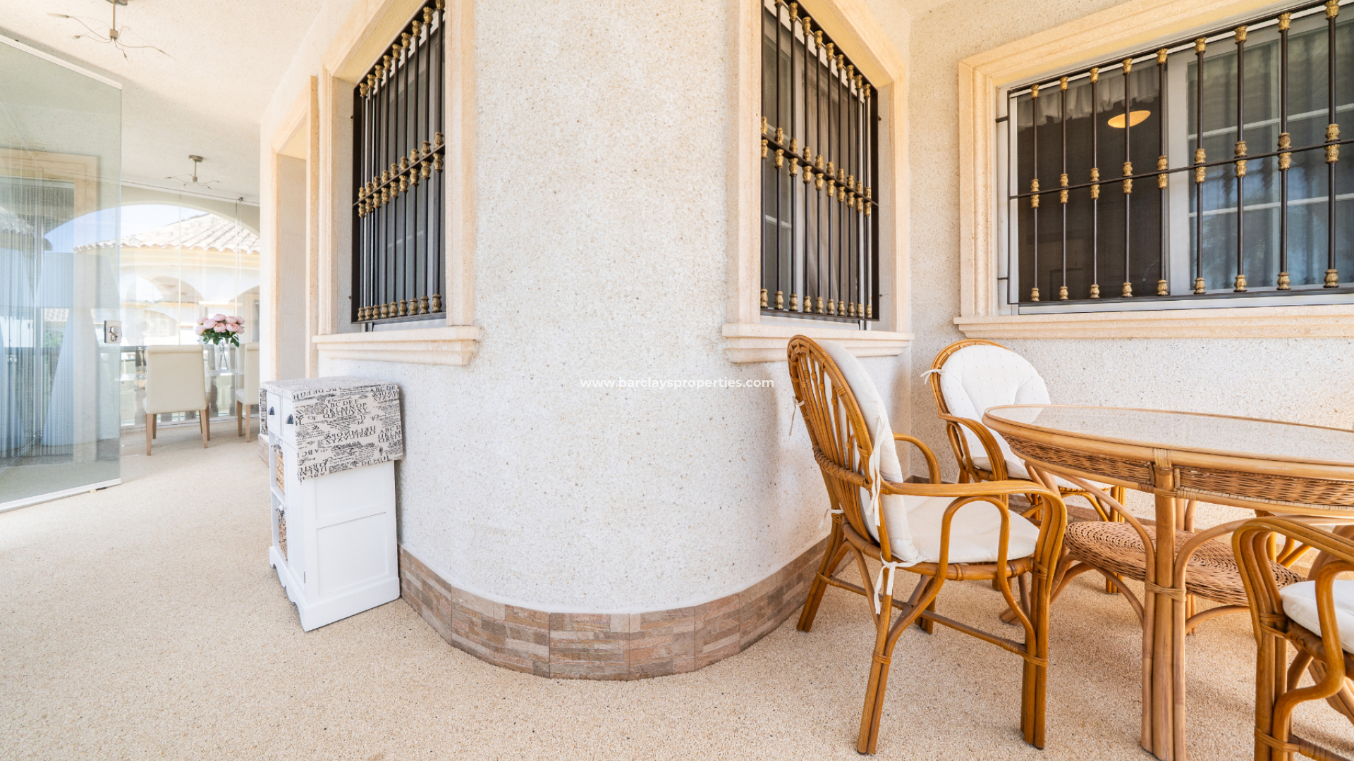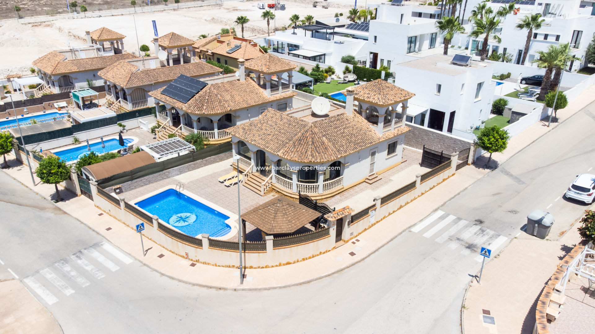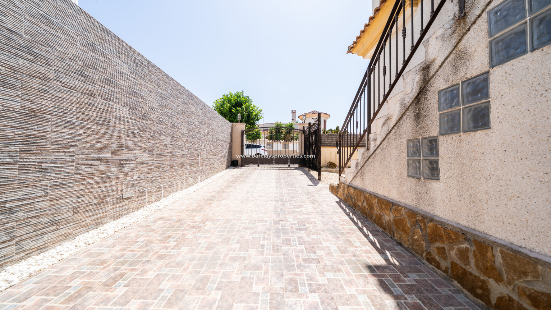 Diese beeindruckende freistehende Villa bietet ein geräumiges und privates Wohngefühl, ➡️ auf einem begehrten Eckgrundstück gelegen und mit einer Reihe wünschenswerter Annehmlichkeiten ausgestattet. Das Anwesen verfügt über einen eigenen ➡️ privaten Swimmingpool, eine große, verglaste Terrasse, die sich ideal für den ganzjährigen Genuss eignet, und ein sicheres elektrisches Torzugangssystem. Eine charmante Holzpergola und ein Steintisch bieten einen großartigen Unterhaltungsbereich im Freien, während ein Holzschuppen und ein separates Außenwaschbecken für zusätzliche Praktikabilität sorgen.
