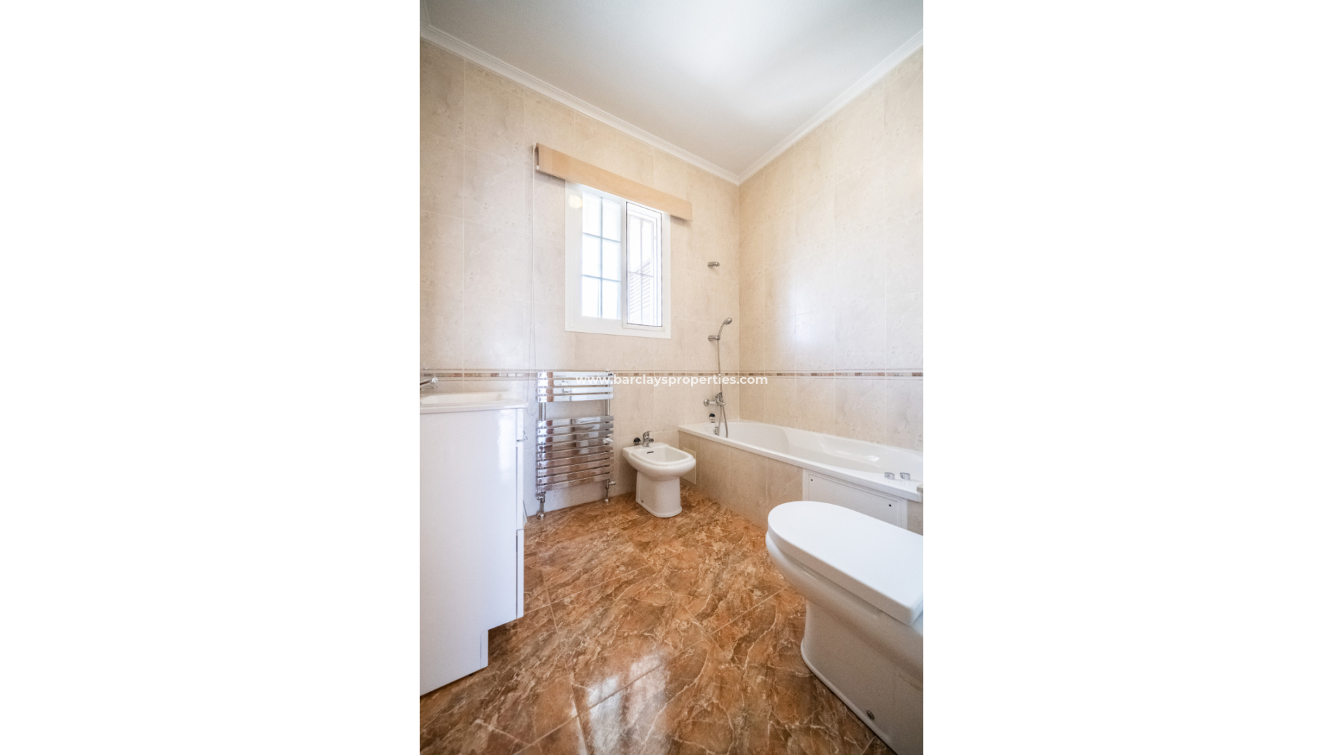 Die Villa verfügt über drei Doppelschlafzimmer. ➡️ Die Master-Suite umfasst Klimaanlage, Deckenventilator, einen vierteiligen Einbauschrank und ein geräumiges En-Suite-Badezimmer mit begehbarer Dusche, WC und Waschtisch. Das zweite und dritte Schlafzimmer sind ebenfalls Doppelzimmer, jedes mit Einbauschränken, Deckenventilatoren und Klimaanlage.