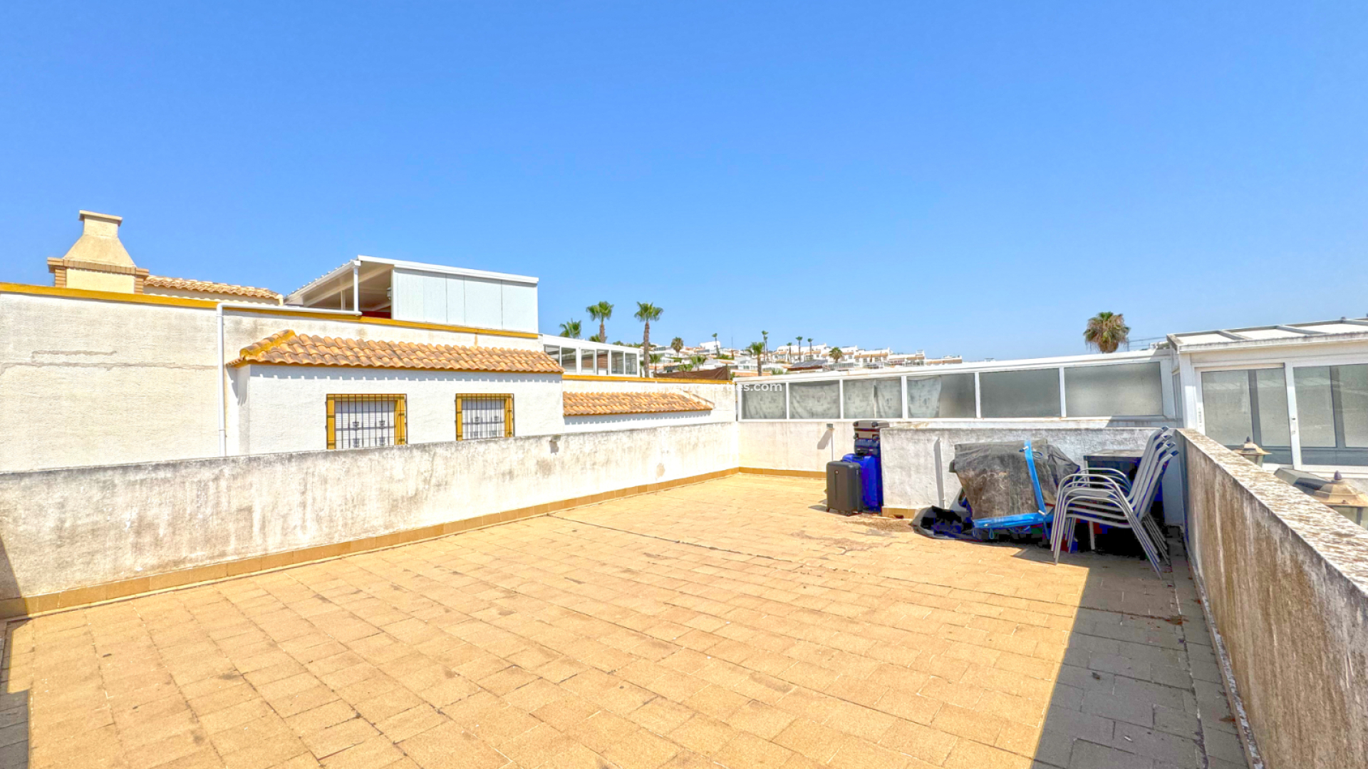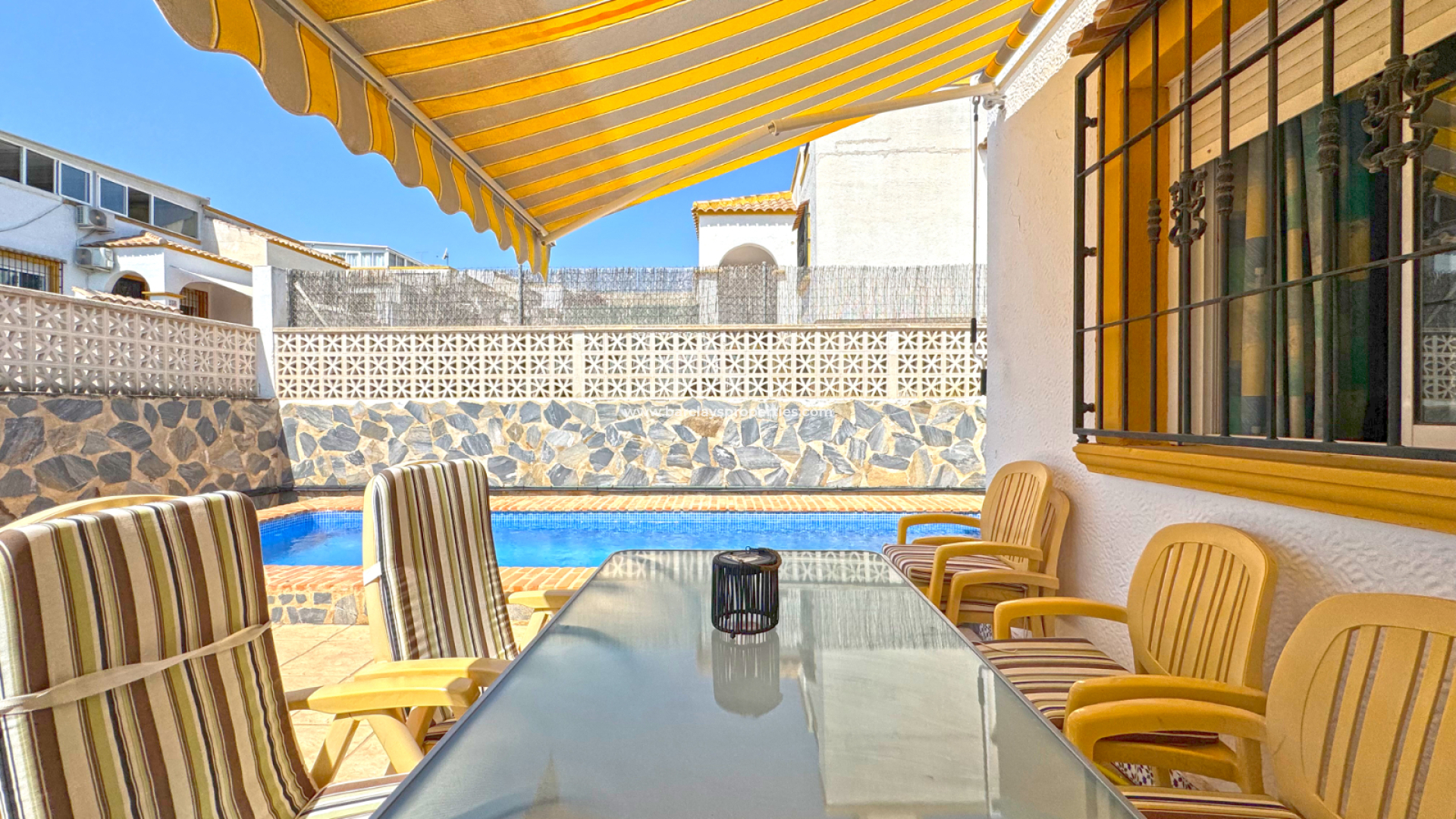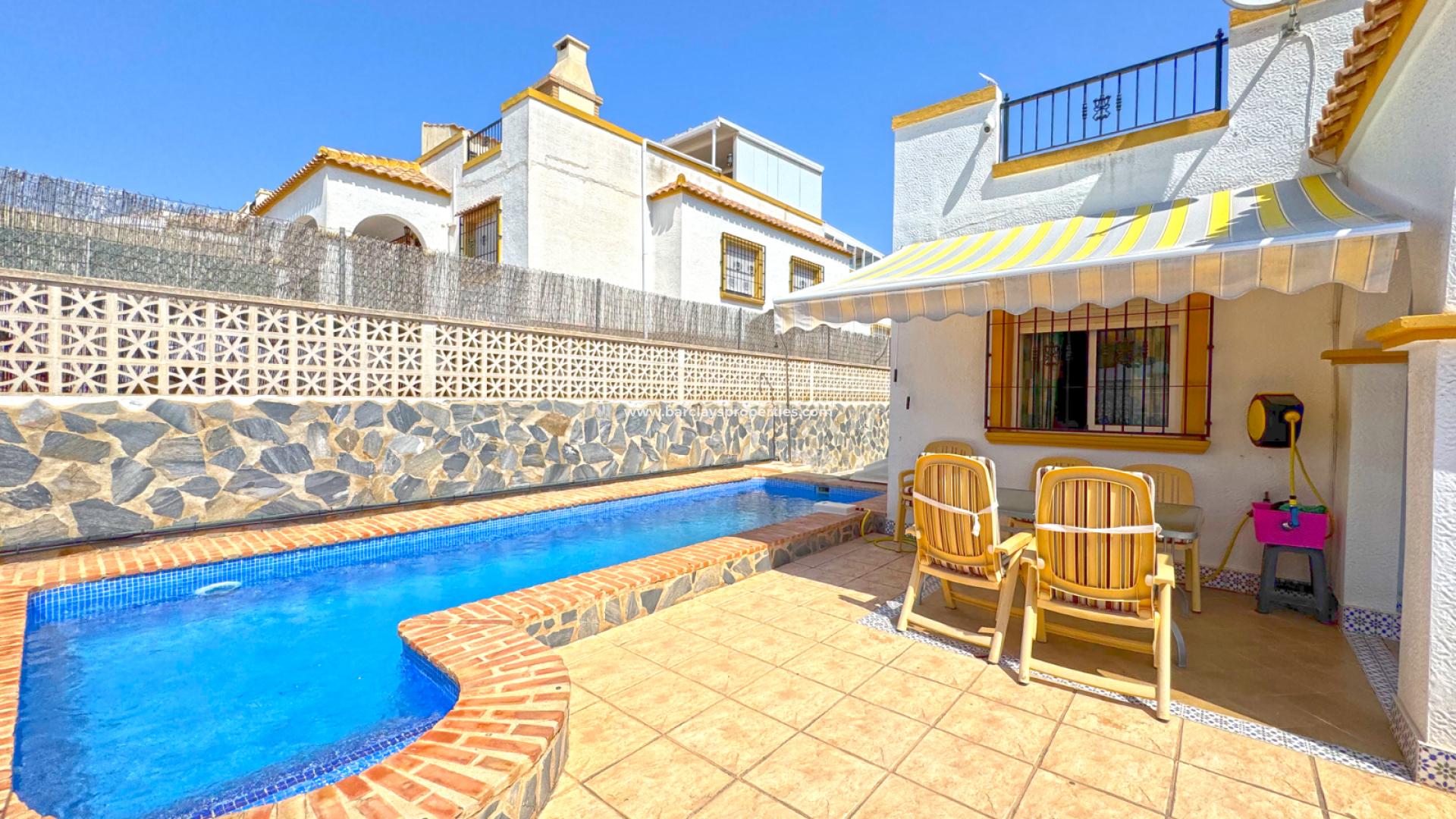 Die Immobilie verfügt über 3 Schlafzimmer und 1 Badezimmer und bietet Privatsphäre durch hohe Mauern, die den Vorgarten mit dem privaten Pool umschließen.