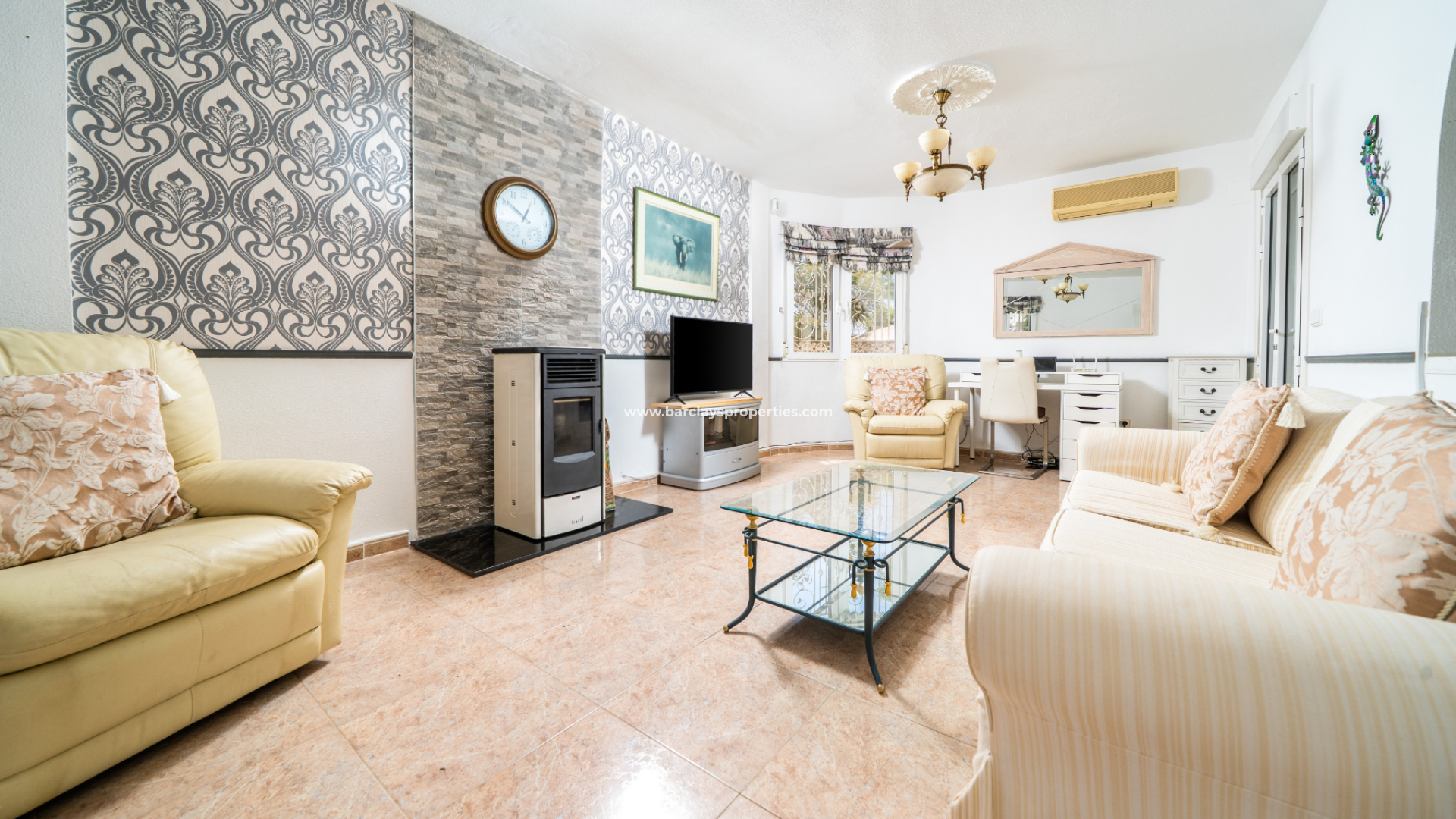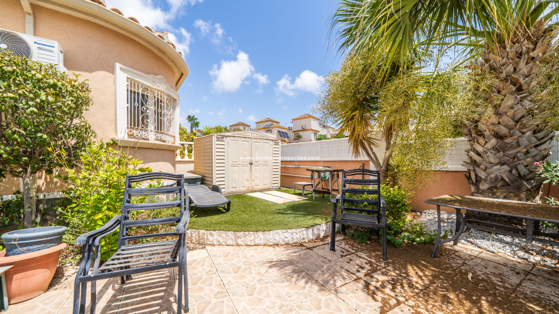 Wir freuen uns, diese wunderschöne freistehende Villa in der begehrten Urbanisation La Marina zum Verkauf anbieten zu können. Dieses geräumige, ➡️ ebenerdige Anwesen befindet sich auf einem großzügigen 503 m² großen Grundstück und bietet 156 m² Wohnfläche. Die Villa verfügt über drei helle, komfortable und geräumige Schlafzimmer, zwei Badezimmer (eines davon en suite mit wandbündiger Dusche), ➡️ eine halboffene Küche, die komplett mit Haushaltsgeräten ausgestattet ist, und einladendes Wohnzimmer mit direktem Zugang zu einer verglasten überdachten Terrasse mit Blick auf ➡️ den privaten 35 m² großen Swimmingpool und den angelegten Garten.