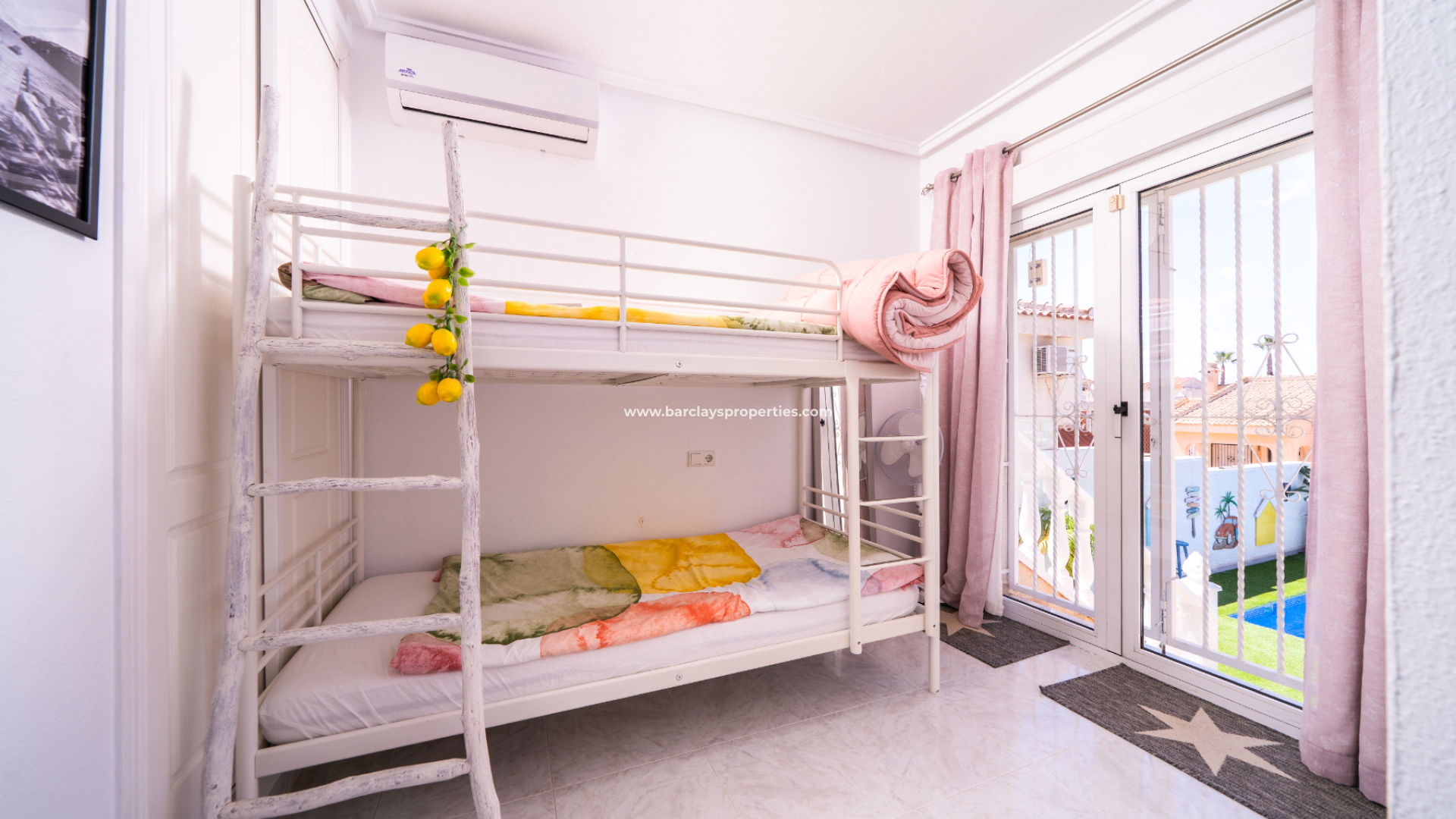 Das Hauptschlafzimmer verfügt über einen doppelten Einbauschrank, einen Deckenventilator und eine Klimaanlage. Das zweite Schlafzimmer mit eingebautem Stauraum und Klimaanlage hat auch Terrassentüren, die direkt zum Poolbereich führen. Das Badezimmer verfügt über eine Badewanne in voller Größe mit Dusche, WC, Bidet und ein modernes Waschbecken.