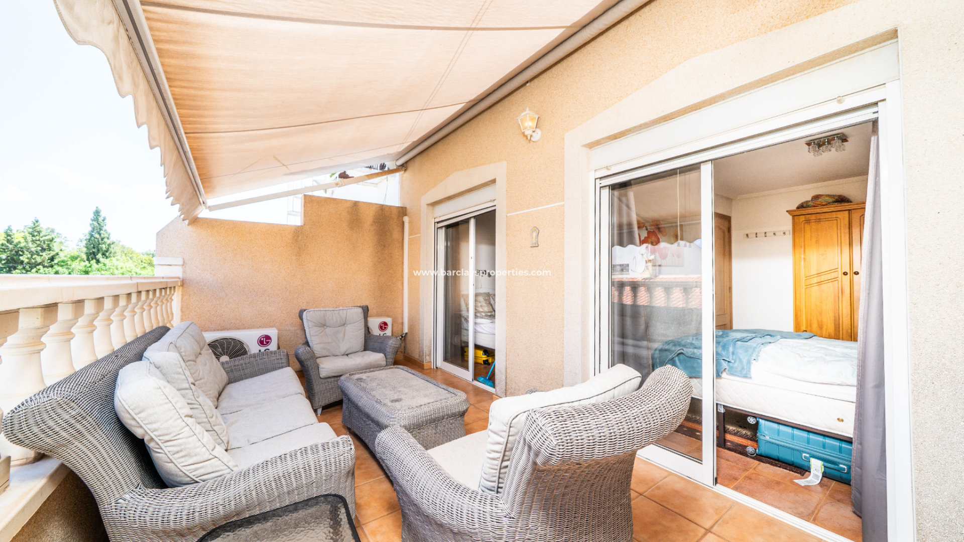 Eine Treppe führt in den ersten Stock, wo wir die beiden Schlafzimmer finden, die beide über eine Klimaanlage und direkten Zugang zu einer Sonnenterrasse durch Terrassentüren verfügen, was eine helle und luftige Verbindung zur Natur schafft. Eine Sonnenmarkise spendet Schatten und macht die Terrasse ideal zum Entspannen oder für gesellige Stunden. Im ersten Stock befindet sich auch ein renoviertes Badezimmer mit ähnlichen Armaturen wie das Badezimmer im Erdgeschoss. In diesem Badezimmer befindet sich der elektrische Boiler.