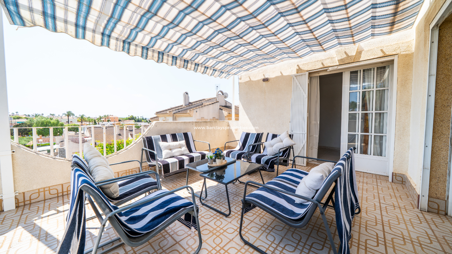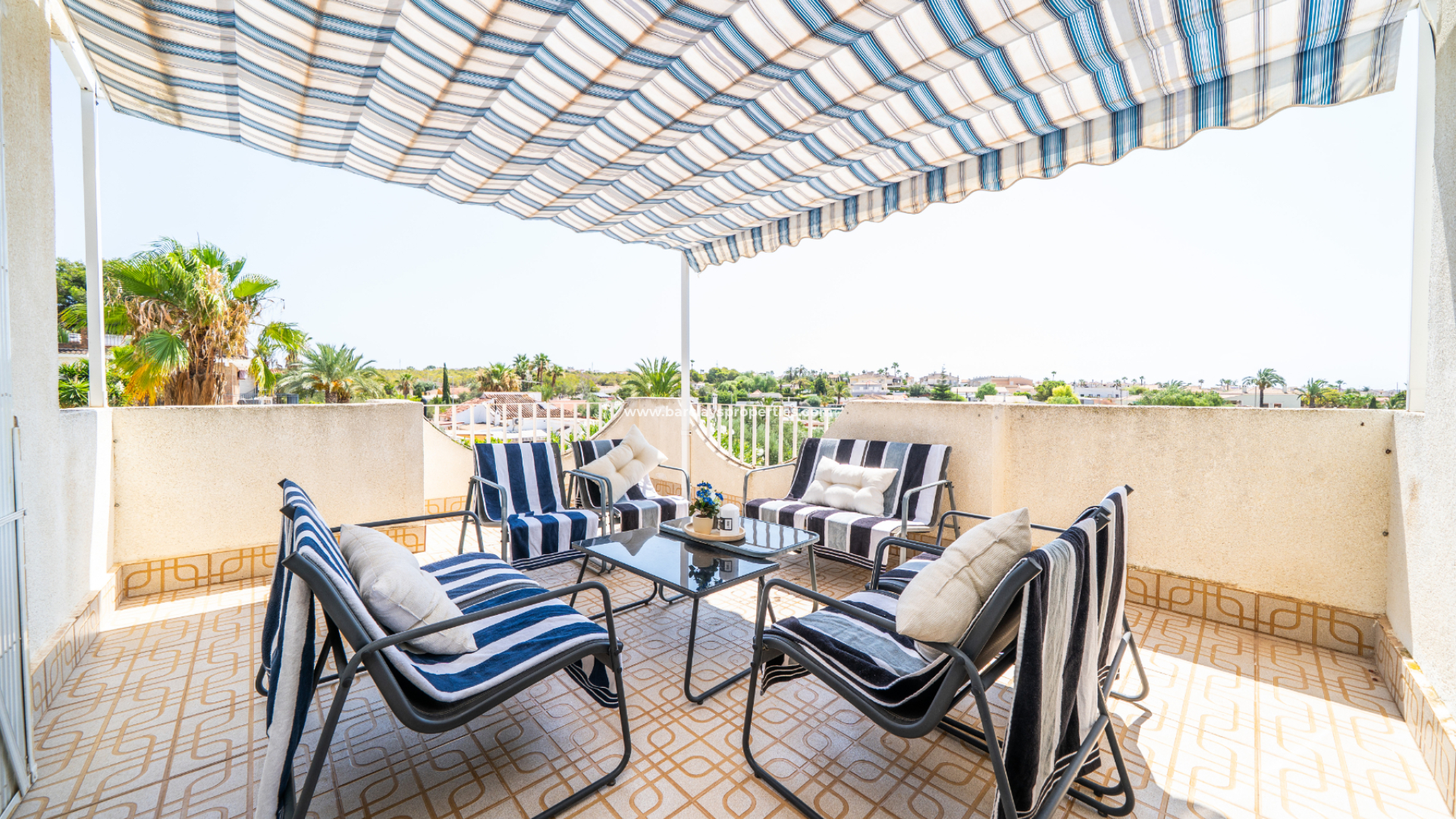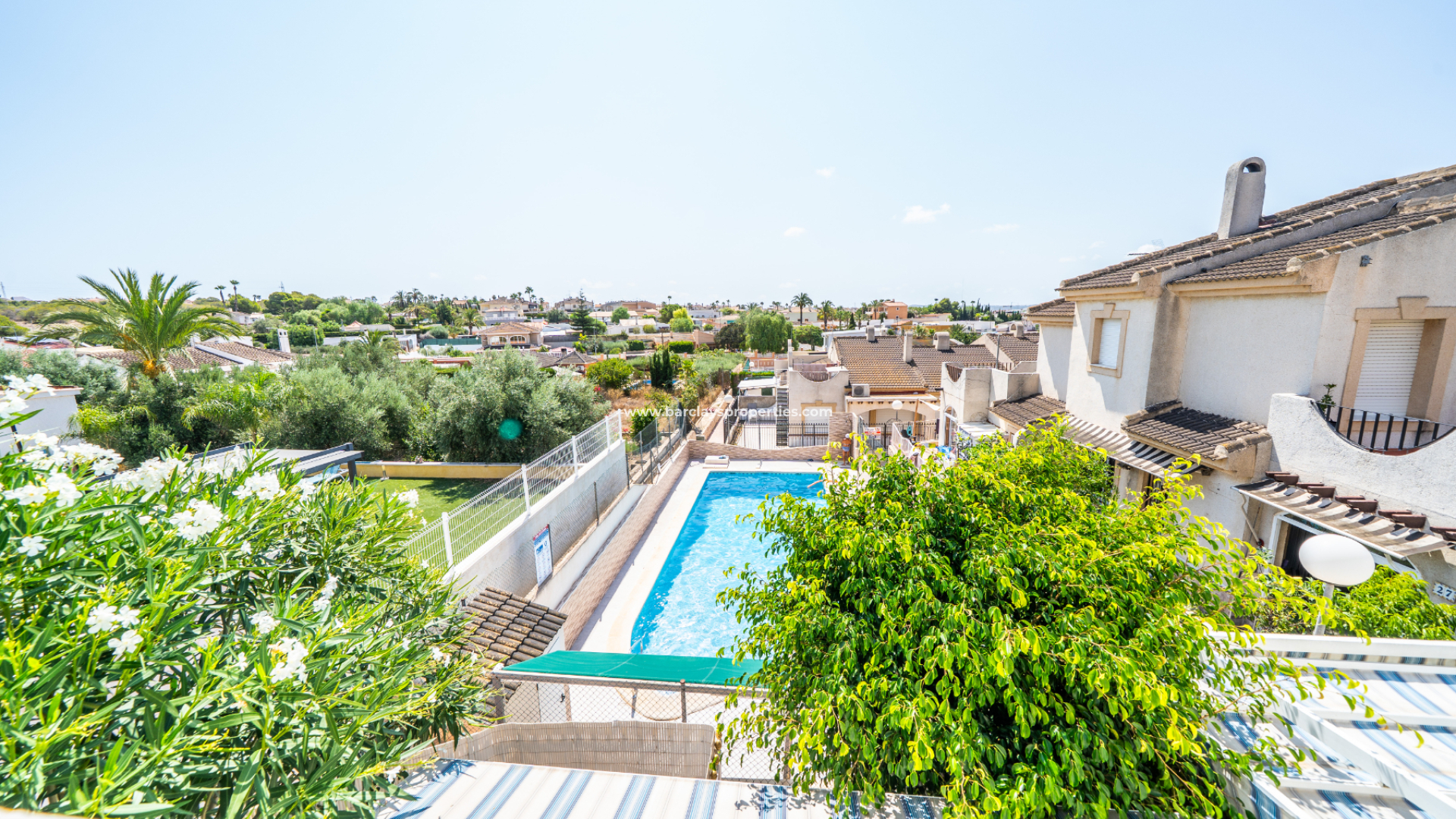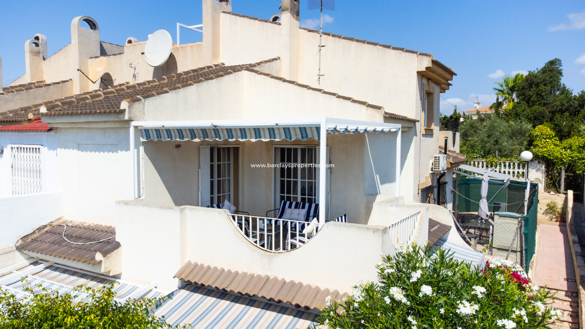 Im Obergeschoss profitiert das zweite Schlafzimmer von Einbauschränken und Deckenventilator, mit Terrassentüren, die zu einem großzügigen Balkon führen. Das dritte Schlafzimmer mit Deckenventilator hat ebenfalls Zugang zum Balkon. Dieser Bereich ist auch mit einer großen Sonnenmarkise ausgestattet, die einen Blick auf den Pool und weitreichende Ausblicke über die Urbanisation bietet.