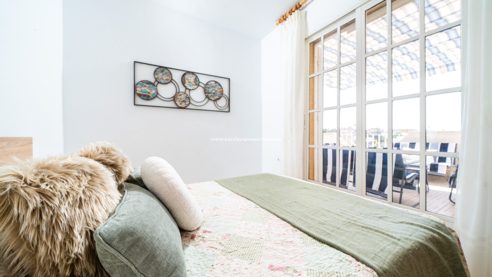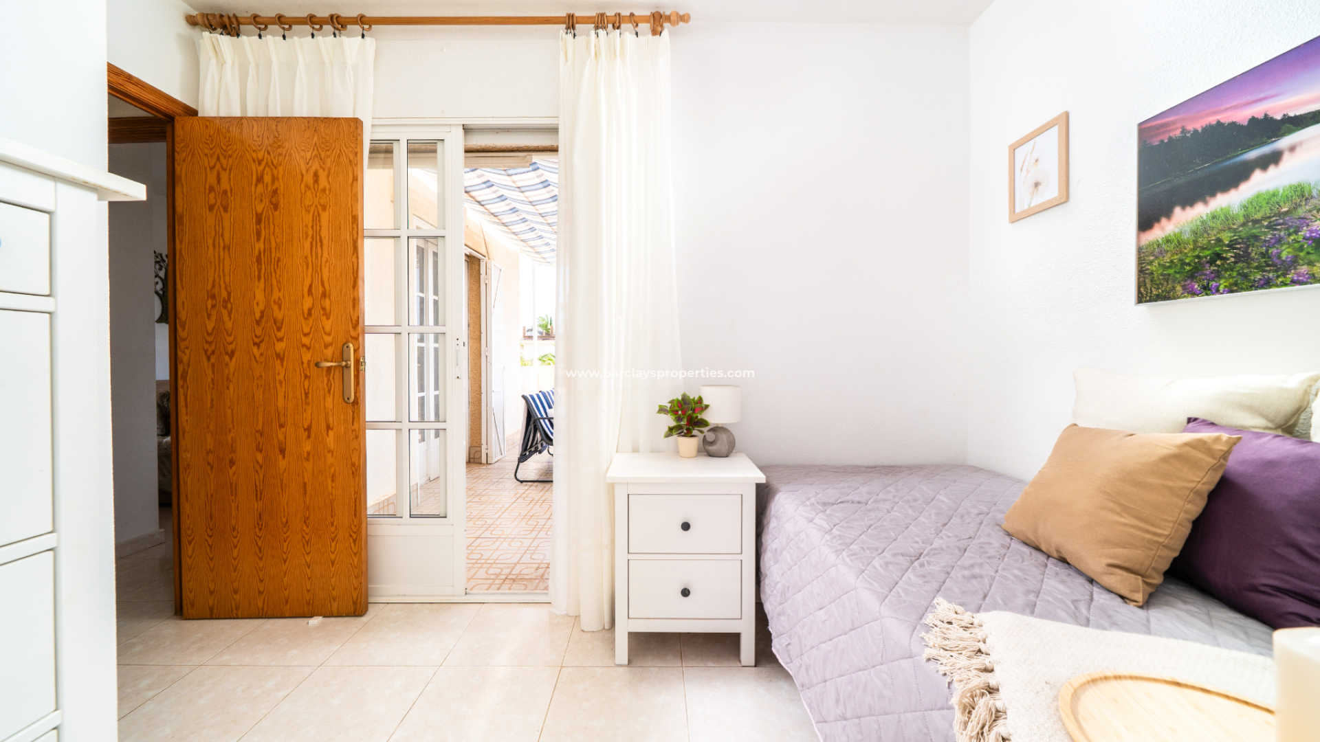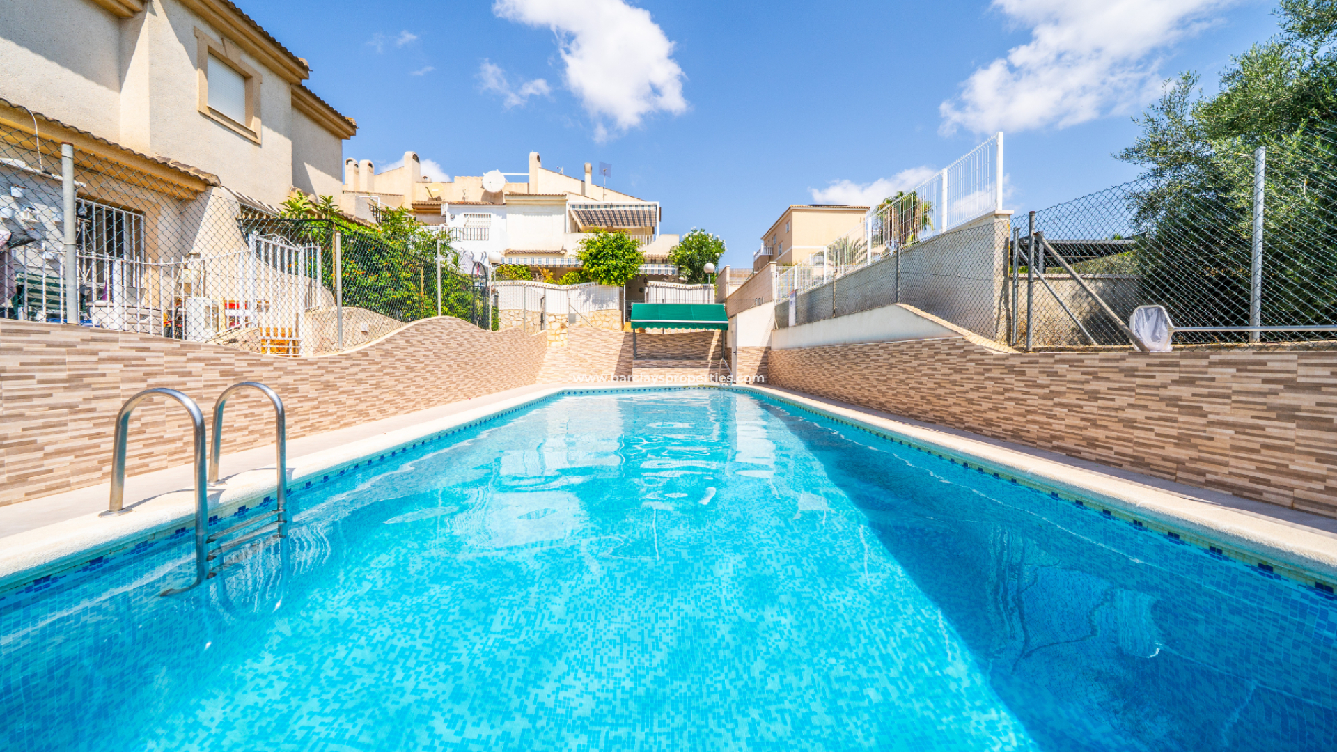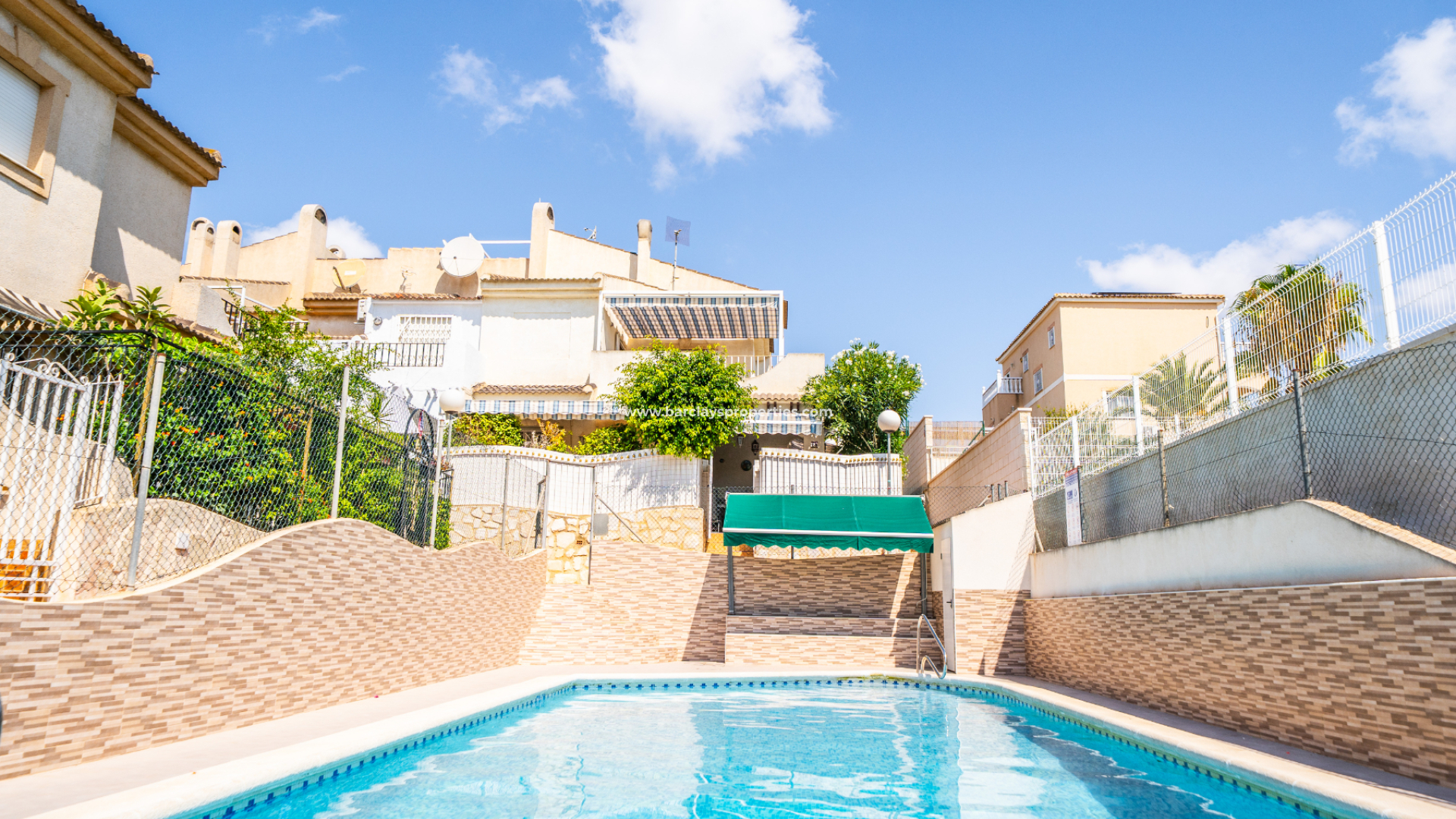Im Obergeschoss profitiert das zweite Schlafzimmer von Einbauschränken und Deckenventilator, mit Terrassentüren, die zu einem großzügigen Balkon führen. Das dritte Schlafzimmer mit Deckenventilator hat ebenfalls Zugang zum Balkon. Dieser Bereich ist auch mit einer großen Sonnenmarkise ausgestattet, die einen Blick auf den Pool und weitreichende Ausblicke über die Urbanisation bietet.