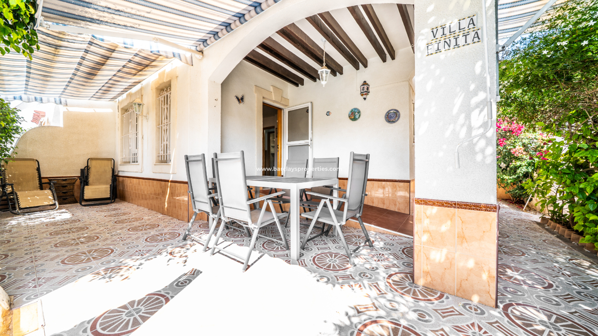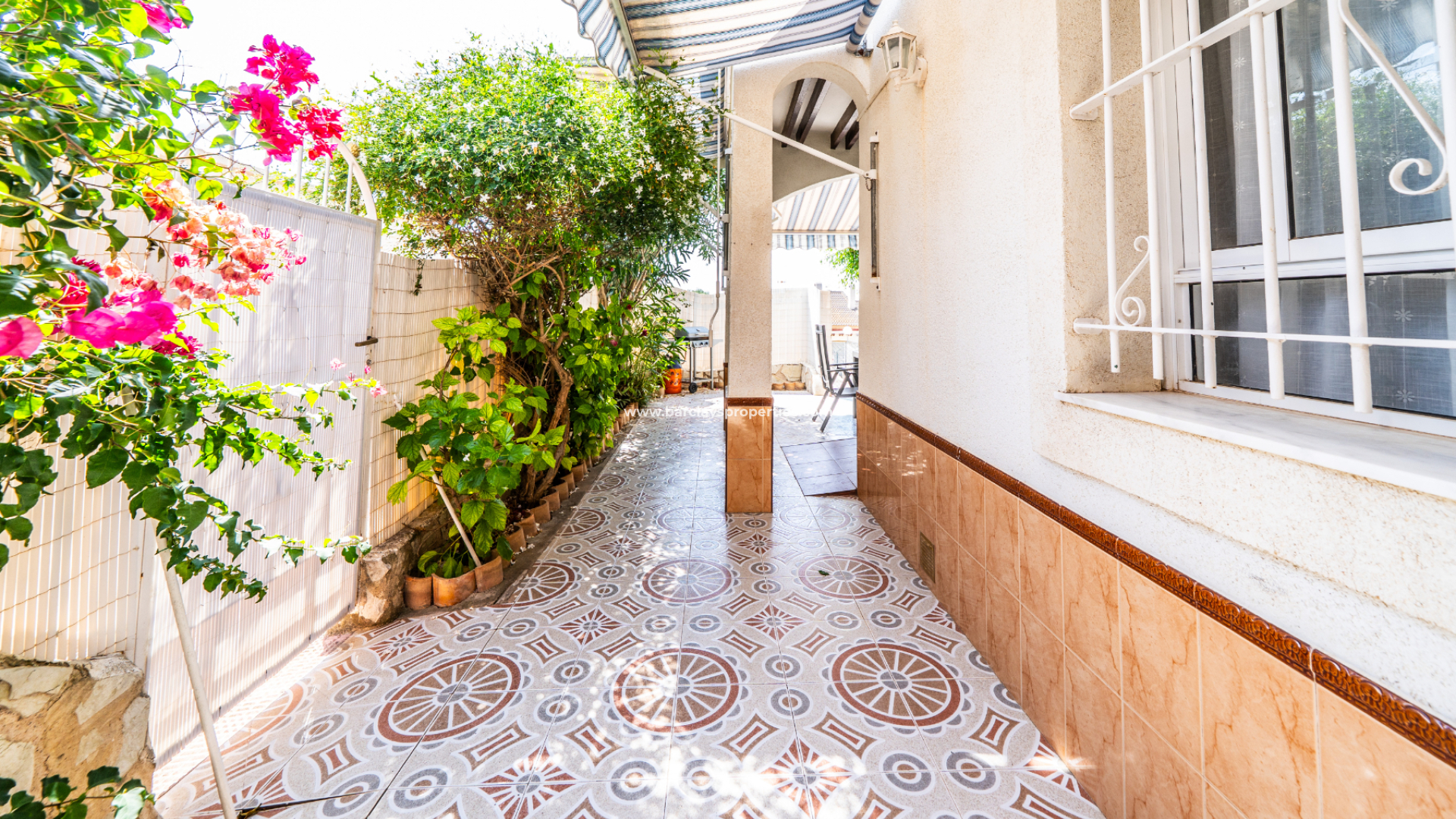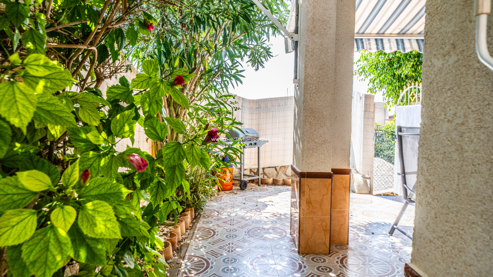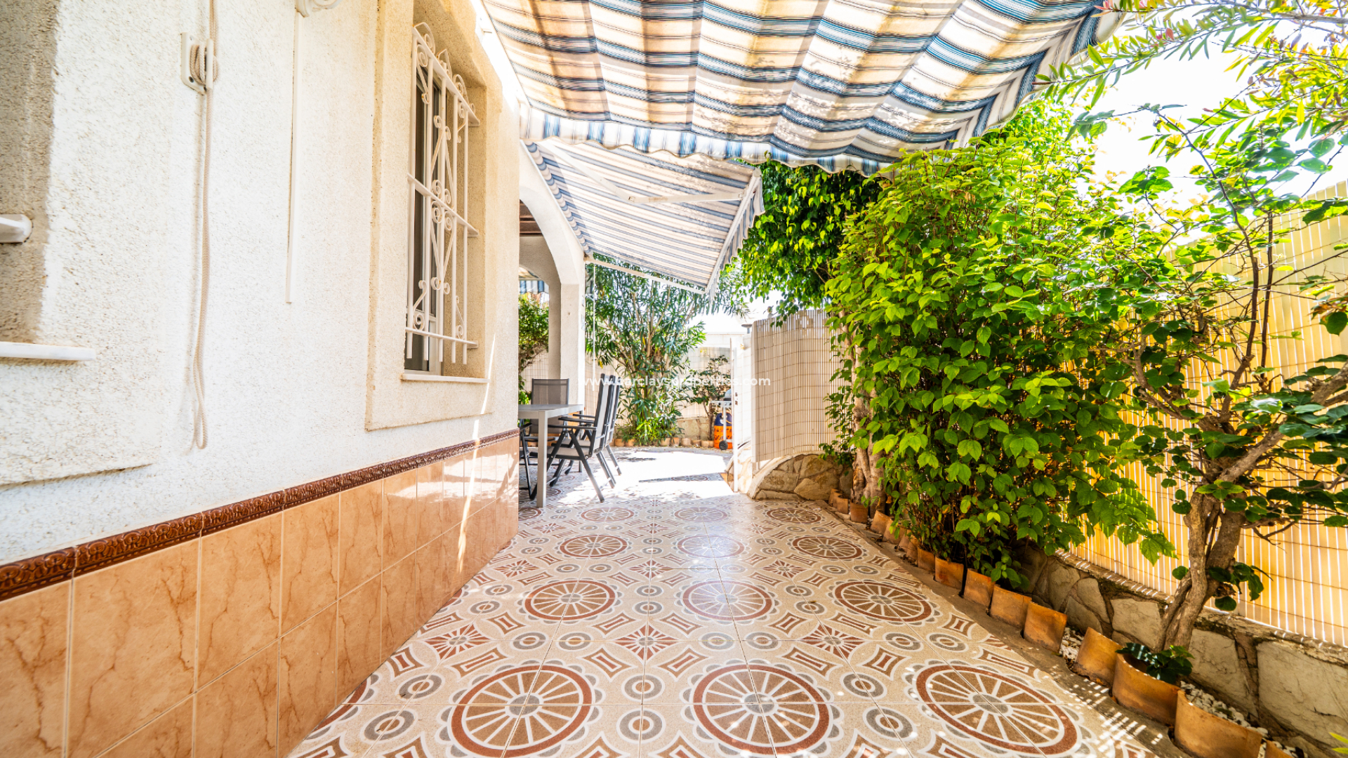 Der vollständig geflieste Garten ist geräumig und wird durch verschiedene Sonnenmarkisen ergänzt, die einen schattigen Außenbereich mit einem Essbereich schaffen, der zur überdachten Veranda und zum Inneren des Hauses führt. Eine Rampe am Eingang bietet einfachen Zugang für Rollstuhlfahrer.