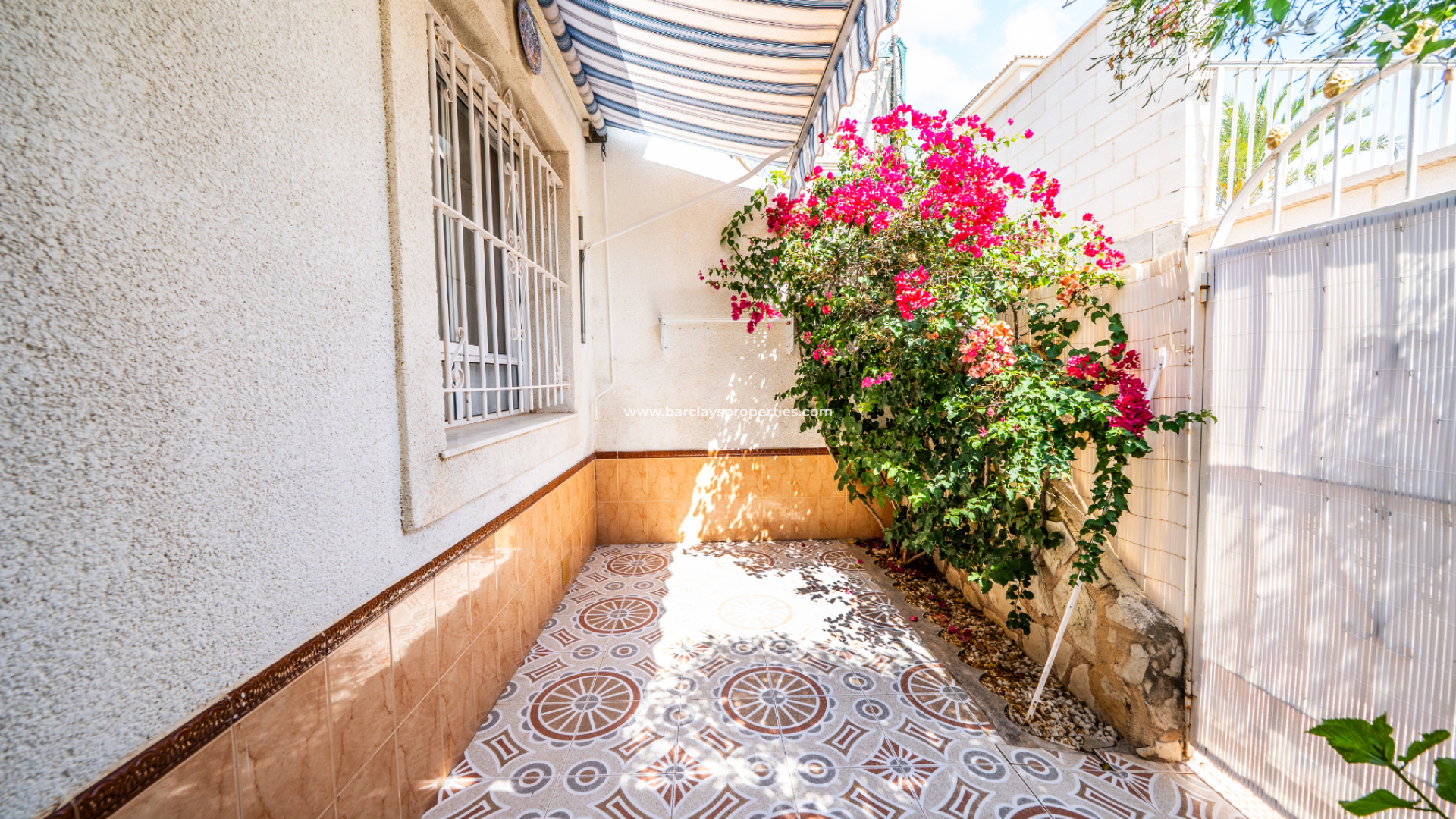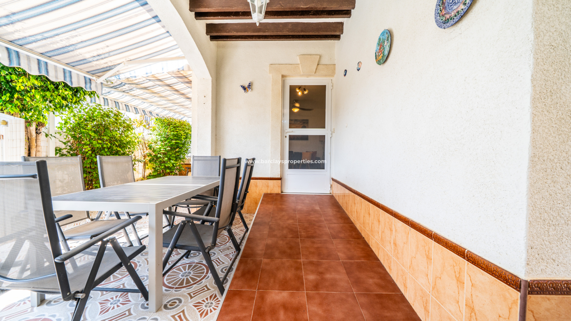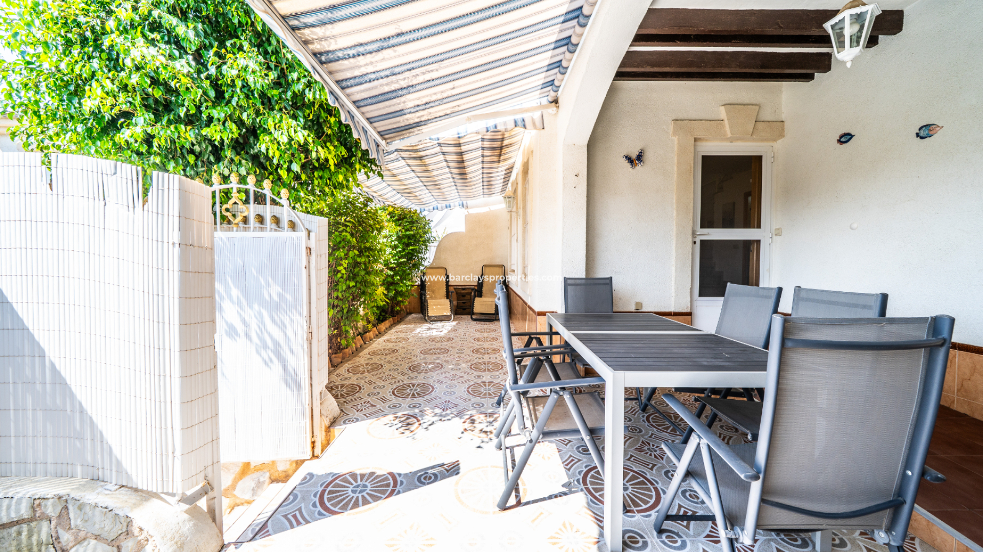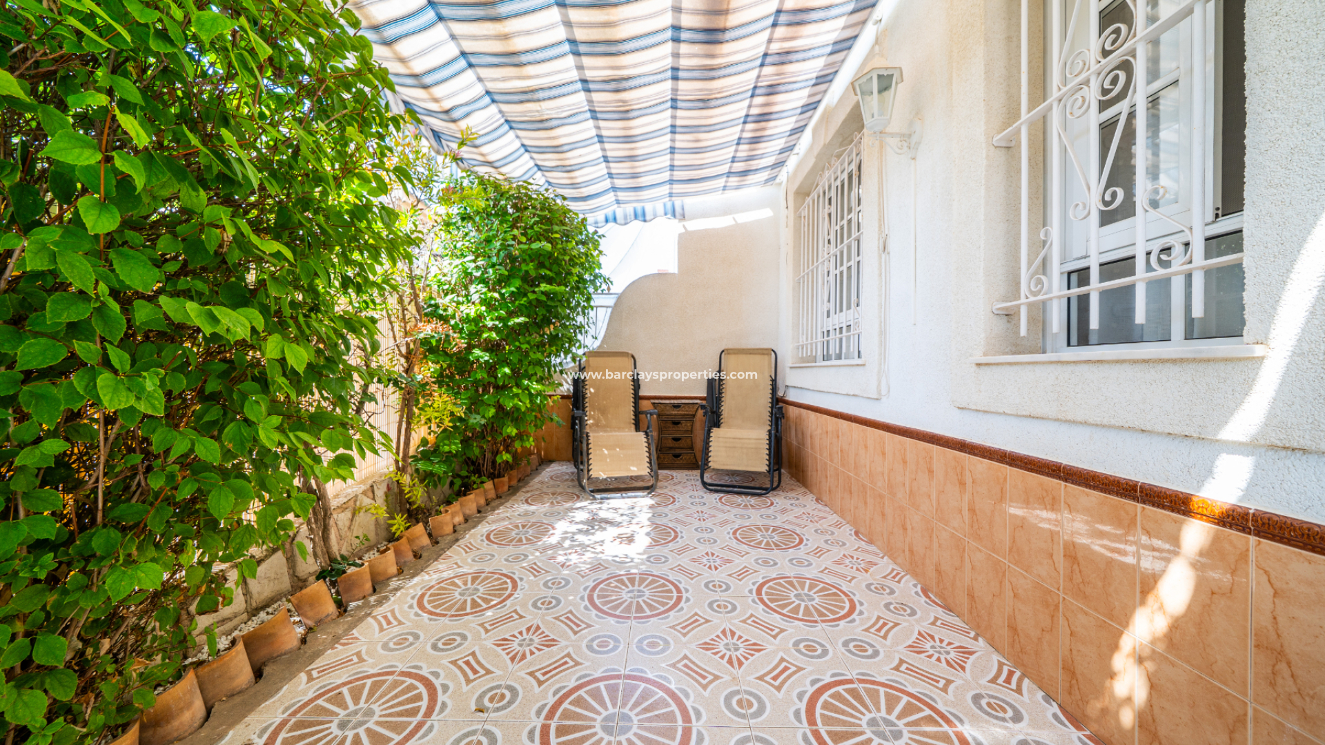 Der vollständig geflieste Garten ist geräumig und wird durch verschiedene Sonnenmarkisen ergänzt, die einen schattigen Außenbereich mit einem Essbereich schaffen, der zur überdachten Veranda und zum Inneren des Hauses führt. Eine Rampe am Eingang bietet einfachen Zugang für Rollstuhlfahrer.