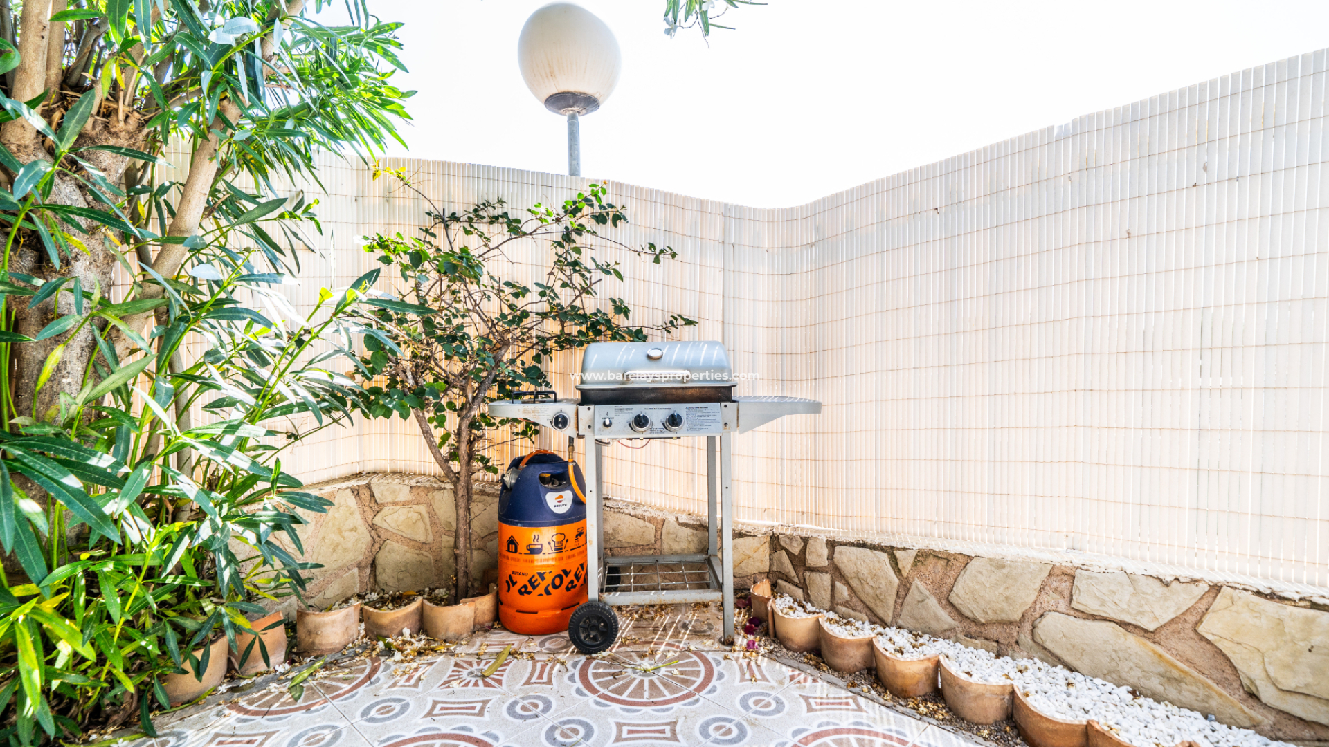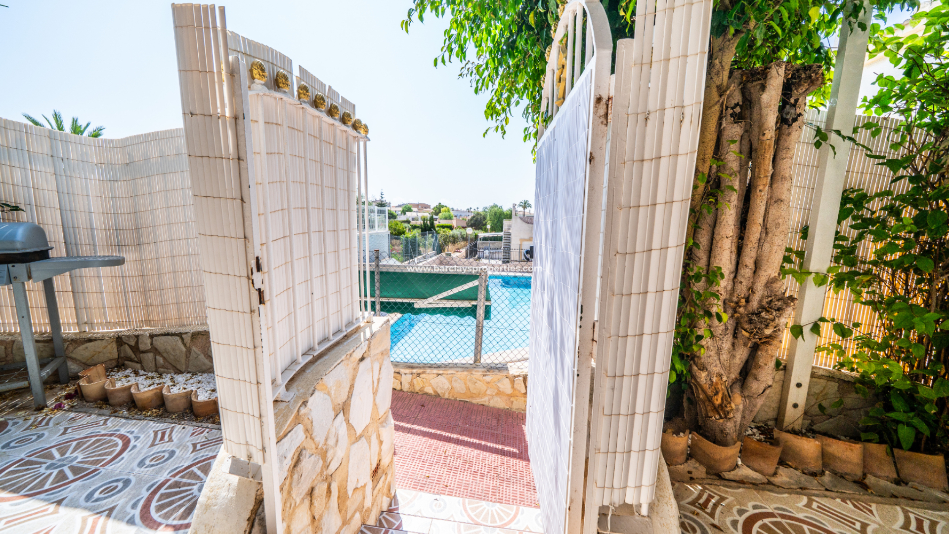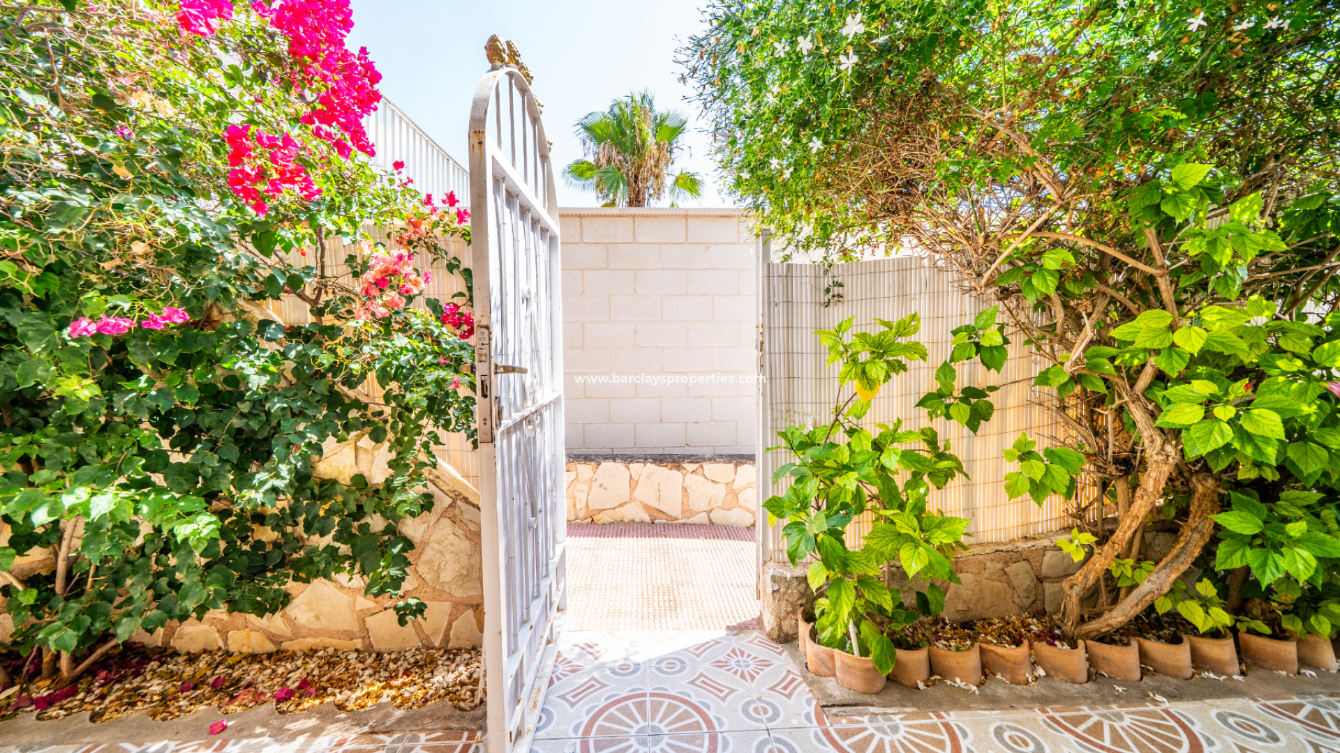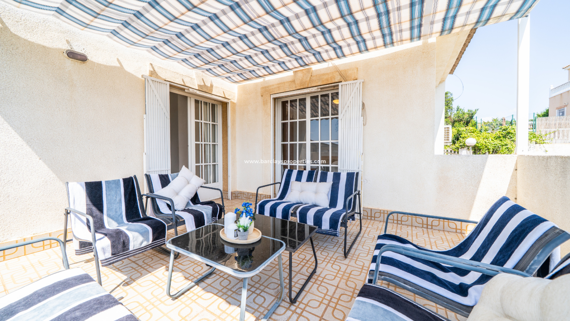 Der vollständig geflieste Garten ist geräumig und wird durch verschiedene Sonnenmarkisen ergänzt, die einen schattigen Außenbereich mit einem Essbereich schaffen, der zur überdachten Veranda und zum Inneren des Hauses führt. Eine Rampe am Eingang bietet einfachen Zugang für Rollstuhlfahrer.