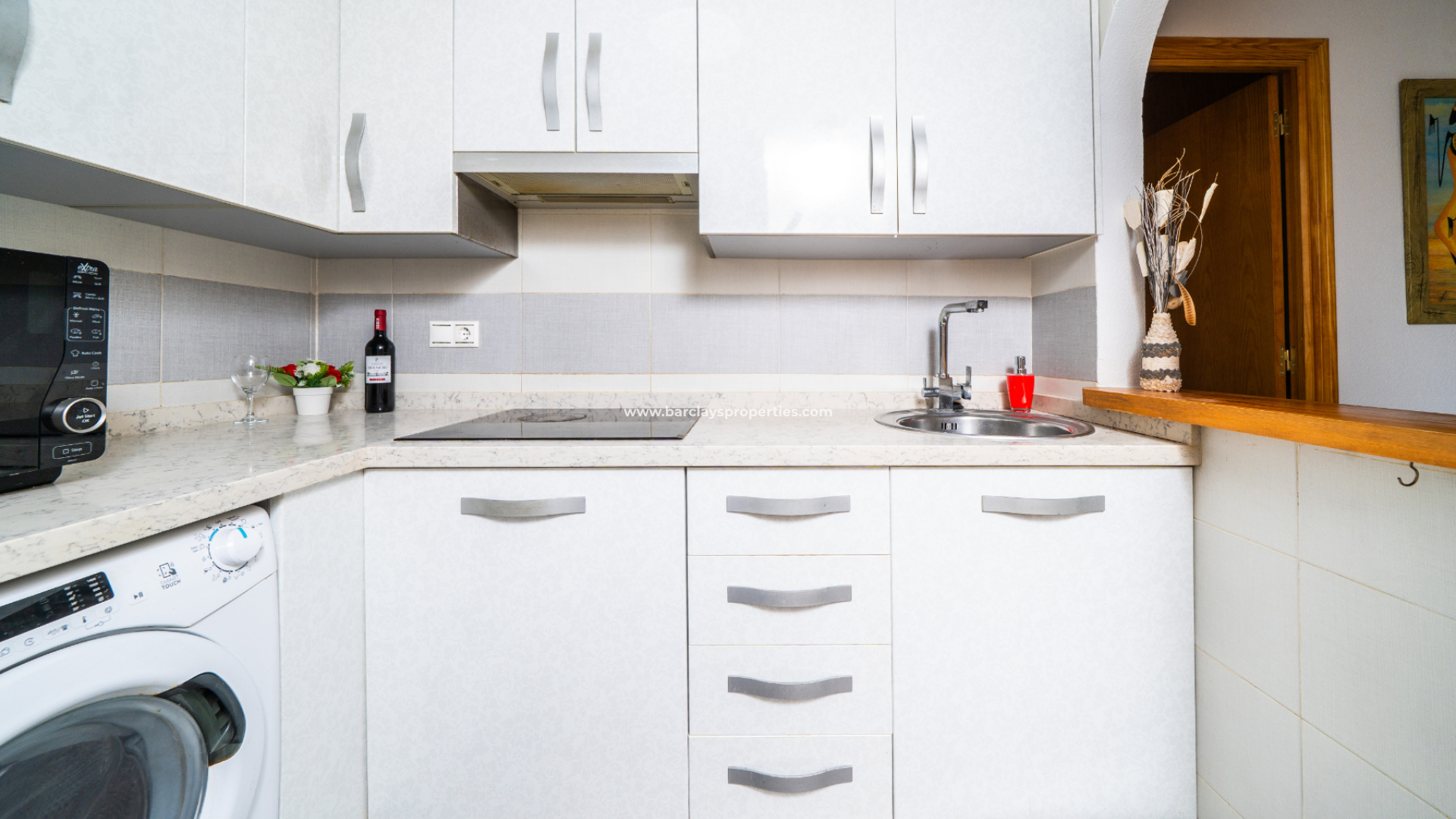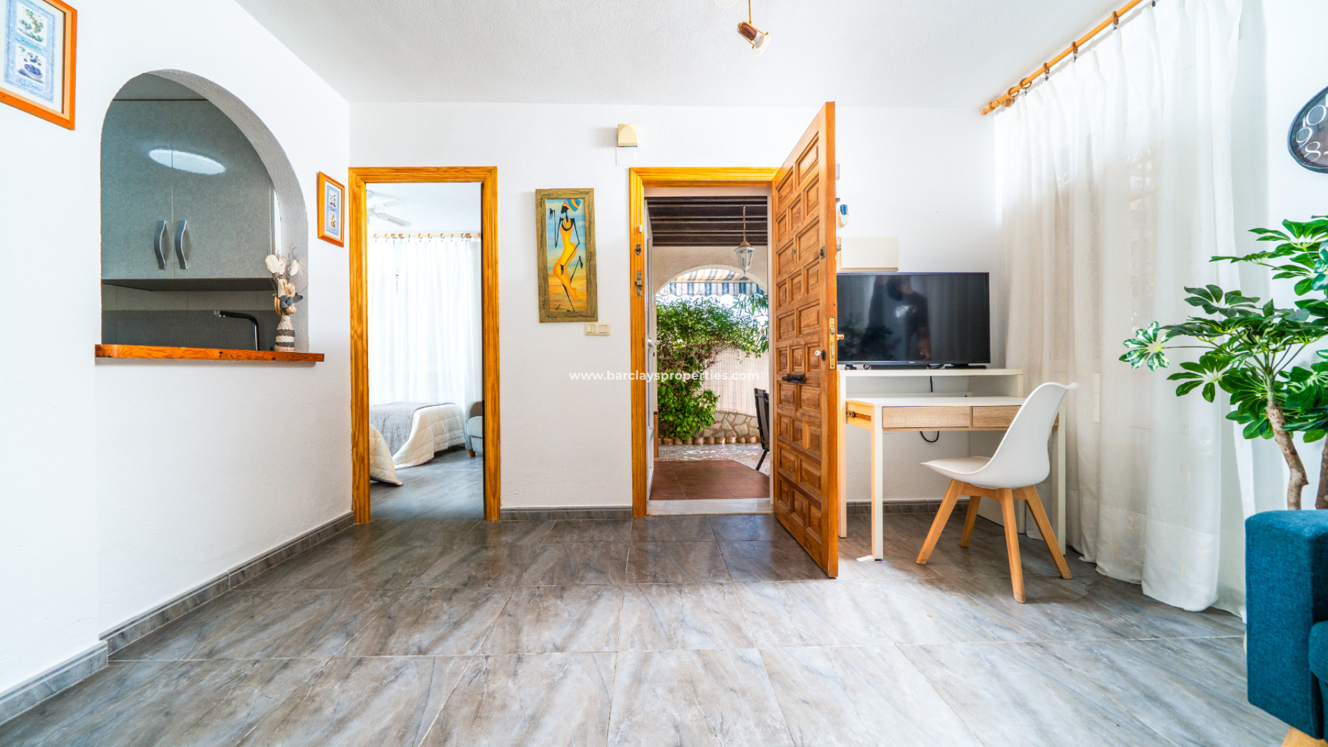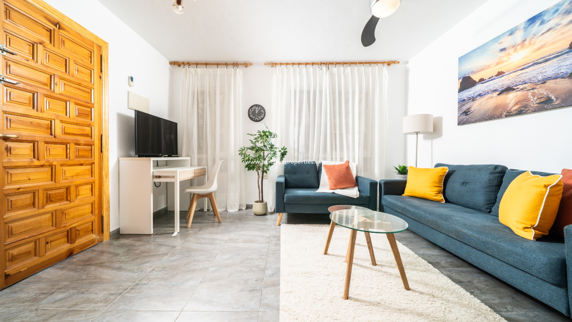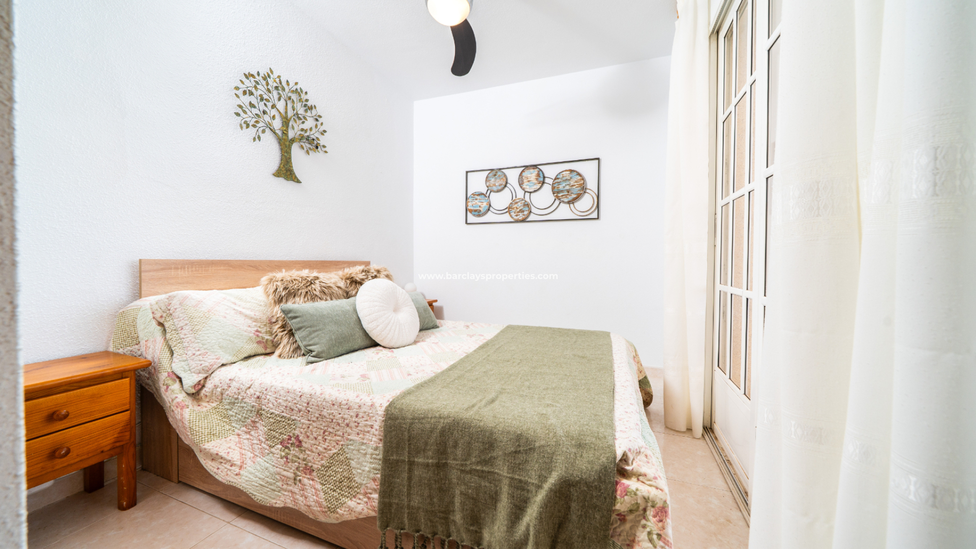 Die Immobilie im Erdgeschoss verfügt über ein helles, farbenfrohes, geräumiges Wohnzimmer mit Deckenventilator, eine voll ausgestattete, frisch aussehende Küche, ein Schlafzimmer mit zwei Einzelbetten, Einbauschränken und einem Deckenventilator sowie ein Badezimmer mit Eckdusche, WC und Waschtisch.