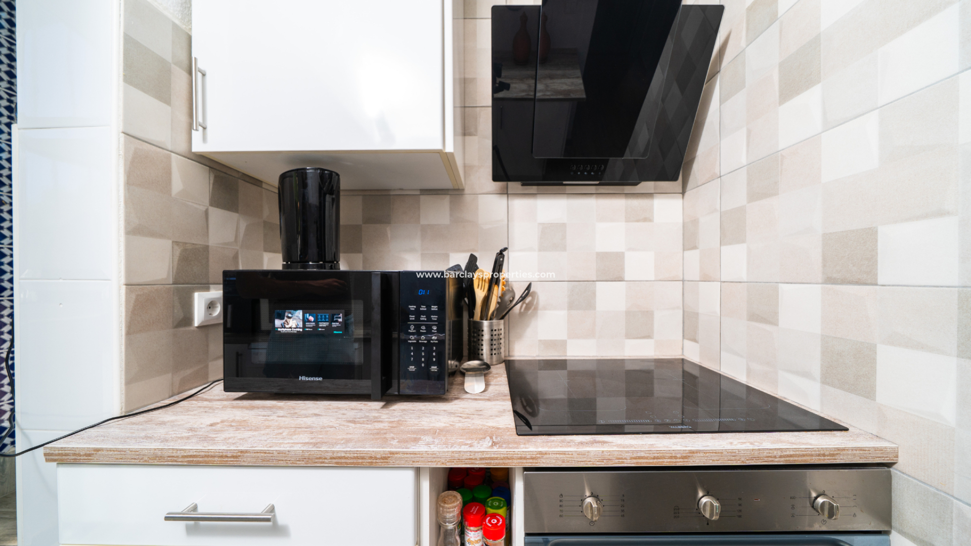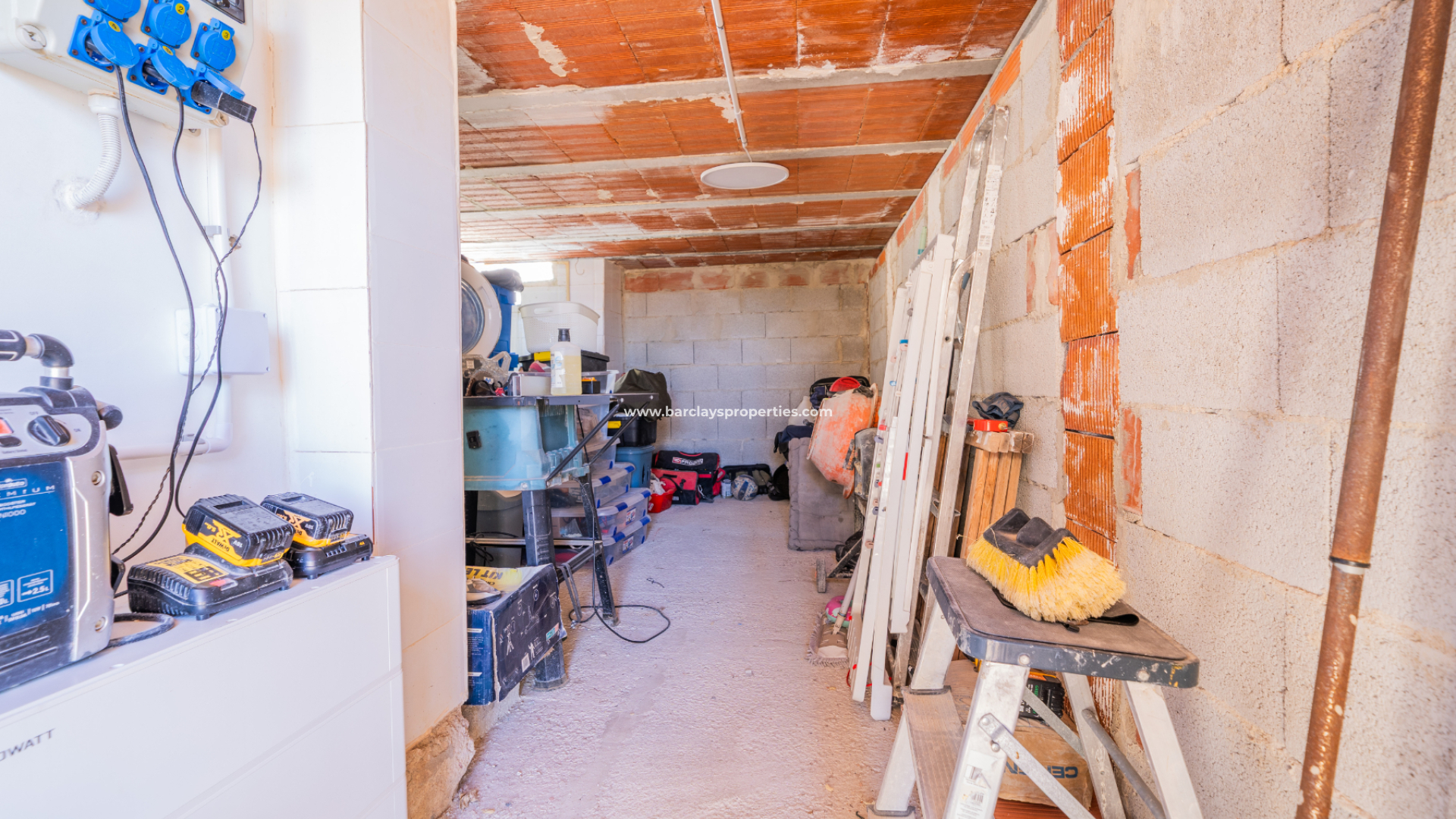 Das Herzstück des Hauses ist das weitläufige Wohnzimmer mit Essbereich, das einen hellen und offenen Raum bietet. Vom Flur aus finden wir ein Schlafzimmer mit Doppelbett, Deckenventilator und Klimaanlage, ein zweites Schlafzimmer mit Doppelbett und Klimaanlage sowie ein Badezimmer mit einer Duschkabine von Wand zu Wand, WC und Waschbecken mit LED-Spiegel. Die Küche mit modern aussehenden Arbeitsflächen und Geräten führt zu einem praktischen Hauswirtschaftsraum mit Zugang zur privaten, erhöhten Terrasse, die mit einer Sonnenmarkise ausgestattet ist und auf das glitzernde ➡️ private Schwimmbad blickt.