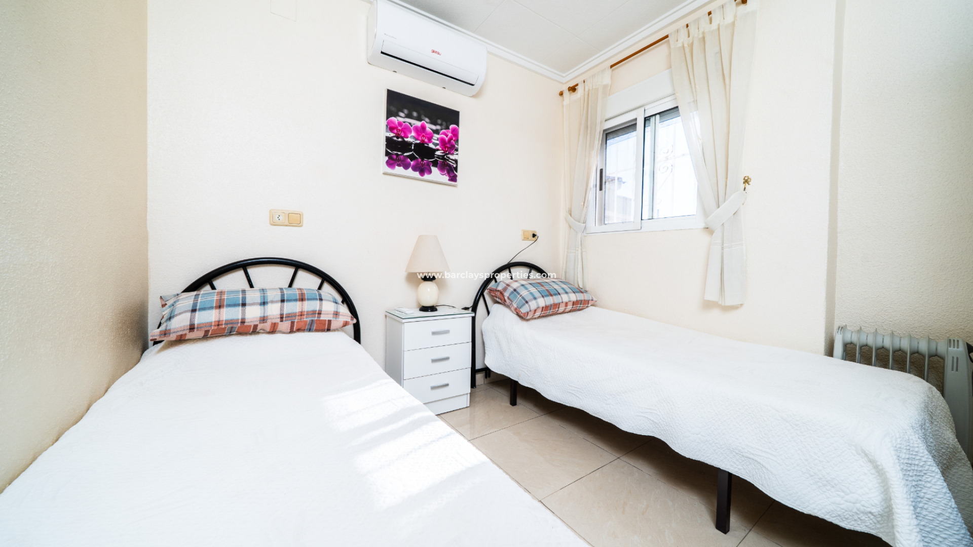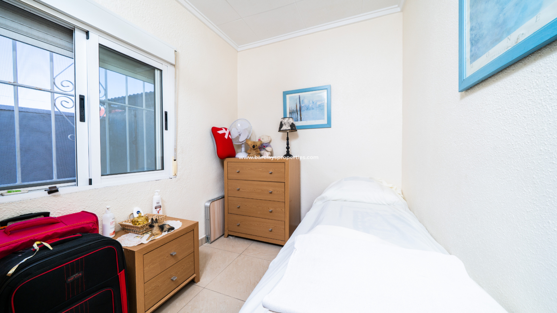 Das Haus bietet drei Schlafzimmer: ein Doppelzimmer mit Einbauschränken, Klimaanlage und Deckenventilator; ein Zweibettzimmer mit Klimaanlage und Deckenventilator; und ein Einzelzimmer mit Deckenventilator. Es gibt zwei Badezimmer – eines mit Dusche, WC, Waschtisch und Dunstabzugshaube, und das andere größere Badezimmer mit Dusche, WC, Waschtisch, Fenster und einem kleinen Abstellschrank am Ende des Flurs.