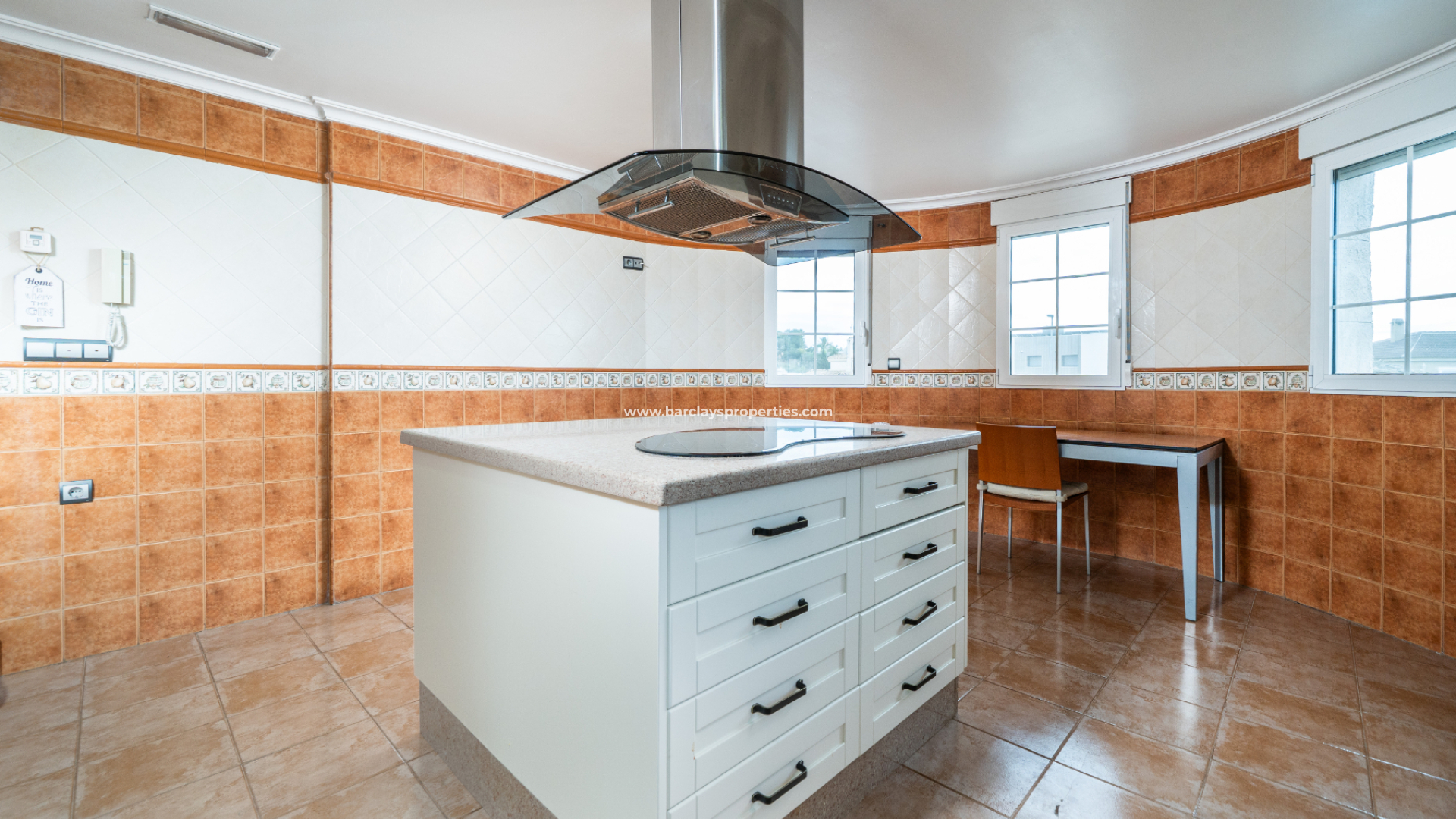 Der Hauptwohnbereich ist hell und geräumig, mit hohen Decken, Laminatboden und Terrassentüren, die direkt auf die Außenterrasse führen. Es gibt einen separaten Essbereich und zwei Kanalklimaanlagen, die einen komfortablen Raum für den Alltag und für Gäste schaffen. Die Küche ist gut proportioniert mit einer großen Kochinsel und Elektrogeräten, ergänzt durch einen separaten Hauswirtschaftsraum und eine Speisekammer, die wertvollen Stauraum und Praktikabilität bieten.