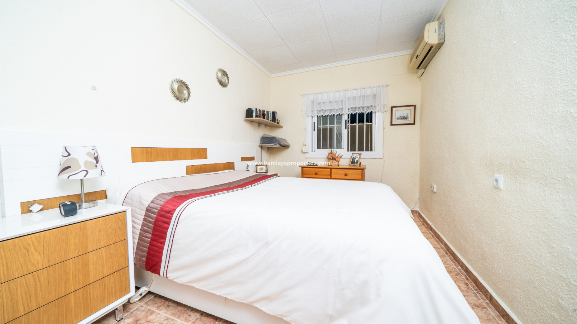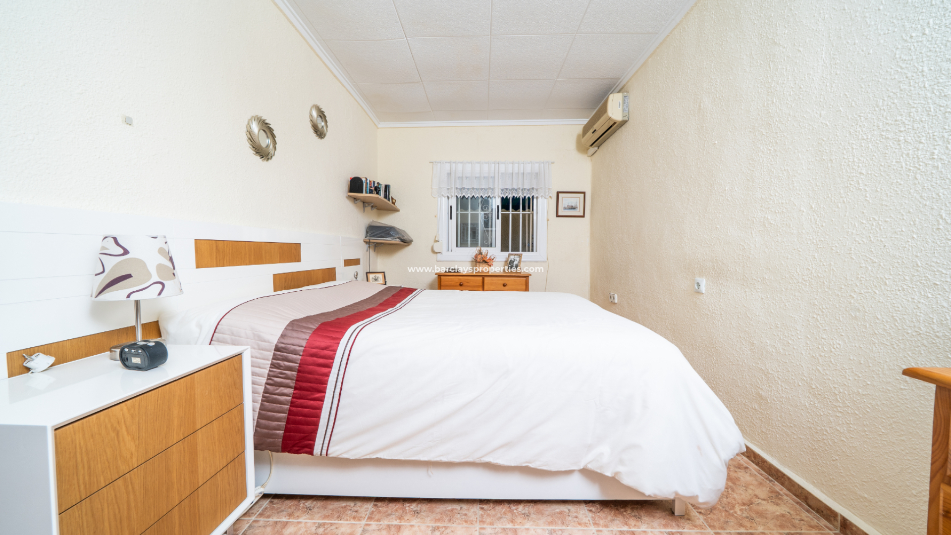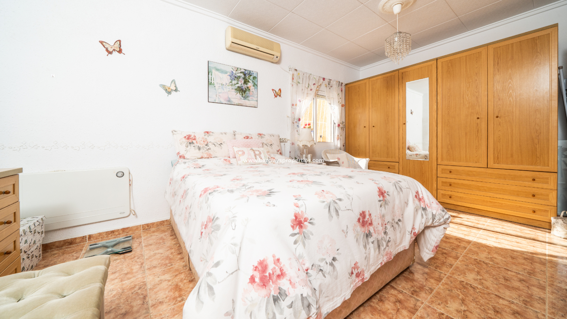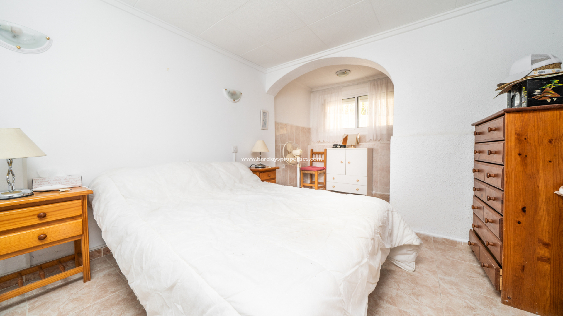 Das Haupthaus verfügt über eine große vordere Sonnenterrasse mit freiem Blick auf die benachbarte Stadt Guardamar del Segura – der perfekte Ort zum Entspannen oder für Gäste. Im Inneren befindet sich ein geräumiges Wohnzimmer mit Deckenventilator, das zu zwei gut proportionierten Schlafzimmern führt. Das Hauptschlafzimmer ist ein sehr geräumiger, heller Raum mit Einbauschränken und Klimaanlage. Das zweite Schlafzimmer ist ein komfortables Doppelzimmer, ebenfalls mit Einbauschränken und Klimaanlage. Das Hauptbadezimmer wurde modernisiert und verfügt über eine große begehbare Dusche, ein WC und einen Waschbeckenunterschrank.