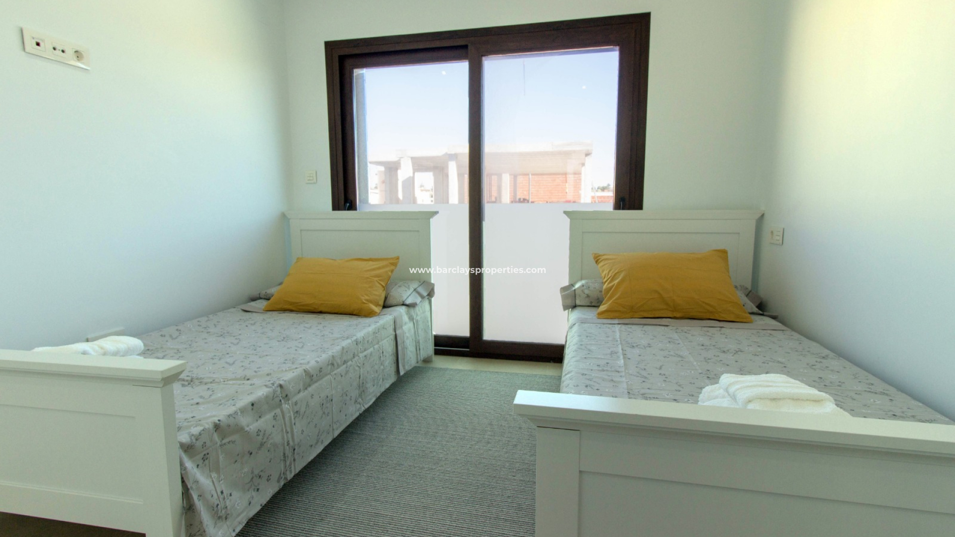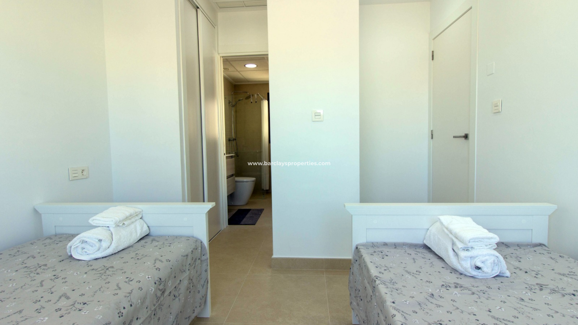 Das Obergeschoss umfasst zwei weitere Doppelschlafzimmer, die beide auf ein sonnendurchflutetes Solarium führen, das einen herrlichen Blick auf die Berge bietet. Ein Gemeinschaftsbad auf dieser Etage ist mit einer begehbaren, wandhohen Dusche ausgestattet und bietet Komfort und Funktionalität für Familie oder Gäste.