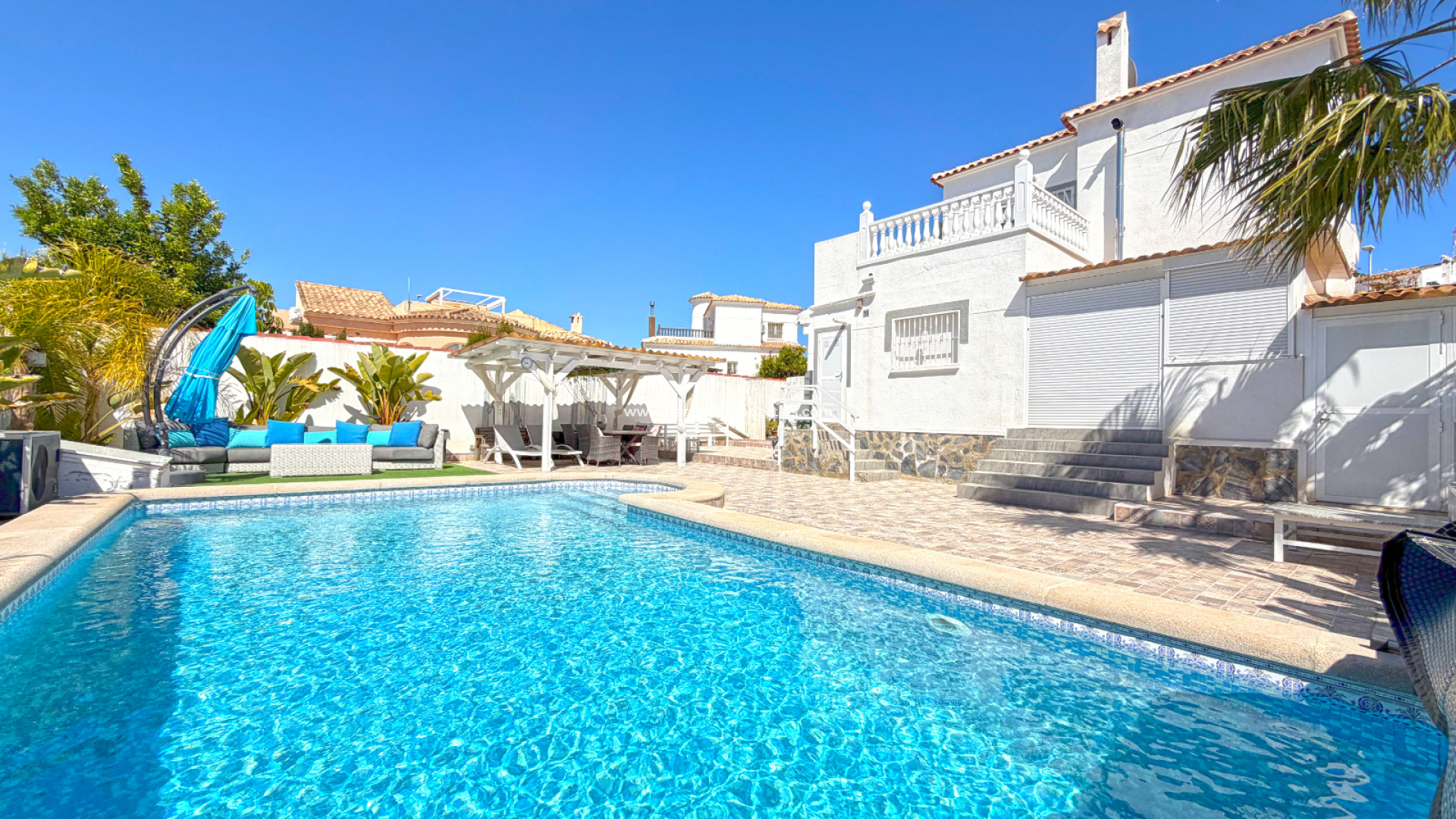 Das Haus wird komplett möbliert angeboten und ist mit Klimaanlage sowie doppelt verglasten Fenstern ausgestattet, was ganzjährigen Komfort gewährleistet. Der helle Innenbereich geht nahtlos in den Außenbereich über, wo sich ein privater Pool befindet – perfekt zum Entspannen oder für gesellige Stunden.