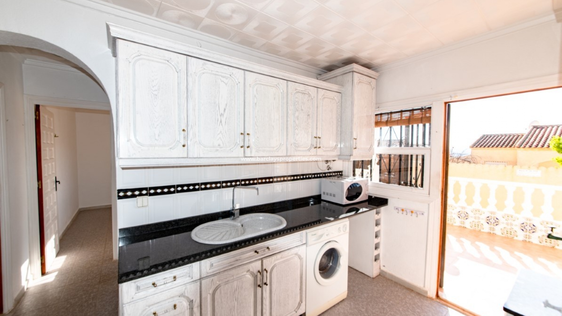 EXKLUSIV präsentiert dieses beeindruckende freistehende Anwesen, ein Modell "Rosa", das in einer ruhigen Gegend von La Marina Urbanization zum Verkauf steht. Dieses reizvolle Anwesen in Südlage befindet sich auf einem großen Eckgrundstück in einer ruhigen Sackgasse und bietet Parkplätze an der Vorderseite, einen privaten 5 x 5-Pool und eine gepflegte Grünfläche an der Rückseite. Mit nur 10 Gehminuten zum nächsten Gewerbegebiet befindet sich dieses Anwesen in bester Lage mit atemberaubendem Blick auf die Berge vom Sonnensolarium auf dem Dach.