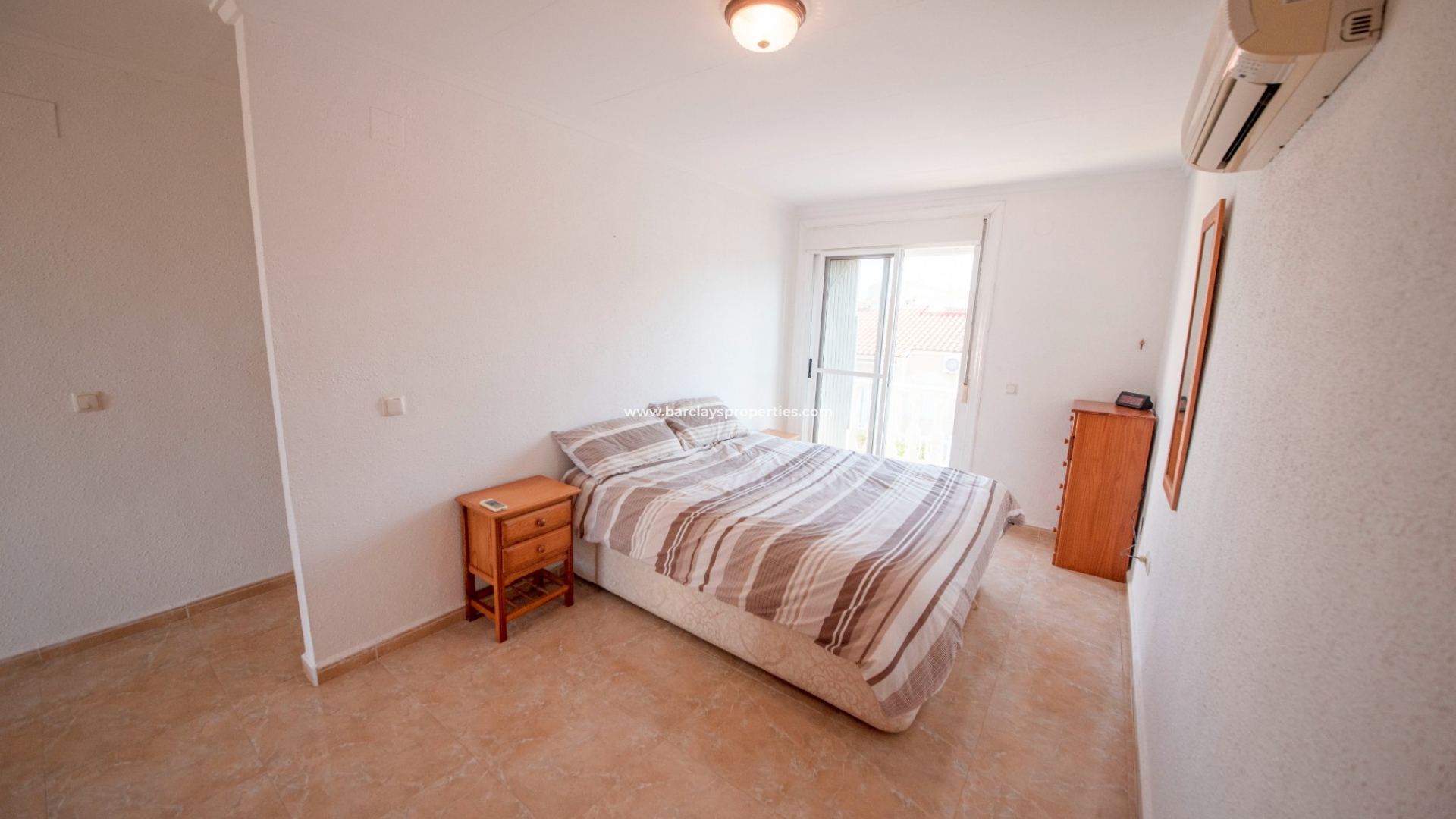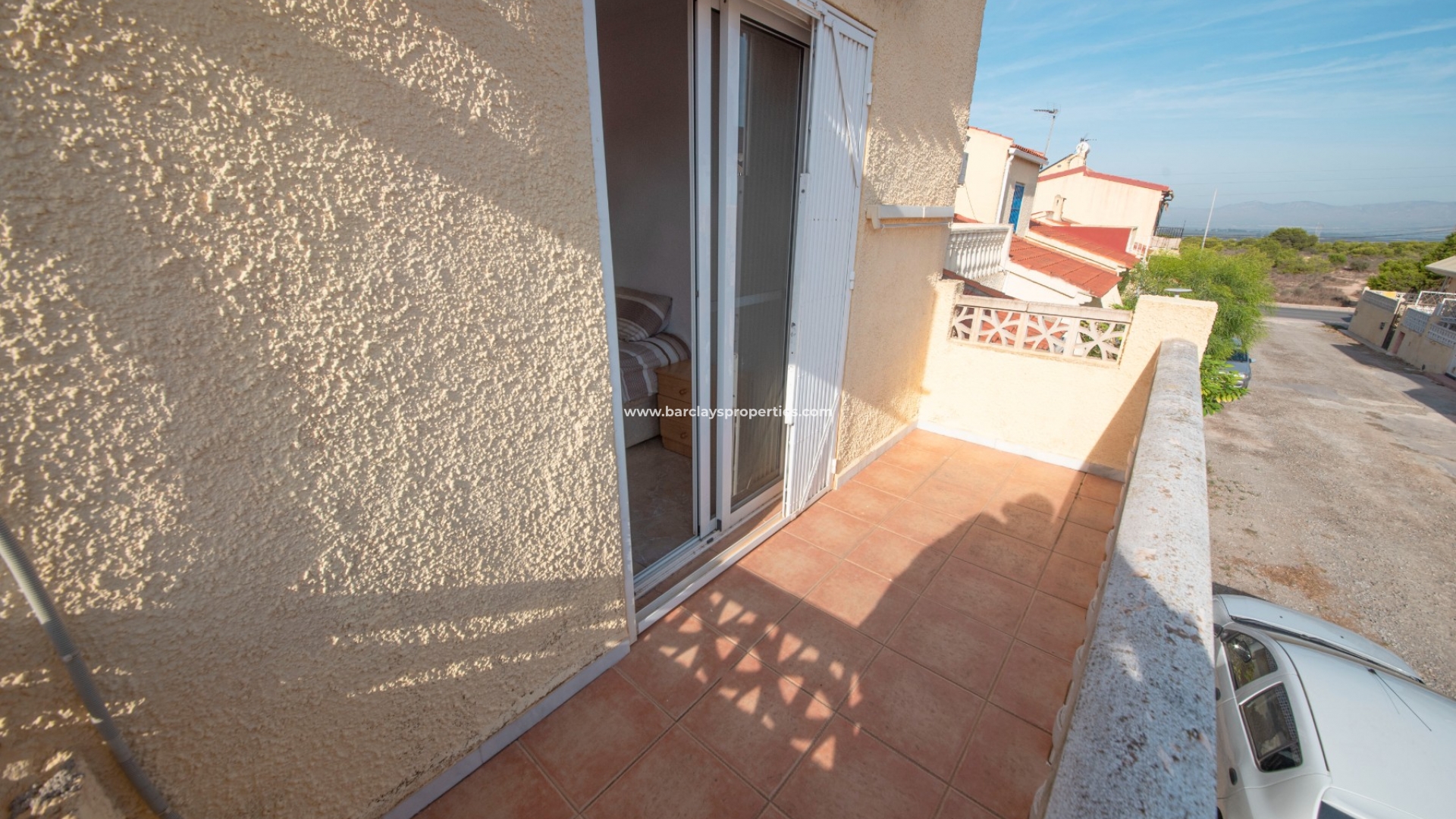 Innentreppen führen in die obere Etage und das geräumige Hauptschlafzimmer mit Schiebetüren zur Terrasse mit herrlichem Bergblick. Es gibt ein geräumiges, komplett gefliestes Badezimmer mit einer Badewanne in voller Größe und Zugang zum Sonnensolarium mit Sonnenmarkise durch Terrassen-Schiebetüren.