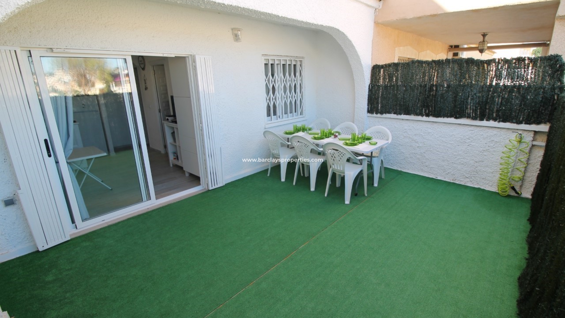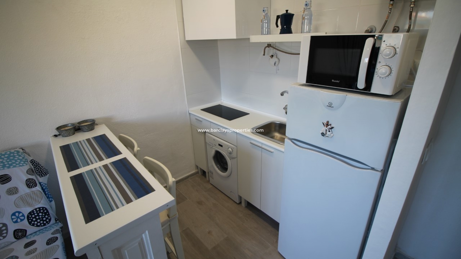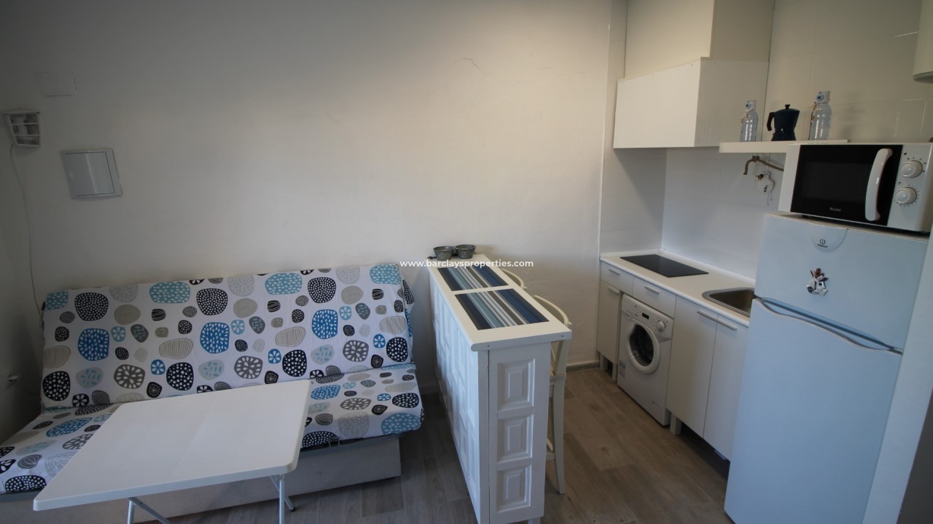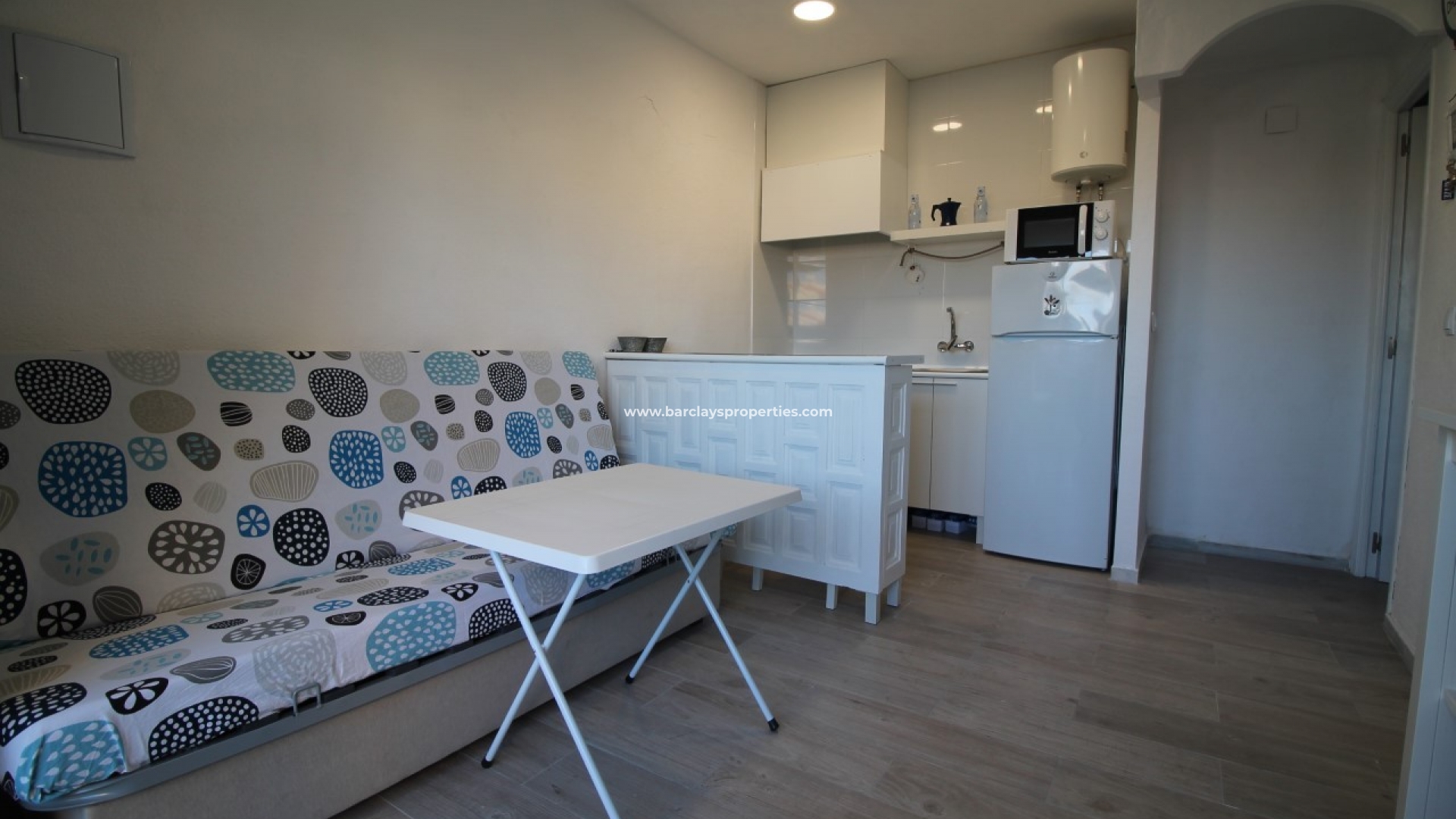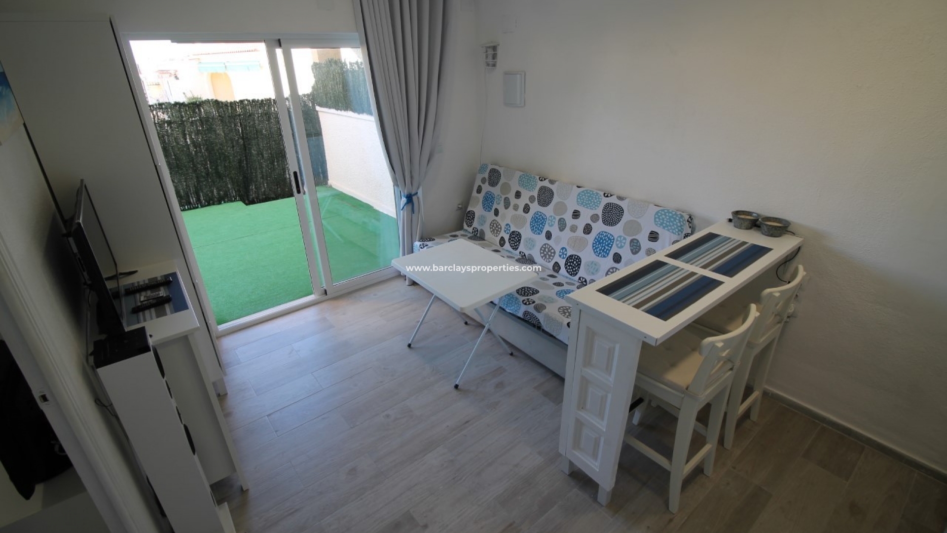 Dieses charmante Anwesen wurde komplett renoviert und befindet sich in einem makellosen Zustand. Die geräumige vordere Terrasse bietet eine Kunstrasenfläche und einen Essbereich im Freien, von wo aus Sie das mediterrane Wetter genießen können. Terrassentüren führen in das Innere des Anwesens, wo wir das Wohnzimmer mit offener Küche und Frühstücksbar, ein Schlafzimmer mit Doppelbett und ein neu renoviertes Badezimmer finden.