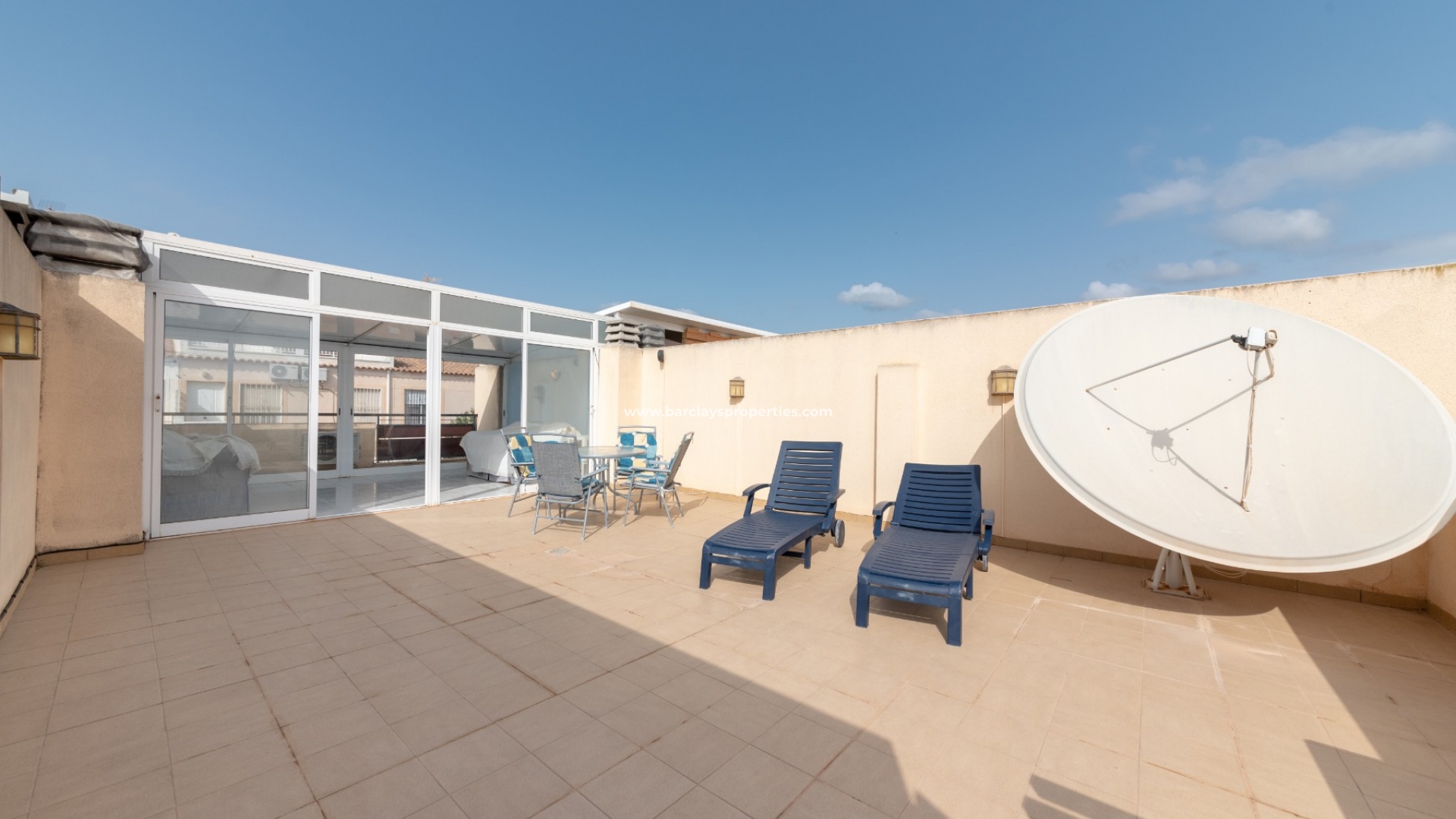 Die obere Ebene des Hauses ist über eine Außentreppe zu erreichen und bietet eine große private Sonnenterrasse mit Sitzgelegenheiten und Liegeflächen im Freien. Die Sonnenterrasse bietet Meerblick und einen verglasten Wintergarten, der ideal ist, um Gäste zu bewirten, zu grillen oder einfach in Ruhe zu entspannen.
