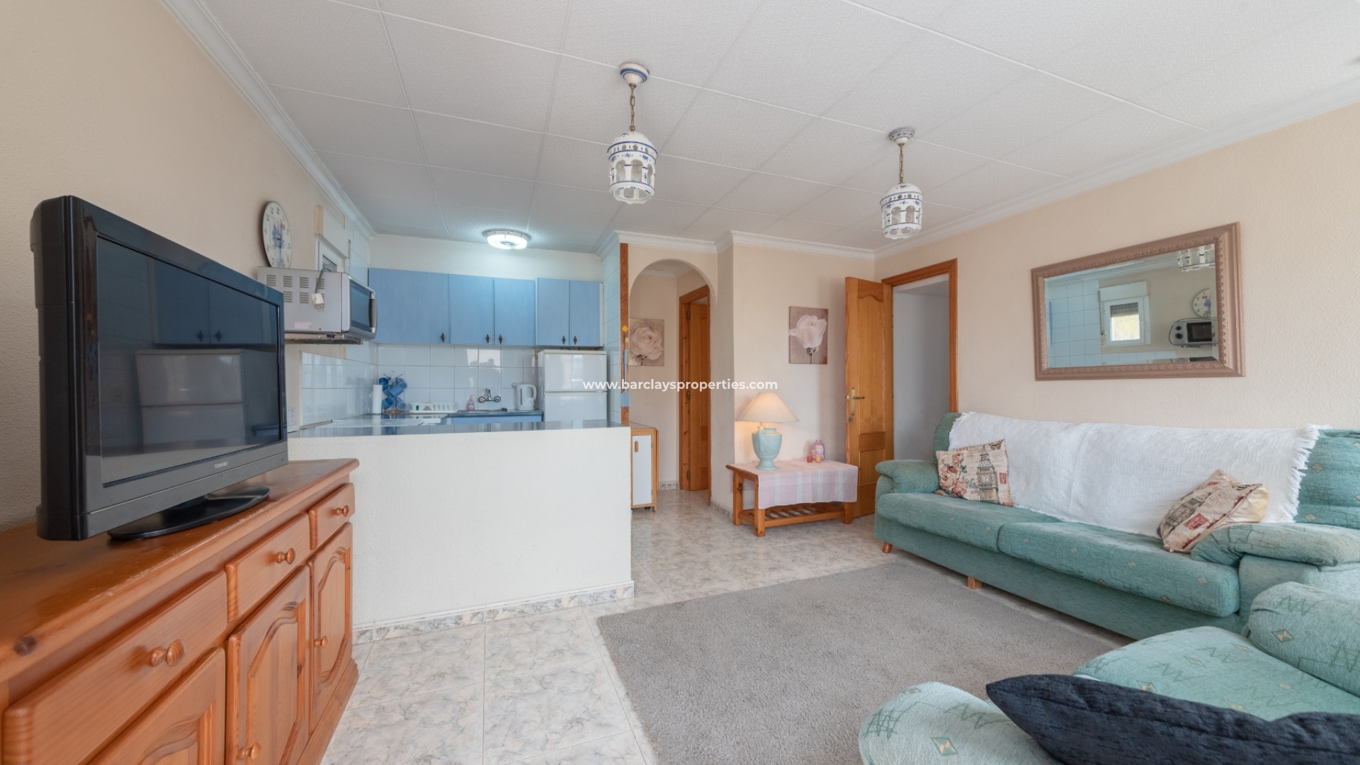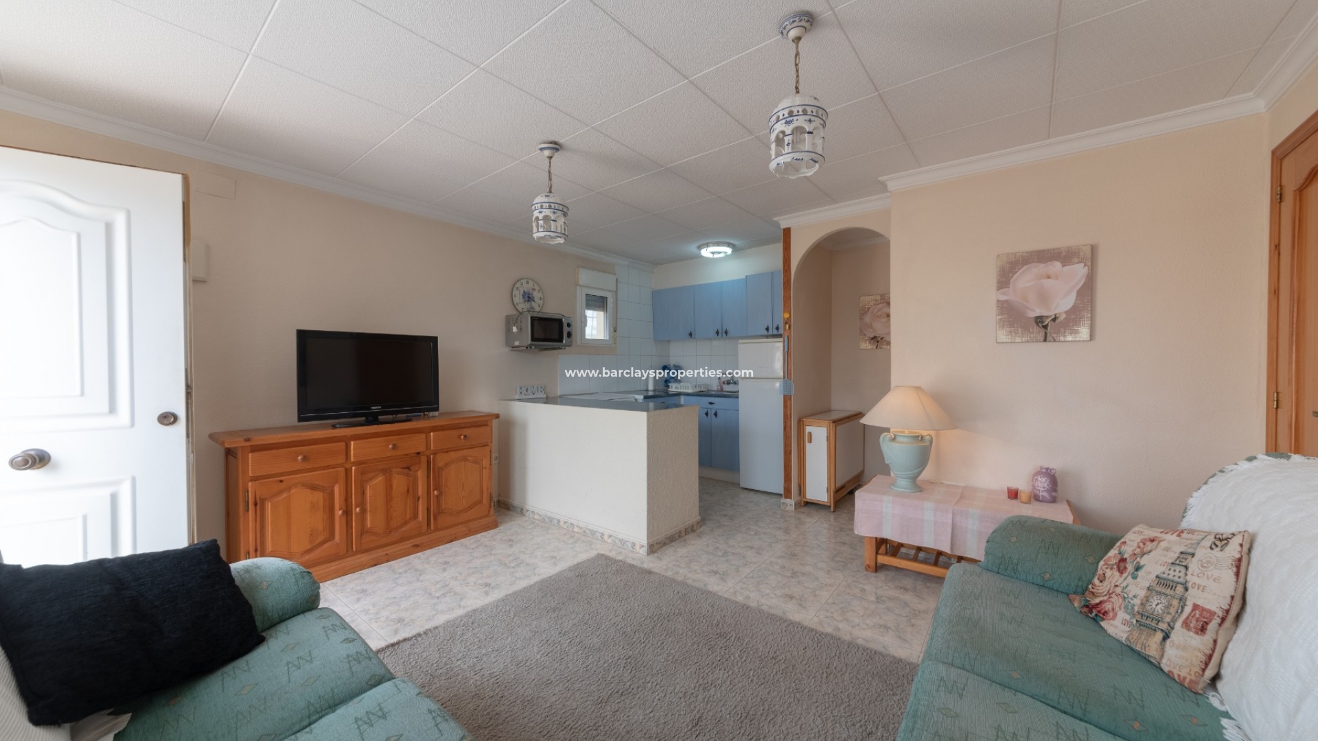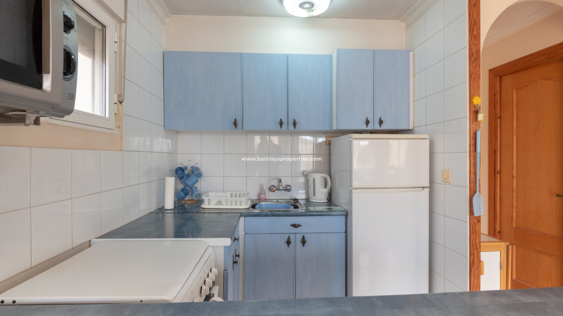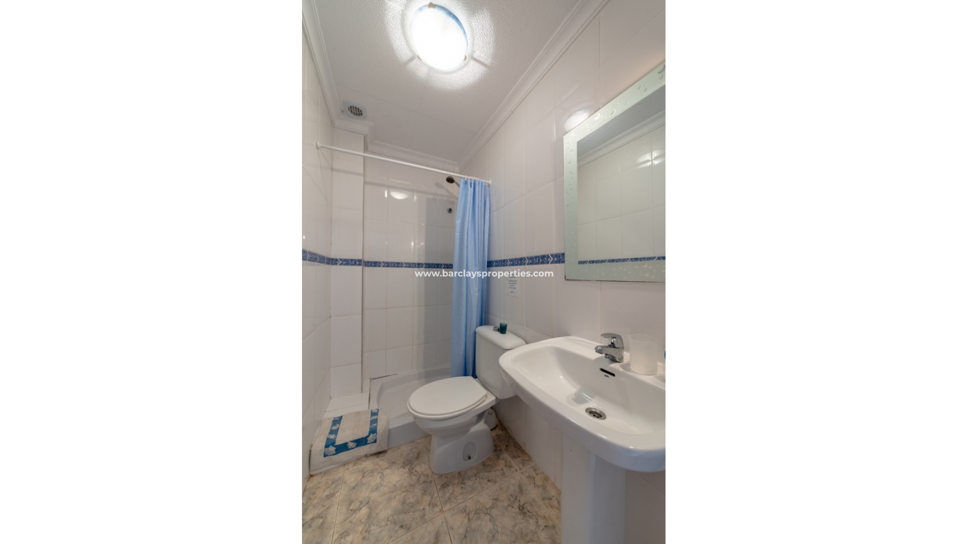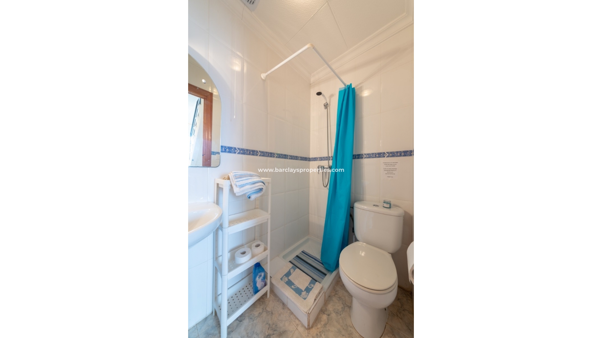 Man betritt das Anwesen durch das Eingangstor, das zu einer erhöhten Terrasse mit Sonnensegel und einem Essbereich im Freien führt, um im warmen spanischen Klima, das wir hier an der Costa Blanca genießen, im Freien zu essen. Von hier aus betreten wir das Innere der Immobilie durch eine Sicherheitstür, um das luftige und helle Wohnzimmer mit zwei großen Fenstern zu finden, die viel natürliches Licht in das Erdgeschoss fließen lassen. Der Wohnbereich hat auch eine offene Einbauküche mit Frühstücksbar. Die Treppe führt uns in den ersten Stock, wo wir ein weiteres Badezimmer mit Eckdusche und zwei Doppelschlafzimmer mit Deckenventilatoren vorfinden. Der Treppenabsatz im ersten Stock hat zwei große Fenster, durch die natürliches Licht in diesen Teil des Hauses fällt. Vom ersten Stock führt eine Treppe auf die Dachterrasse mit Sitzgelegenheit, Außenbeleuchtung und Blick auf den Gemeinschaftspool und die Berge.
