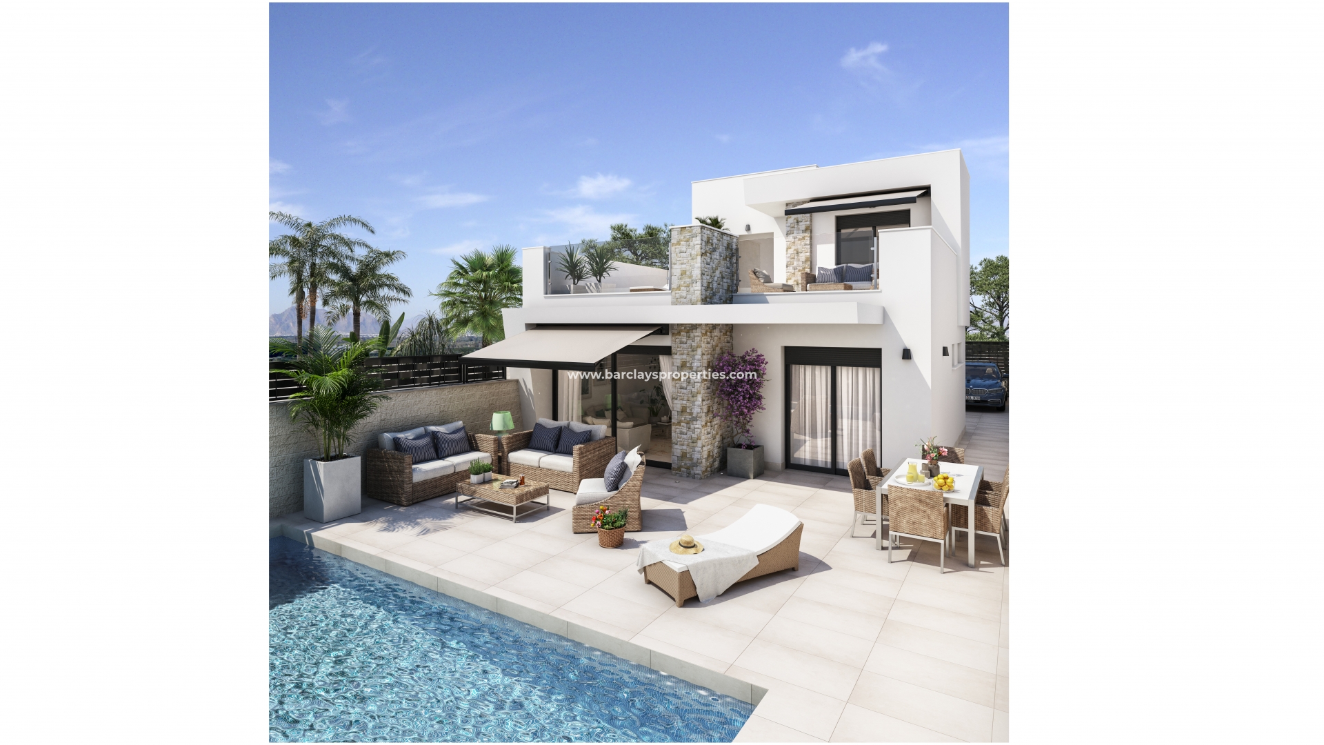 Die Villen wurden wunderschön gestaltet und bieten einen echten mediterranen Stil, der natürliche Elemente wie Stein und wärmere Farben im gesamten Haus beinhaltet. Der private Swimmingpool ist der Mittelpunkt des Anwesens. Alle Schlafzimmer haben Blick auf den Pool, ebenso wie der Wohn- und Essbereich.