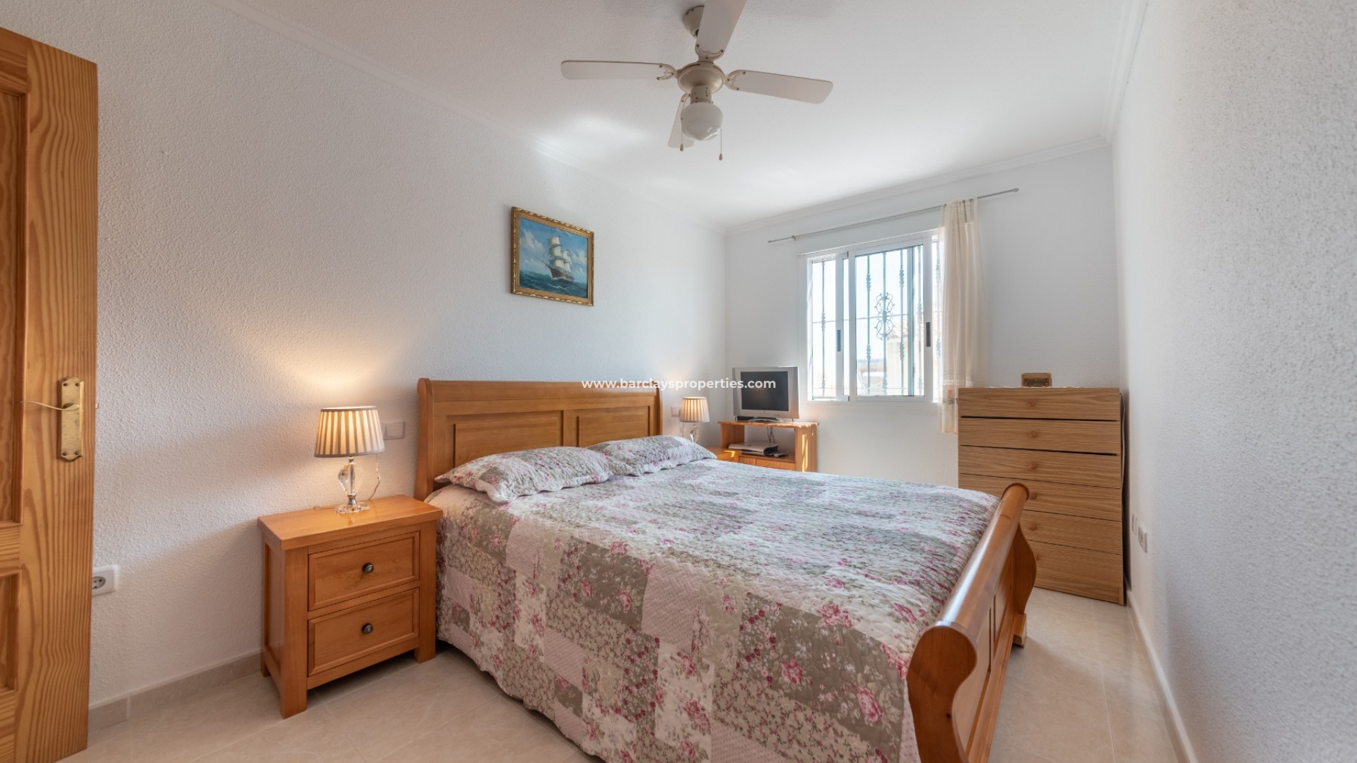 Eine elegante Treppe führt in die nächste Etage, wo sich zwei geräumige Doppelschlafzimmer und ein voll ausgestattetes Badezimmer mit Eckdusche befinden. Auf der nächsten Etage befindet sich ein großer Abstell- und Hauswirtschaftsraum und der Zugang zur privaten Sonnenterrasse des Hauses, die einen Panoramablick bis zum Meer bietet. Es ist ein spektakulärer Bereich, um sich in der Sonne mit einem kalten Getränk zu entspannen und die lang ersehnte Sonnenbräune zu bekommen!