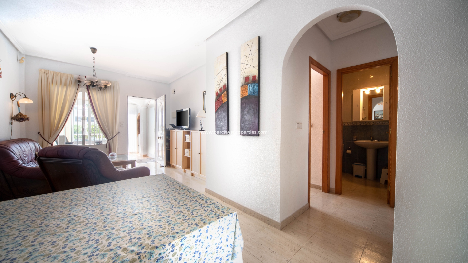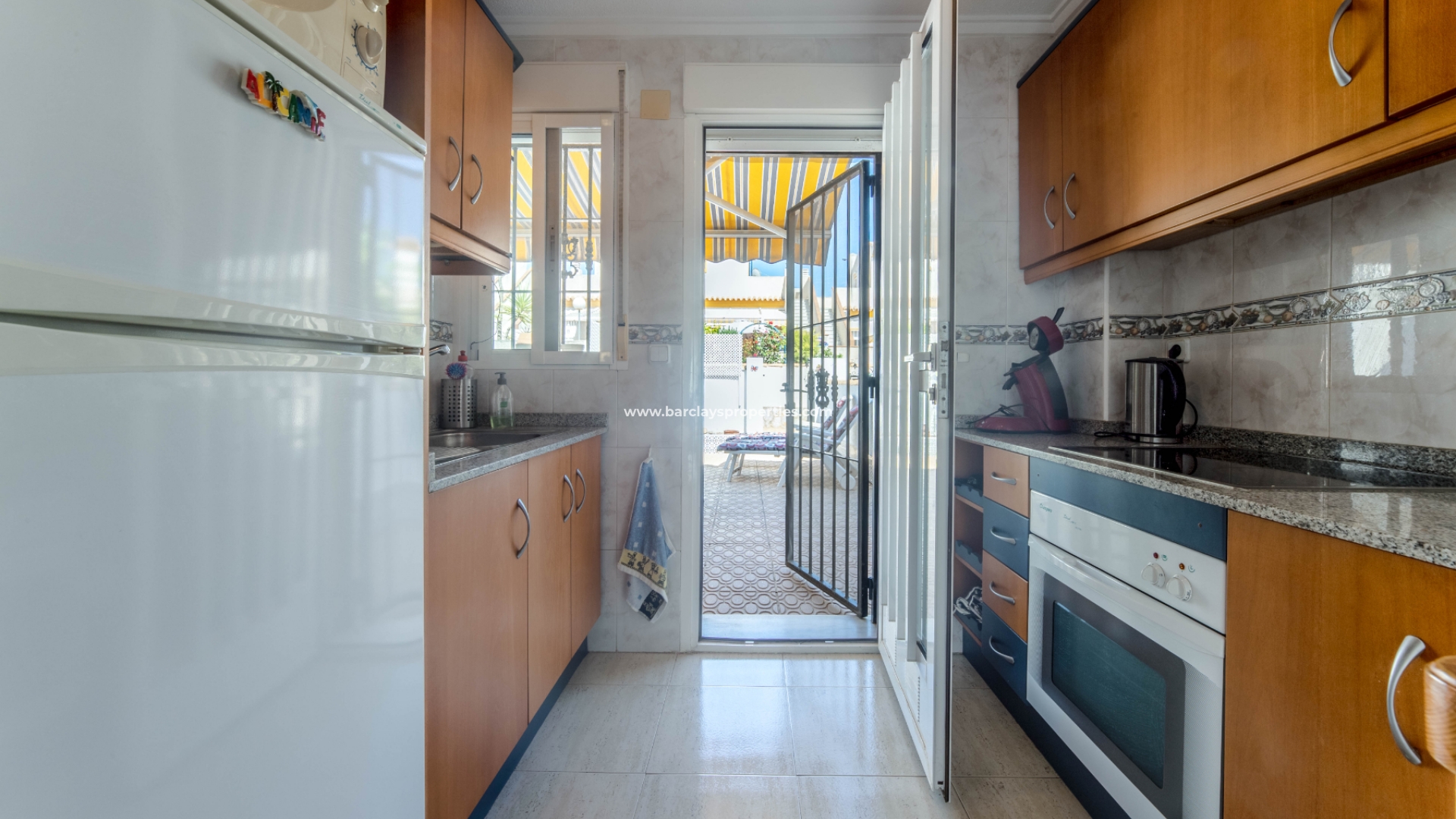 Diese geräumige, nach Südwesten ausgerichtete Reihenimmobilie befindet sich in einer kleinen, ruhigen Gemeinde, die als "Urbanisation Monte Victoria" bekannt ist, und liegt ganz in der Nähe aller Annehmlichkeiten der Urbanisation La Marina an der Costa Blanca. In einer erstklassigen Lage in Urb La Marina und mit Zugang zu einem Gemeinschaftspool mit Kinderbecken, Außenduschen und Sitzgelegenheiten hat diese charmante Reihenvilla viel zu bieten. Der mit der Blauen Flagge ausgezeichnete Strand von La Marina Village ist nur 5 Minuten mit dem Auto entfernt und der nächste Flughafen Alicante-Elche ist nur 25 Minuten entlang der Küstenstraße entfernt.