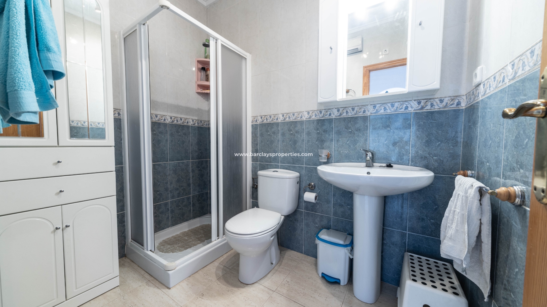 Die restlichen Räume im Erdgeschoss sind ein Badezimmer mit Heizkörper, Eckdusche, Waschbecken mit Spiegel, Ablage und WC sowie zwei Schlafzimmer mit Einbauschränken, wobei das größere Schlafzimmer über eine Klimaanlage verfügt.
