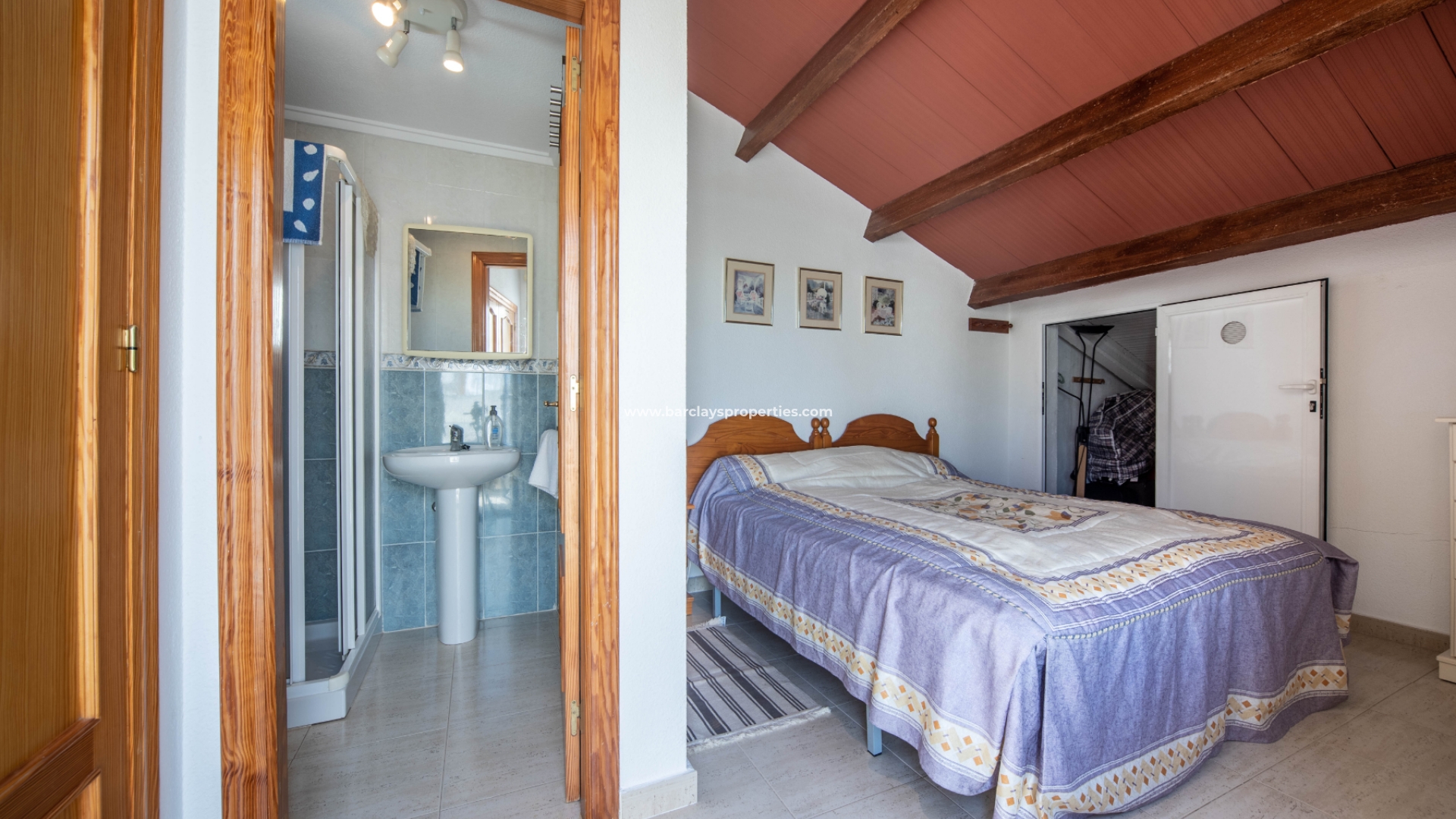 Eine Außentreppe mit darunter liegendem Abstellraum führt zum separaten Gästeapartment, das über ein Schlafzimmer mit Doppelbett und Klimaanlage, Holzbalken an der Decke, einen Einbauschrank und ein Badezimmer mit Eckdusche, WC und Waschbecken verfügt. Dieser Teil des Anwesens hat eine eigene Sonnenterrasse mit Blick auf den Swimmingpool.