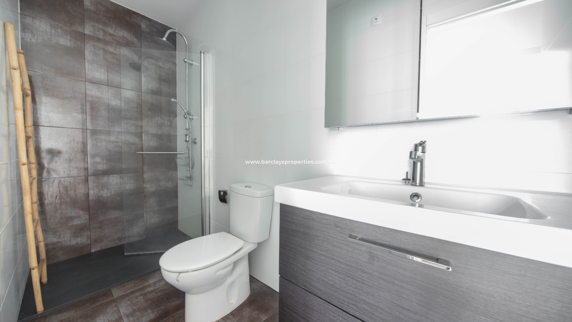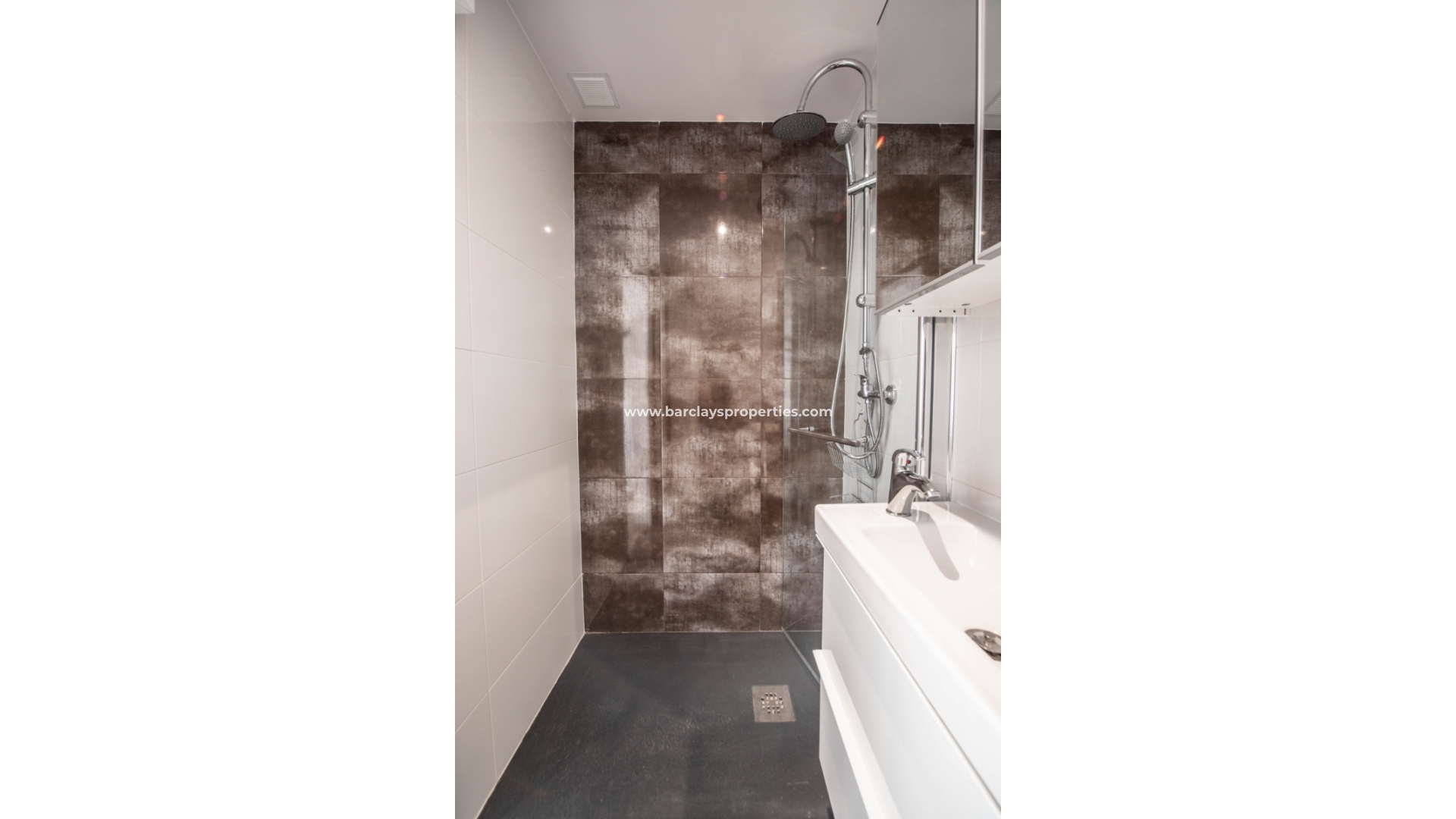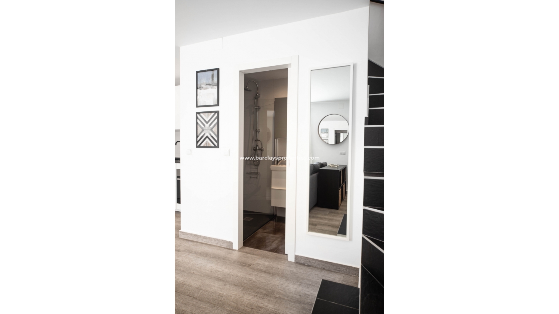 Bei der Annäherung sehen wir sofort diese beeindruckende, modern aussehende Immobilie und wir werden von einer Sonnenterrasse mit kleinem Abstellraum und einem Sitzbereich im Freien mit Sonnenmarkisen begrüßt. Durch die Aluminium-Sicherheitstür gelangt man in das Innere des Hauses, das komplett renoviert wurde und ein helles und luftiges Wohnzimmer mit Klimaanlage, Essbereich und offener Küche mit Kühl-/Gefrierschrank, Ofen und Dunstabzugshaube bietet. Ebenfalls im Erdgeschoss finden wir ein modernes Badezimmer mit begehbarer Dusche und WC.