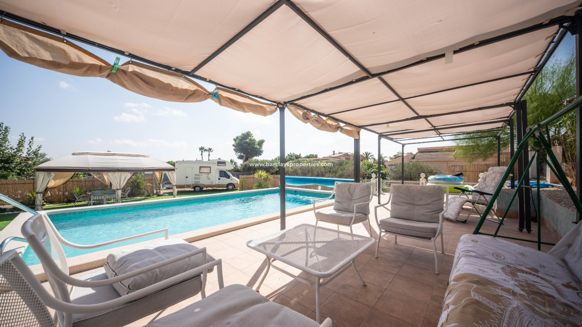 Der schöne 8 x 4 moderne Salzwasser-Pool mit Ph-System ist von verschiedenen überdachten Sitz-, Ess- und Liegebereichen umgeben, darunter ein großer Pavillon. Weitere Außenbereiche auf diesem Grundstück sind Lagerschuppen, Holzlager, Land mit verschiedenen Obstbäumen wie Oliven, Feigen, Orangen-, Zitronen- und Birnbäume.
