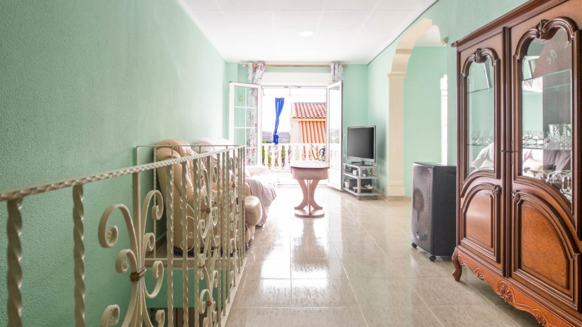 Im Esszimmer befindet sich eine weitere Treppe, die uns nach oben zu den Schlafkammern führt. Auf der rechten Seite befindet sich ein Einzelzimmer, das derzeit als begehbarer Kleiderschrank genutzt wird. Auf der linken Seite befinden sich zwei nebeneinander liegende Zimmer mit eigenem, voll ausgestattetem Bad und einem eigenen Balkon. Auf der Vorderseite befindet sich außerdem eine kleine Terrasse mit schönem Bergblick. Über eine weitere Treppe gelangen wir auf die Sonnenterrasse, die uns einen spektakulären Panoramablick auf die Landschaft und das Meer bietet. Dies ist der ideale Ort, um nach einem anstrengenden Tag mit Besichtigungen in der Umgebung mit einem eiskalten Getränk zu entspannen.