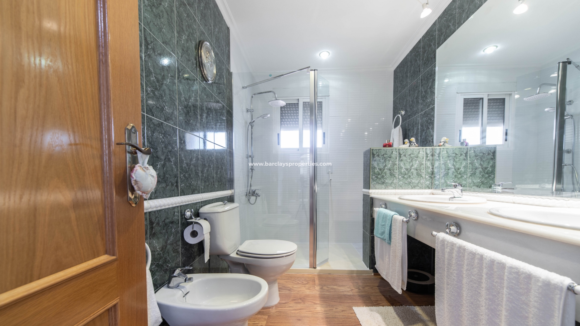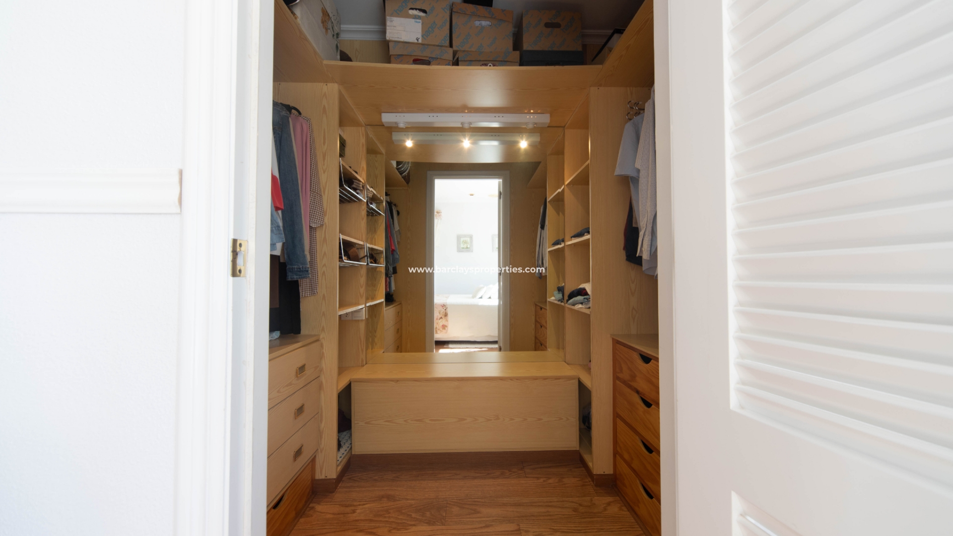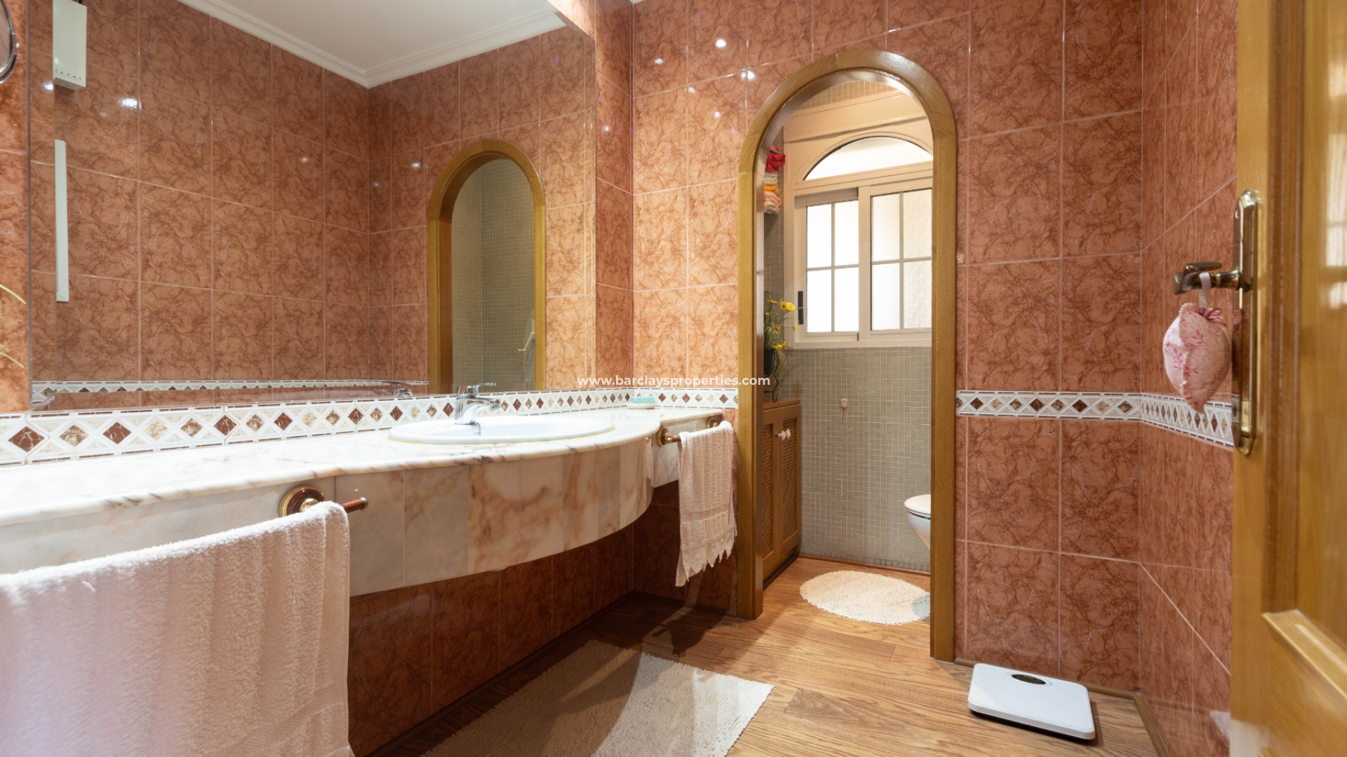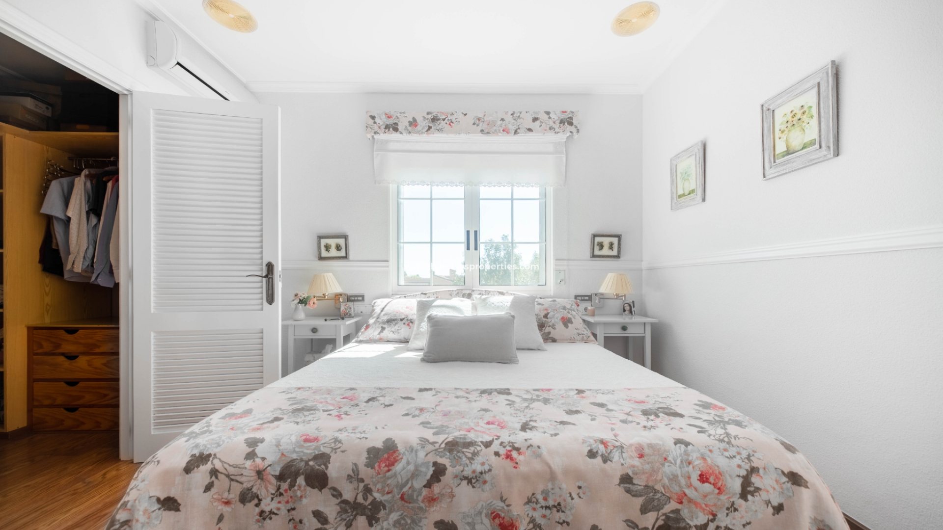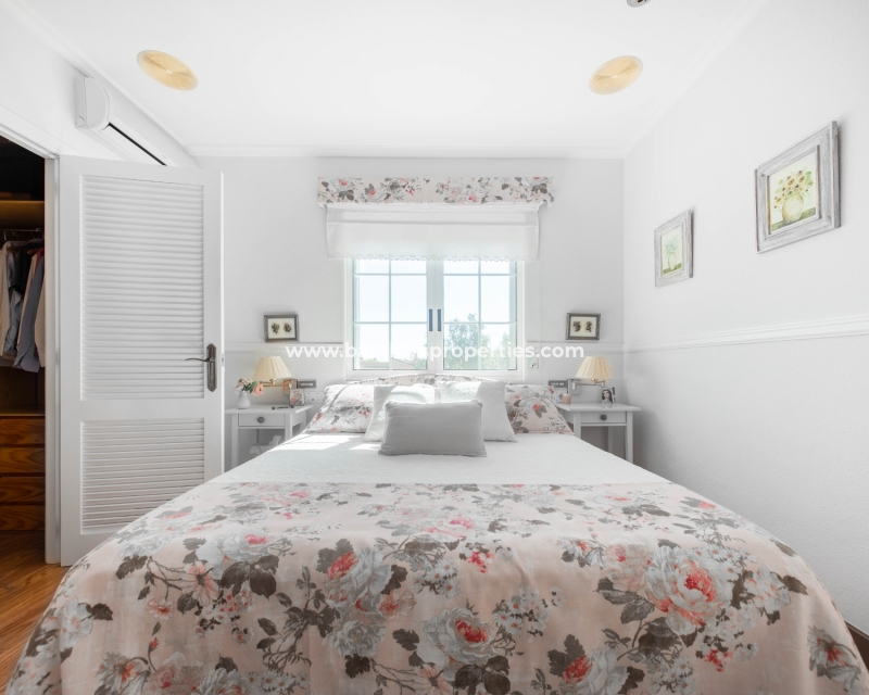 Eine Marmortreppe mit Holzgeländer und einem großen Fenster führt in den ersten Stock. Von hier aus gelangt man in einen großen Flur, der zu den restlichen Zimmern führt: ein Doppelschlafzimmer mit Spots und Einbauschränken, ein Doppelschlafzimmer mit Zugang zu einer Innenterrasse, die auch von einem weiteren Doppelschlafzimmer mit Klimaanlage und einem Ankleidezimmer betreten werden kann, ein Familienbadezimmer mit Doppelwaschbecken, Eckdusche und großem Spiegel. Direkt gegenüber dem Flur befindet sich ein weiteres großes Badezimmer. Das fünfte Schlafzimmer befindet sich im ersten Stock mit Einbauschränken.